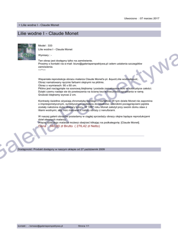 Utworzono : 07 marzec 2017 > Lilie wodne I - Claude Monet Lilie wodne I - Claude Monet Model : 333 Lilie wodne I - Claude Monet a w ty Wymiary : - Ten obraz jest dostępny tylko na zamówienie. Prosimy o kontakt via e-mail: [email protected] celem ustalenia szczegółów zamówienia. ~~*~~ k e Wspaniała reprodukcja obrazu malarza Claude Monet'a pt. "Lilie wodne". Obraz namalowany ręcznie farbami olejnymi na płótnie. Obraz o wymiarach: 90 x 60 cm. Płótno jest naciągnięte na sosnową blejtramę i posiada zamalowane boki w kolorystyce całości. Dzięki czemu nadaje sie do powieszenia na ścianę bez konieczności oprawiania w ramę. Grubość blejtramy wynosi 2 cm. p rs e P Kontrasty świetlne ożywiają chromatykę każdego z kształtów. W tym dziele Monet nie zapomina o impresjonistycznym, syntetycznym podejściu do obiektów; szerokimi pociągnięciami pędzla zostały nałożone duże obszary koloru. W 1887 roku Monet założył przy swoim domu staw z liliami wodnymi, aby móc malować z natury obrazy z nenufarami. G a i r e l a W naszej galerii obrazów posiadamy w ciągłej sprzedaży obrazy olejne będące reprodukcjami dzieł sławnych malarzy. Więcej dzieł tego malarza możesz obejrzeć klikając na podkategorię: [Claude Monet]. Cena : 340,00 zł Brutto ( 276,42 zł Netto) Dostępność: Produkt dostępny w naszym sklepie od 27 październik 2009 kontakt : - [email protected] Strona 1/1