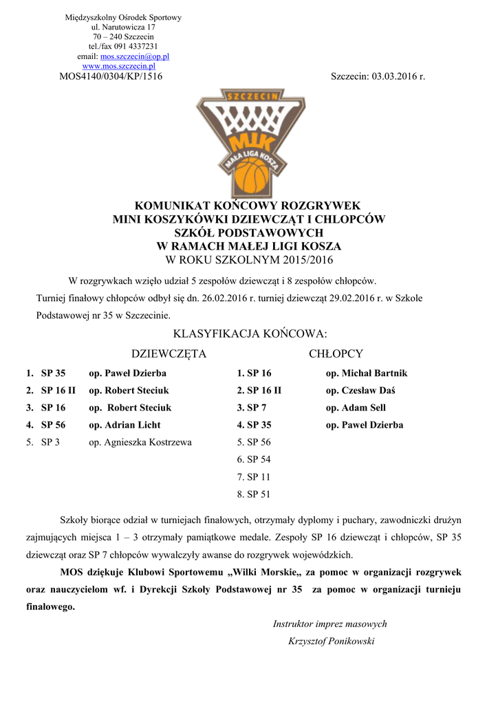 Międzyszkolny Ośrodek Sportowy ul. Narutowicza 17 70 – 240 Szczecin tel./fax 091 4337231 email: [email protected] www.mos.szczecin.pl MOS4140/0304/KP/1516 Szczecin: 03.03.2016 r. KOMUNIKAT KOŃCOWY ROZGRYWEK MINI KOSZYKÓWKI DZIEWCZĄT I CHLOPCÓW SZKÓŁ PODSTAWOWYCH W RAMACH MAŁEJ LIGI KOSZA W ROKU SZKOLNYM 2015/2016 W rozgrywkach wzięło udział 5 zespołów dziewcząt i 8 zespołów chłopców. Turniej finałowy chłopców odbył się dn. 26.02.2016 r. turniej dziewcząt 29.02.2016 r. w Szkole Podstawowej nr 35 w Szczecinie. KLASYFIKACJA KOŃCOWA: DZIEWCZĘTA CHŁOPCY 1. SP 35 op. Paweł Dzierba 1. SP 16 op. Michał Bartnik 2. SP 16 II op. Robert Steciuk 2. SP 16 II op. Czesław Daś 3. SP 16 op. Robert Steciuk 3. SP 7 op. Adam Sell 4. SP 56 op. Adrian Licht 4. SP 35 op. Paweł Dzierba 5. SP 3 op. Agnieszka Kostrzewa 5. SP 56 6. SP 54 7. SP 11 8. SP 51 Szkoły biorące odział w turniejach finałowych, otrzymały dyplomy i puchary, zawodniczki drużyn zajmujących miejsca 1 – 3 otrzymały pamiątkowe medale. Zespoły SP 16 dziewcząt i chłopców, SP 35 dziewcząt oraz SP 7 chłopców wywalczyły awanse do rozgrywek wojewódzkich. MOS dziękuje Klubowi Sportowemu ,,Wilki Morskie,, za pomoc w organizacji rozgrywek oraz nauczycielom wf. i Dyrekcji Szkoły Podstawowej nr 35 za pomoc w organizacji turnieju finałowego. Instruktor imprez masowych Krzysztof Ponikowski