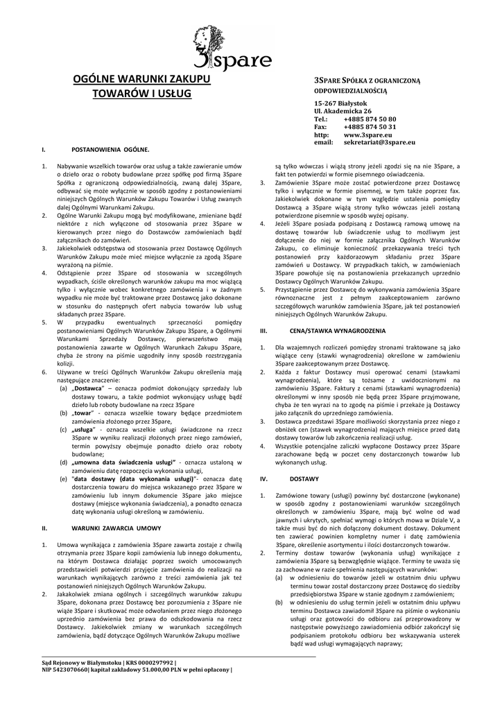 OGÓLNE WARUNKI ZAKUPU TOWARÓW I USŁUG 3SPARE SPÓŁKA Z OGRANICZONĄ ODPOWIEDZIALNOŚCIĄ 15-267 Białystok Ul. Akademicka 26 Tel.: +4885 874 50 80 Fax: +4885 874 50 31 http: www.3spare.eu email: [email protected] I. 1. 2. 3. 4. 5. 6. II. 1. 2. POSTANOWIENIA OGÓLNE. Nabywanie wszelkich towarów oraz usług a także zawieranie umów o dzieło oraz o roboty budowlane przez spółkę pod firmą 3Spare Spółka z ograniczoną odpowiedzialnością, zwaną dalej 3Spare, odbywać się może wyłącznie w sposób zgodny z postanowieniami niniejszych Ogólnych Warunków Zakupu Towarów i Usług zwanych dalej Ogólnymi Warunkami Zakupu. Ogólne Warunki Zakupu mogą być modyfikowane, zmieniane bądź niektóre z nich wyłączone od stosowania przez 3Spare w kierowanych przez niego do Dostawców zamówieniach bądź załącznikach do zamówień. Jakiekolwiek odstępstwa od stosowania przez Dostawcę Ogólnych Warunków Zakupu może mieć miejsce wyłącznie za zgodą 3Spare wyrażoną na piśmie. Odstąpienie przez 3Spare od stosowania w szczególnych wypadkach, ściśle określonych warunków zakupu ma moc wiążącą tylko i wyłącznie wobec konkretnego zamówienia i w żadnym wypadku nie może być traktowane przez Dostawcę jako dokonane w stosunku do następnych ofert nabycia towarów lub usług składanych przez 3Spare. W przypadku ewentualnych sprzeczności pomiędzy postanowieniami Ogólnych Warunków Zakupu 3Spare, a Ogólnymi Warunkami Sprzedaży Dostawcy, pierwszeństwo mają postanowienia zawarte w Ogólnych Warunkach Zakupu 3Spare, chyba że strony na piśmie uzgodniły inny sposób rozstrzygania kolizji. Używane w treści Ogólnych Warunków Zakupu określenia mają następujące znaczenie: (a) „Dostawca” – oznacza podmiot dokonujący sprzedaży lub dostawy towaru, a także podmiot wykonujący usługę bądź dzieło lub roboty budowlane na rzecz 3Spare (b) „towar” - oznacza wszelkie towary będące przedmiotem zamówienia złożonego przez 3Spare, (c) „usługa” - oznacza wszelkie usługi świadczone na rzecz 3Spare w wyniku realizacji złożonych przez niego zamówień, termin powyższy obejmuje ponadto dzieło oraz roboty budowlane; (d) „umowna data świadczenia usługi” - oznacza ustaloną w zamówieniu datę rozpoczęcia wykonania usługi, (e) "data dostawy (data wykonania usługi)”- oznacza datę dostarczenia towaru do miejsca wskazanego przez 3Spare w zamówieniu lub innym dokumencie 3Spare jako miejsce dostawy (miejsce wykonania świadczenia), a ponadto oznacza datę wykonania usługi określoną w zamówieniu. 3. 4. 5. III. 1. 2. 3. 4. IV. 1. WARUNKI ZAWARCIA UMOWY Umowa wynikająca z zamówienia 3Spare zawarta zostaje z chwilą otrzymania przez 3Spare kopii zamówienia lub innego dokumentu, na którym Dostawca działając poprzez swoich umocowanych przedstawicieli potwierdzi przyjęcie zamówienia do realizacji na warunkach wynikających zarówno z treści zamówienia jak też postanowień niniejszych Ogólnych Warunków Zakupu. Jakakolwiek zmiana ogólnych i szczególnych warunków zakupu 3Spare, dokonana przez Dostawcę bez porozumienia z 3Spare nie wiąże 3Spare i skutkować może odwołaniem przez niego złożonego uprzednio zamówienia bez prawa do odszkodowania na rzecz Dostawcy. Jakiekolwiek zmiany w warunkach szczególnych zamówienia, bądź dotyczące Ogólnych Warunków Zakupu możliwe Sąd Rejonowy w Białymstoku | KRS 0000297992 | NIP 5423070660| kapitał zakładowy 51.000,00 PLN w pełni opłacony | 2. są tylko wówczas i wiążą strony jeżeli zgodzi się na nie 3Spare, a fakt ten potwierdzi w formie pisemnego oświadczenia. Zamówienie 3Spare może zostać potwierdzone przez Dostawcę tylko i wyłącznie w formie pisemnej, w tym także poprzez fax. Jakiekolwiek dokonane w tym względzie ustalenia pomiędzy Dostawcą a 3Spare wiążą strony tylko wówczas jeżeli zostaną potwierdzone pisemnie w sposób wyżej opisany. Jeżeli 3Spare posiada podpisaną z Dostawcą ramową umowę na dostawę towarów lub świadczenie usług to możliwym jest dołączenie do niej w formie załącznika Ogólnych Warunków Zakupu, co eliminuje konieczność przekazywania treści tych postanowień przy każdorazowym składaniu przez 3Spare zamówień u Dostawcy. W przypadkach takich, w zamówieniach 3Spare powołuje się na postanowienia przekazanych uprzednio Dostawcy Ogólnych Warunków Zakupu. Przystąpienie przez Dostawcę do wykonywania zamówienia 3Spare równoznaczne jest z pełnym zaakceptowaniem zarówno szczegółowych warunków zamówienia 3Spare, jak też postanowień niniejszych Ogólnych Warunków Zakupu. CENA/STAWKA WYNAGRODZENIA Dla wzajemnych rozliczeń pomiędzy stronami traktowane są jako wiążące ceny (stawki wynagrodzenia) określone w zamówieniu 3Spare zaakceptowanym przez Dostawcę. Każda z faktur Dostawcy musi operować cenami (stawkami wynagrodzenia), które są tożsame z uwidocznionymi na zamówieniu 3Spare. Faktury z cenami (stawkami wynagrodzenia) określonymi w inny sposób nie będą przez 3Spare przyjmowane, chyba że ten wyrazi na to zgodę na piśmie i przekaże ją Dostawcy jako załącznik do uprzedniego zamówienia. Dostawca przedstawi 3Spare możliwości skorzystania przez niego z obniżek cen (stawek wynagrodzenia) mających miejsce przed datą dostawy towarów lub zakończenia realizacji usług. Wszystkie potencjalne zaliczki wypłacone Dostawcy przez 3Spare zarachowane będą w poczet ceny dostarczonych towarów lub wykonanych usług. DOSTAWY Zamówione towary (usługi) powinny być dostarczone (wykonane) w sposób zgodny z postanowieniami warunków szczególnych określonych w zamówieniu 3Spare, mają być wolne od wad jawnych i ukrytych, spełniać wymogi o których mowa w Dziale V, a także musi być do nich dołączony dokument dostawy. Dokument ten zawierać powinien kompletny numer i datę zamówienia 3Spare, określenie asortymentu i ilości dostarczonych towarów. Terminy dostaw towarów (wykonania 