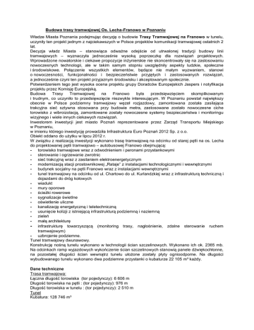 Budowa trasy tramwajowej Os. Lecha-Franowo w Poznaniu Władze Miasta Poznania podejmując decyzję o budowie Trasy Tramwajowej na Franowo w tunelu, uczyniły ten projekt jednym z najciekawszych w Polsce projektów komunikacji tramwajowej ostatnich 2 lat. Decyzja władz Miasta – stanowiąca odważne odejście od utrwalonej tradycji budowy linii tramwajowych – wyznaczyła jednocześnie wysoką poprzeczkę dla rozwiązań projektowych. Wprowadzone nowatorskie i ciekawe propozycje inżynierskie nie skoncentrowały się na zastosowaniu nowoczesnych technologii, ale w takim samym stopniu uwzględniły aspekty ludzkie, społeczne i środowiskowe. Połączenie wszystkich elementów, będące nie małym wyzwaniem, stanowi o nowoczesności, funkcjonalności i bezpieczeństwie przyjętych i zastosowanych rozwiązań, a jednocześnie czyni ten projekt przyjaznym środowisku i akceptowanym społecznie. Potwierdzeniem tego jest wysoka ocena projektu grupy Doradców Europejskich Jaspers i notyfikacja projektu przez Komisję Europejską. Budowa Trasy Tramwajowej na Franowo była przedsięwzięciem skomplikowanym i trudnym, co uczyniło to przedsięwzięcie niezwykle interesującym. W Poznaniu powstał największy obecnie w Polsce podziemny tramwajowy węzeł rozjazdowy, zamontowana została zasilająca trakcyjna sieć sztywna stosowana przy budowie metra, zastosowane zostało nowoczesne ciche torowisko z wibroizolacją, zamontowane zostały nowoczesne systemy bezpieczeństwa i monitoringu wizyjnego i wiele innych ciekawych rozwiązań. Inwestorem inwestycji jest miasto Poznań reprezentowane przez Zarząd Transportu Miejskiego w Poznaniu, w imieniu którego inwestycję prowadziła Infrastruktura Euro Poznań 2012 Sp. z o.o. Obiekt oddano do użytku w lipcu 2012 r. W związku z realizacją inwestycji wykonano trasę tramwajową na odcinku od starej pętli na os. Lecha do projektowanej pętli tramwajowo – autobusowej Franowo obejmującą: - torowisko tramwajowe wraz z odwodnieniem i peronami przystankowymi - sterowanie i ogrzewanie zwrotnic - sieć trakcyjną wraz z zasilaniem elektroenergetycznym - modernizacją stacji prostownikowej „Rataje” z instalacjami technologicznymi i wewnętrznymi - budynek socjalny na pętli Franowo wraz z instalacjami wewnętrznymi - tunel tramwajowy na odcinku od ul. Chartowo do ul. Kurlandzkiej wraz z infrastrukturą techniczną i dojazdami do dróg kołowych - wiadukt - mury oporowe - ścieżki rowerowe - sygnalizacje świetlne - oświetlenie uliczne - kanalizację energetyczną i teletechniczną - usunięcie kolizji z istniejącą infrastrukturą podziemną i naziemną - zieleń - małą architekturę - infrastrukturę towarzyszącą (monitoring trasy, nagłośnienie, zdalne sterowanie ruchem tramwajowym) - uzbrojenie podziemne. Tunel tramwajowy dwunawowy. Konstrukcję nośną tunelu wykonano w technologii ścian szczelinowych. Wykonano ich ok. 2365 mb. Na odcinkach ramp wyjazdowych wykończenie ścian szczelinowych stanowią panele dźwiękochłonne, na pozostałej długości ścian wewnątrz tunelu ułożone zostały płyty ognioodporne. Na długości wybudowanego tunelu wykonano dwa podziemne przystanki o kubaturze 22 105 m³ każdy. Dane techniczne Trasa tramwajowa: Łączna długość torowiska (tor pojedynczy): 6 606 m Długość torowiska na pętli : (tor pojedynczy): 976 m Długość torowiska w tunelu : (tor pojedynczy): 2 510 m Tunel Kubatura: 128 746 m³ Długość: 1 067 m Szerokość: 10,40 m Wysokość: 5 m Projekt współfinansowany przez Unię Europejską z Europejskiego Funduszu Rozwoju Regionalnego w ramach Wielkopolskiego Regionalnego Programu Operacyjnego (WRPO) na lata 2007-2013, Działanie 2.5 – Rozwój miejskiego transportu zbiorowego. Wartość projektu wynosi 261 381 170 PLN z czego kwota dofinansowania z WRPO stanowi 99 873 043,23 PLN.