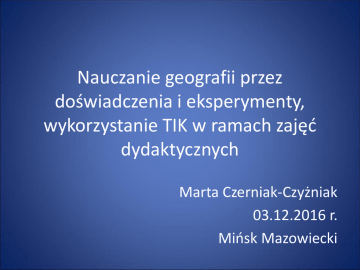 Nauczanie geografii przez doświadczenia i eksperymenty, wykorzystanie TIK w ramach zajęć dydaktycznych Marta Czerniak-Czyżniak 03.12.2016 r. Mińsk Mazowiecki Terenowe metody badawcze: obserwację terenową, dokumentację fotograficzną, kartowanie geomorfologiczne, wywiady, pomiary form terenu. Klasyfikacja terenowych metod badawczych: metody obserwacyjno - dokumentacyjne; metody wywiadu i metody ankietowe; kartowanie; metody pomiarowe. Metody ilościowe metody opisu statystycznego: metody najprostsze, wartości bezwzględne (tona, kilometry), używamy średnich, mediana, modalna metody wnioskowania statystycznego: metody bardziej złożone operacje matematyczne, przeliczanie, metoda współzależności, metoda korelacji i regresji - badamy siłę związków zachodzących miedzy zjawiskami metody modelowania matematycznego: zaawansowane metody, dokonujemy symulacji oraz optymalizacji czyli próbujemy znaleźć pożądany model rozwojowy Metody Jakościowe metoda kartograficzna: podstawa w geografii metoda monograficzna: uporządkowany opis zjawisk, może zawierać metodę kartograficzną metoda badan terenowych metoda porównawcza: wnioskowanie przez analogie (bardzo często stosowana) metoda genetyczno-historyczna: daje możliwość określenia warunków i czynników, które przyczyniły się do rozwoju danego zjawiska metoda modelowa: porównujemy naszą rzeczywistość z modelem np. matematycznym lub opisowym. Skala mapy „Proszę Pani, to SIĘ WYDŁUŻYŁO…” wypowiedź uczennicy drugiej klasy technikum Mierzenie długości cienia … Azymut i orientacja w terenie Obserwacje meteorologiczne … Obserwacje meteorologiczne … Badanie gleby … METODOLOGIA BADAŃ W GEOGRAFII SPOŁECZNO-EKONOMICZNEJ Metody badawcze w geografii społeczno-ekonomicznej opis statystyczny, typologia, klasyfikacja, regionalizacja, struktura i hierarchia w badaniach geograficznych, badania współzależności, analiza regresji, dynamika zjawisk masowych. Charakterystyka społeczeństwa Bezrobocie Zróżnicowanie kulturowe Migracje Stare czy młode Znaczenie komunikacji… Rodzaje i dostępność usług Outdoor education Dlaczego warto prowadzić zajęcia terenowe? Czego chciałabym się dowiedzie? Co chciałaby m umieć? • Z czym zaczynam i dokąd zmierzam? • Jak organizować Na czym się zajęcia w naturze? skupić, aby to Struktura zajęć terenowych osiągnąć? (zasady, zadanie, animacja, integracja procesu, narzędzia) • Jak prowadzić zajęcia w naturze? Przykład zajęć terenowych (zasady, podział, zadanie) • Z czym kończę, dokąd dotarłem ? Ewaluacja (omówienie) Jak organizować zajęcia? STRUKTURA ZAJĘĆ TERENOWYCH 1 • ZASADY – określą granice oraz stworzą bezpieczne warunki eksploracji i eksperymentowania. • ZADANIE DO WYKONANIA – daj młodzieży jedno 2 3 zadanie otwarte które da im możliwość eksploracji przyrody wieloma zmysłami, a środowiska z różnych stron • ANIMOWANIE ZAJĘĆ – Oprzyj prace na 6 zasadach: Daj sobie czasem prawo do niewiedzy, ucz się razem z uczniami, nie instruuj tylko inspiruj, obserwuj, słuchaj, pytaj, nie dawaj gotowych rozwiązań. 4 • INTEGRACJA PROCESU KSZTAŁCENIA – Przenieś doświadczenia z zajęć terenowych do klasy szkolnej. 5 • NARZĘDZIA PRACY – korzystaj z nowych narzędzi pracy ZASADY • Zacznij zajęcia od przedstawienia uczestnikom zasad. Pozwoli ci to: Uniknąć nieustannego upominania i pouczania dzieci. • Przedstaw je w formie równoważników zdań: Określ czego niewolno nam robić Określ co można • Nie twórz dużo zasad bo nikt ich nie będzie pamiętać. • Pamiętaj zasady powinny dotyczyć: Bezpieczeństwa Relacji społecznych Przyrody ZADANIE DO WYKONANIA • Nie projektuj przebiegu zajęć terenowych. • Daj uczniom jedno zadanie do wykonania. Pamiętaj Mniej znaczy bardzo często Więcej. • Przygotowując zadanie pamiętaj, że powinno ono dawać uczniom okazję do: Poznawania przyrody wieloma zmysłami. Poszukiwania wiedzy a nie jej opanowywania. Rozwijania umiejętności interpersonalnych oraz intrapersonalnych. Odwoływać się do podstawy programowej, tematu zajęć tygodniowych. NIE INSTRUUJ TYLKO INSPIRUJ ANIMOWANIE ZAJĘĆ Używaj aktywnego słuchania aby otworzyć dialog Zadawaj pytania otwarte (jaki, dlaczego, jak to rozumiesz, co proponujesz, jak uważasz itp.) DAJ SOBIE CZASEM PRAWO DO NIEWIEDZY UCZ SIĘ RAZEM Z UCZNIAMI NIE DAWAJ GOTOWYCH ROZWIĄZAŃ Ucz nowych rodzajów wiedzy „Know why, Know who, Know where” Ucz operacjonalizacji wiedzy OBSERWACJA UCZNIÓW TO KLUCZ DO ZMIANY EDUKACJI Naucz się być z uczniami a nie nimi zarządzać Nie posługuj się etykietami - Ucz się ich poznawać na nowo każdego dnia INTEGRACJA PROCESU KSZTAŁCENIA • Przenieś doświadczenia z zajęć terenowych do klasy szkolnej: • w procesie dydaktycznym ; • w procesie wychowawczym; • w systemie oceniania. NARZĘDZIA PRACY • Dziennik obserwacji • Dziennik kształtujący • Narzędzia przyrodnicze Jedno uderzenie skrzydeł motyla może wywołać huragan Nad Wisła … „Codziennie przejeżdżam Wisłę, ale nad Wisłą jeszcze nigdy nie byłem” wypowiedź ucznia pierwszej klasy technikum cd nad Wisłą… Czarne krzemienie nad Wisłą Do najważniejszych umiejętności zdobywanych przez ucznia w trakcie kształcenia ogólnego (…) należą: 1) Czytanie – umiejętność rozumienia (…) i refleksyjnego przetwarzania tekstów (…) 2) Myślenie matematyczne – umiejętność wykorzystania narzędzi matematyki w życiu codziennym (…) 3) Myślenie naukowe – umiejętność wykorzystania wiedzy o charakterze naukowym (…) 4) Umiejętność komunikowania się w języku ojczystym i w językach obcych, zarówno w mowie jak i w piśmie 5) Umiejętność sprawnego posługiwania się nowoczesnymi technologiami informacyjno-komunikacyjnymi 6) Umiejętność wyszukiwania, selekcjonowania i krytycznej analizy informacji 7) Umiejętność rozpoznawania własnych potrzeb edukacyj