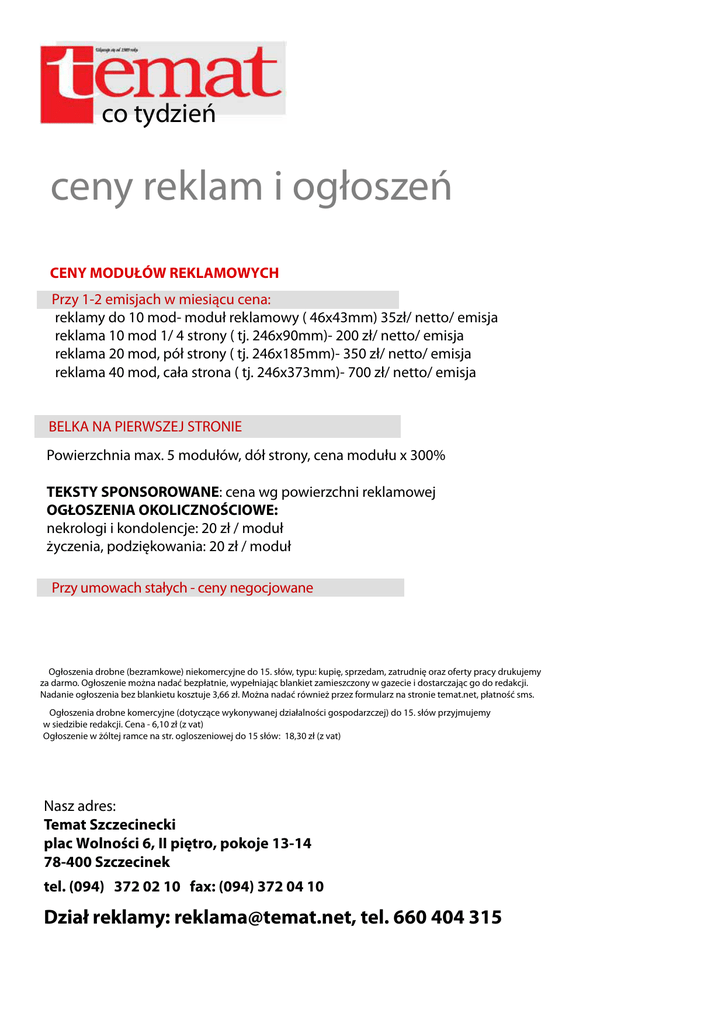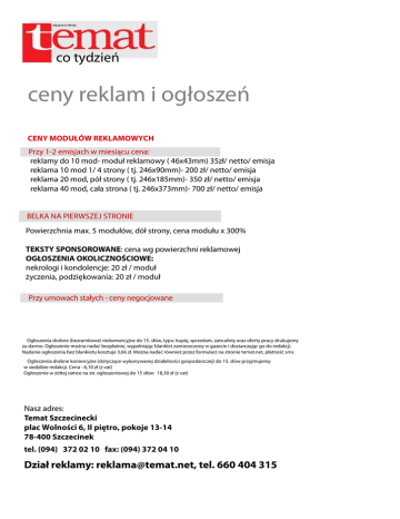 co tydzień ceny reklam i ogłoszeń CENY MODUŁÓW REKLAMOWYCH Przy 1-2 emisjach w miesiącu cena: reklamy do 10 mod- moduł reklamowy ( 46x43mm) 35zł/ netto/ emisja reklama 10 mod 1/ 4 strony ( tj. 246x90mm)- 200 zł/ netto/ emisja reklama 20 mod, pół strony ( tj. 246x185mm)- 350 zł/ netto/ emisja reklama 40 mod, cała strona ( tj. 246x373mm)- 700 zł/ netto/ emisja BELKA NA PIERWSZEJ STRONIE Powierzchnia max. 5 modułów, dół strony, cena modułu x 300% TEKSTY SPONSOROWANE: cena wg powierzchni reklamowej OGŁOSZENIA OKOLICZNOŚCIOWE: nekrologi i kondolencje: 20 zł / moduł życzenia, podziękowania: 20 zł / moduł Przy umowach stałych - ceny negocjowane Ogłoszenia drobne (bezramkowe) niekomercyjne do 15. słów, typu: kupię, sprzedam, zatrudnię oraz oferty pracy drukujemy za darmo. Ogłoszenie można nadać bezpłatnie, wypełniając blankiet zamieszczony w gazecie i dostarczając go do redakcji. Nadanie ogłoszenia bez blankietu kosztuje 3,66 zł. Można nadać również przez formularz na stronie temat.net, płatność sms. Ogłoszenia drobne komercyjne (dotyczące wykonywanej działalności gospodarzczej) do 15. słów przyjmujemy w siedzibie redakcji. Cena - 6,10 zł (z vat) Ogłoszenie w żóltej ramce na str. ogloszeniowej do 15 słów: 18,30 zł (z vat) Nasz adres: Temat Szczecinecki plac Wolności 6, II piętro, pokoje 13-14 78-400 Szczecinek tel. (094) 372 02 10 fax: (094) 372 04 10 Dział reklamy: [email protected], tel. 660 404 315