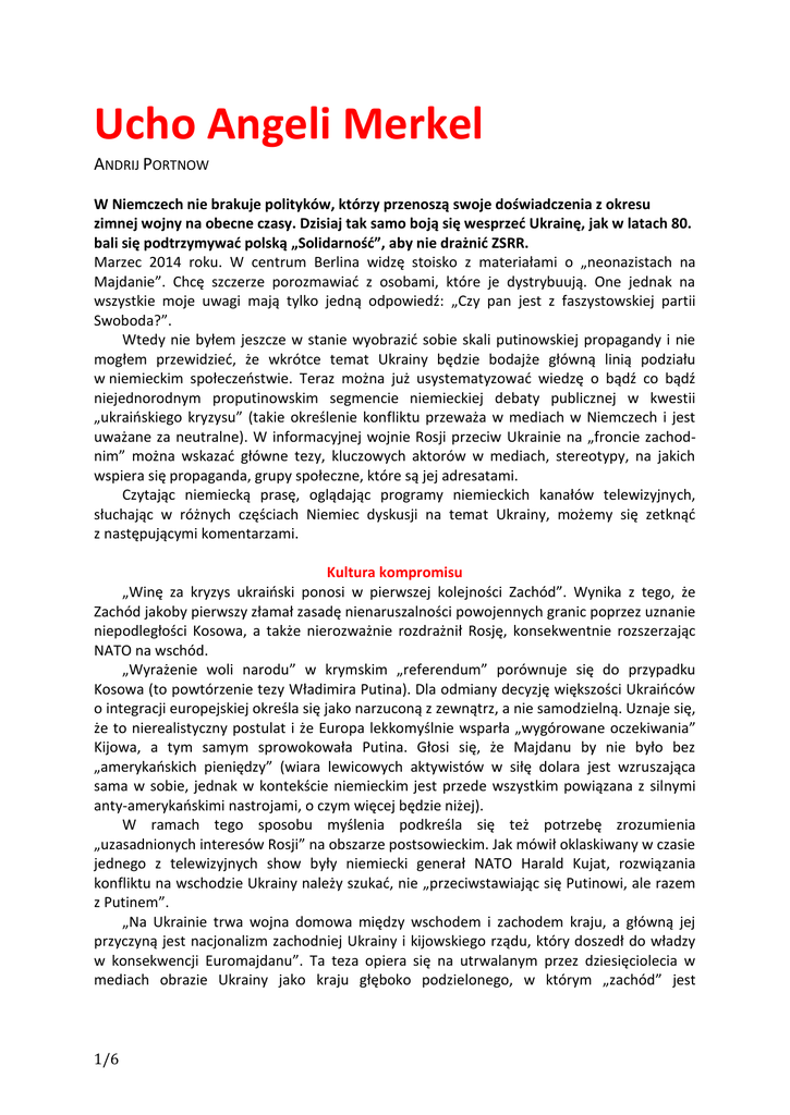 Ucho Angeli Merkel ANDRIJ PORTNOW W Niemczech nie brakuje polityków, którzy przenoszą swoje doświadczenia z okresu zimnej wojny na obecne czasy. Dzisiaj tak samo boją się wesprzeć Ukrainę, jak w latach 80. bali się podtrzymywać polską „Solidarność”, aby nie drażnić ZSRR. Marzec 2014 roku. W centrum Berlina widzę stoisko z materiałami o „neonazistach na Majdanie”. Chcę szczerze porozmawiać z osobami, które je dystrybuują. One jednak na wszystkie moje uwagi mają tylko jedną odpowiedź: „Czy pan jest z faszystowskiej partii Swoboda?”. Wtedy nie byłem jeszcze w stanie wyobrazić sobie skali putinowskiej propagandy i nie mogłem przewidzieć, że wkrótce temat Ukrainy będzie bodajże główną linią podziału w niemieckim społeczeństwie. Teraz można już usystematyzować wiedzę o bądź co bądź niejednorodnym proputinowskim segmencie niemieckiej debaty publicznej w kwestii „ukraińskiego kryzysu” (takie określenie konfliktu przeważa w mediach w Niemczech i jest uważane za neutralne). W informacyjnej wojnie Rosji przeciw Ukrainie na „froncie zachodnim” można wskazać główne tezy, kluczowych aktorów w mediach, stereotypy, na jakich wspiera się propaganda, grupy społeczne, które są jej adresatami. Czytając niemiecką prasę, oglądając programy niemieckich kanałów telewizyjnych, słuchając w różnych częściach Niemiec dyskusji na temat Ukrainy, możemy się zetknąć z następującymi komentarzami. Kultura kompromisu „Winę za kryzys ukraiński ponosi w pierwszej kolejności Zachód”. Wynika z tego, że Zachód jakoby pierwszy złamał zasadę nienaruszalności powojennych granic poprzez uznanie niepodległości Kosowa, a także nierozważnie rozdrażnił Rosję, konsekwentnie rozszerzając NATO na wschód. „Wyrażenie woli narodu” w krymskim „referendum” porównuje się do przypadku Kosowa (to powtórzenie tezy Władimira Putina). Dla odmiany decyzję większości Ukraińców o integracji europejskiej określa się jako narzuconą z zewnątrz, a nie samodzielną. Uznaje się, że to nierealistyczny postulat i że Europa lekkomyślnie wsparła „wygórowane oczekiwania” Kijowa, a tym samym sprowokowała Putina. Głosi się, że Majdanu by nie było bez „amerykańskich pieniędzy” (wiara lewicowych aktywistów w siłę dolara jest wzruszająca sama w sobie, jednak w kontekście niemieckim jest przede wszystkim powiązana z silnymi anty-amerykańskimi nastrojami, o czym więcej będzie niżej). W ramach tego sposobu myślenia podkreśla się też potrzebę zrozumienia „uzasadnionych interesów Rosji” na obszarze postsowieckim. Jak mówił oklaskiwany w czasie jednego z telewizyjnych show były niemiecki generał NATO Harald Kujat, rozwiązania konfliktu na wschodzie Ukrainy należy szukać, nie „przeciwstawiając się Putinowi, ale razem z Putinem”. „Na Ukrainie trwa wojna domowa między wschodem i zachodem kraju, a główną jej przyczyną jest nacjonalizm zachodniej Ukrainy i kijowskiego rządu, który doszedł do władzy w konsekwencji Euromajdanu”. Ta teza opiera się na utrwalanym przez dziesięciolecia w mediach obrazie Ukrainy jako kraju głęboko podzielonego, w którym „zachód” jest 1/6 proeuropejski (i jednocześnie ultranacjonalistyczny), „wschód” – prorosyjski lub po prostu rosyjski. Ukrainę opisuje się przy tym jako niepełnowartościowe państwo, przypadkowy produkt rozpadu ZSRR, kraj bez historyczno-kulturowej podmiotowości, który jest jedynie polem, gdzie ścierają się prawdziwe międzynarodowe potęgi. Mówi się o „wojnie domowej”, a na drugi plan, czy też w ogóle poza obszar zainteresowania, odsuwa się sprawę otwartej rosyjskiej agresji wojskowej. W tym kontekście porównuje się Ukrainę z Czechosłowacją (w podtekście brzmi sugestia, że podział kraju byłby pożądany) i dyskutuje o zaletach federalizacji. Pomija się to, że separatyści zajęli bardzo mały fragment kraju -mówi się o wojnie „na wschodzie”, a nie w małej części Donbasu. „Rosjanie i język rosyjski na Ukrainie potrzebują ochrony, zwłaszcza w regionach, gdzie Rosjanie stanowią większość”. Zdanie, które na pozór brzmi jak słuszny europejski postulat, w związku z brakiem wiedzy o rzeczywistej sytuacji i polityce językowej Ukrainy sprowadza się do uznania strategicznie ważnego dla putinowskiej propagandy postulatu utożsamienia rosyjskojęzyczności z rosyjską tożsamością i prorosyjską lojalnością polityczną. Niemieckie media regularnie publikują mapy „językowo-narodowościowych stref” Ukrainy, które nie uwzględniają ani ukraińskiego bilingwizmu, ani jego społecznego wymiaru (rosyjskojęzyczności wielkich miast, ukraińskojęzyczności obszarów wiejskich). Z tego właśnie wynika teza o regionach z „rosyjską większością”. 23 sierpnia 2014 roku w wywiadzie dla „Welt am Sonntag” wicekanclerz Sigmar Gabriel z przekonaniem oświadczył, że Ukraina może zachować integralność terytorialną, tylko gdy zaproponuje federalizację „obszarom z rosyjską większością” (Gebieten mit russischer Mehrheit). „Niemcy muszą uniknąć kolejnej wojny, zwłaszcza gdy w grę wchodzi zagrożenie użyciem broni atomowej”. A ceną pokoju mają być ustępstwa wobec Putina, demonstrowanie dobrych zamiarów. To myślenie opiera się na europejskiej kulturze kompromisu. Nie uwzględnia ono faktu, że przejawy niezdecydowania i słabości na pewno zachęcą prezydenta Rosji do kontynuowania agresji i eskalowania konfliktu. Istnieje także strach przed nieprzewidywalną hipotetyczną „Rosją bez Putina”. Ta obawa determinuje stanowisko, że Putinowi trzeba umożliwić „znalezienie godnego wyjścia z sytuacji” przy minimalnych stratach dla jego wizerunku (nie uwzględnia jednak rozmiarów rozpętanej w Rosji propagandy wojny i mocarstwa „wstającego z kolan”, poszerzającego „ swoje terytorium i strefy wpływów). „Nie możn