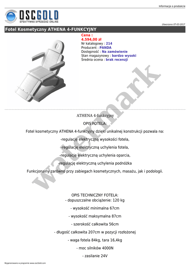 Informacje o produkcie Utworzono 07-03-2017 Fotel Kosmetyczny ATHENA 4-FUNKCYJNY Cena : 4.594,00 zł er m ar k Nr katalogowy : 214 Producent : PANDA Dostępność : Na zamówienie Stan magazynowy : bardzo wysoki Średnia ocena : brak recenzji ATHENA 4-funkcyjny OPIS FOTELA: Fotel kosmetyczny ATHENA 4-funkcyjny dzięki unikalnej konstrukcji pozwala na: -regulację elektryczną wysokości fotela, -regulację elektryczną uchylenia fotela, at -regulację elektryczną uchylenia oparcia, -regulację elektryczną uchylenia podnóżka w Funkcjonalny zarówno przy zabiegach kosmetycznych, masażu, jak i podologii. OPIS TECHNICZNY FOTELA: - dopuszczalne obciążenie: 120 kg - wysokość minimalna 67cm - wysokość maksymalna 87cm - szerokość całkowita 56cm - długość całkowita 207cm w pozycji rozłożonej - waga fotela 84kg, tara 16,4kg - moc silników 4000N - zasilanie 24V Wygenerowano w programie www.oscGold.com Fotel dostępny w bogatej gamie kolorystycznej. Cena: 4594 zł Dostępne opcje Fotel Kosmetyczny ATHENA 4-FUNKCYJNY w at er m ar k OBICIE: SKAJ BASIC, SKAJ BUSINESS (+211,56 zł), SKAJ EXCLUSIVE (+423,12 zł).
