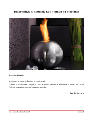 Biokominek w kształcie kuli / lampa na bioetanol Szanowny Kliencie, dziękujemy za zakup biokominka w kształcie kuli. Prosimy o przeczytanie instrukcji i przestrzeganie podanych wskazówek i porad, aby mogli Państwo optymalnie korzystać z nowego produktu. Pearl24 Sp. z o. o. Biokominek w kształcie kuli Strona 1 Zawartość zestawu: • Pojemnik ze stali nierdzewnej • Palnik • Pokrywa • Instrukcja obsługi. Użytkowanie 1. Biokominek należy ustawić na stabilnej i płaskiej powierzchni. 2. Palnik należy wypełnić bioetanolem, przy pomocy lejka – maksymalnie do 2 cm poniżej górnej krawędzi. 3. Następnie należy zapalić ogień. UWAGA! Konwencjonalne zapalniczki i zapałki nie nadają się do rozpalania ognia w biokominku. ISTNIEJE NIEBEZPIECZEŃSTWO POPARZENIA! Biokominek w kształcie kuli Strona 2 Bezpieczeństwo • Niniejsza instrukcja ma na celu zapoznanie Państwa z zasadami prawidłowego korzystania z produktu. Zaleca się przechowywanie instrukcji w łatwo dostępnym miejscu, aby w razie potrzeby mogli Państwo zweryfikować informacje. • Wszelkie modyfikacje produktu obniżają poziom jego bezpieczeństwa. UWAGA! Istnieje ryzyko obrażeń! • Zaleca się ostrożne obchodzenie się z produktem. Produkt może ulec uszkodzeniu w wyniku uderzenia, wstrząsów lub upadku nawet z niewielkiej wysokości. • Nie należy używać biokominka na zewnątrz lub w miejscach, w których występuje przeciąg. • Biokominek należy ustawić na płaskiej, stabilnej i ognioodpornej powierzchni. • Produkt należy trzymać z dala od materiałów łatwopalnych. Należy zachować odpowiednią odległość od innych przedmiotów – minimum 0,5 metra. • Pomieszczenie,w którym ma zostać umieszczony biokominek powinno mieć co najmniej 25 m³ objętości. • Nie należy używać biokominka jako grzejnika. • Biokominek nie powinien być używany w sposób ciągły. • Spalanie bioetanolu powoduje produkowanie wody i dwutlenku węgla, dlatego należy regularnie wietrzyć pomieszczenie. • Nie należy pozostawić biokominka bez nadzoru. • Produkt należy trzymać z miejscu niedostępnym dla dzieci. • Jeśli biokominek nie jest używany, należy położyć pokrywę. • Nie należy trzymać dłoni nad biokominkiem! Istnieje ryzyko poparzenia! • Nie należy używać etanolu ze stacji benzynowych, ponieważ jest zbyt silny i ma nieprzyjemny zapach. • Nie należy wlewać bioetanolu do płonącego ognia! • Nie należy stawiać pojemnika z bioetanolem obok biokominka. • Aby ponownie napełnić biokominek etanolem należy poczekać, aż palenisko ostygnie. W przeciwnym razie istnieje ryzyko samozapłonu. • Należy zapalić biokominek niezwłocznie po napełnieniu bioetanolem. • Jeśli paliwo wycieka, należy je zebrać suchą ściereczką. Ściereczkę należy natychmiast wystawić poza mieszkanie. Biokominek w kształcie kuli Strona 3 • Jeśli pomimo wszystkich środków ostrożności wystąpi pożar, należy użyć tylko pianki lub stałej gaśnicy. Woda nie ugasi pożaru! • Jeśli nie ma możliwości ugaszenia pożaru gaśnicą należy stłumić ogień piaskiem lub kocem gaśniczym. UWAGA! Bioetanol podczas przechowywania lub w wysokiej temperaturze może wejść w reakcję z tlenem i utworzyć wybuchowy gaz. Konwencjonalne zapalniczki i zapałki nie nadają się do rozpalania ognia w biokominku. ISTNIEJE NIEBEZPIECZEŃSTWO POPARZENIA! • Nie należy stawiać obok biokominka dekoracji. Należy zachować odpowiednią odległość. Biokominek w kształcie kuli Strona 4