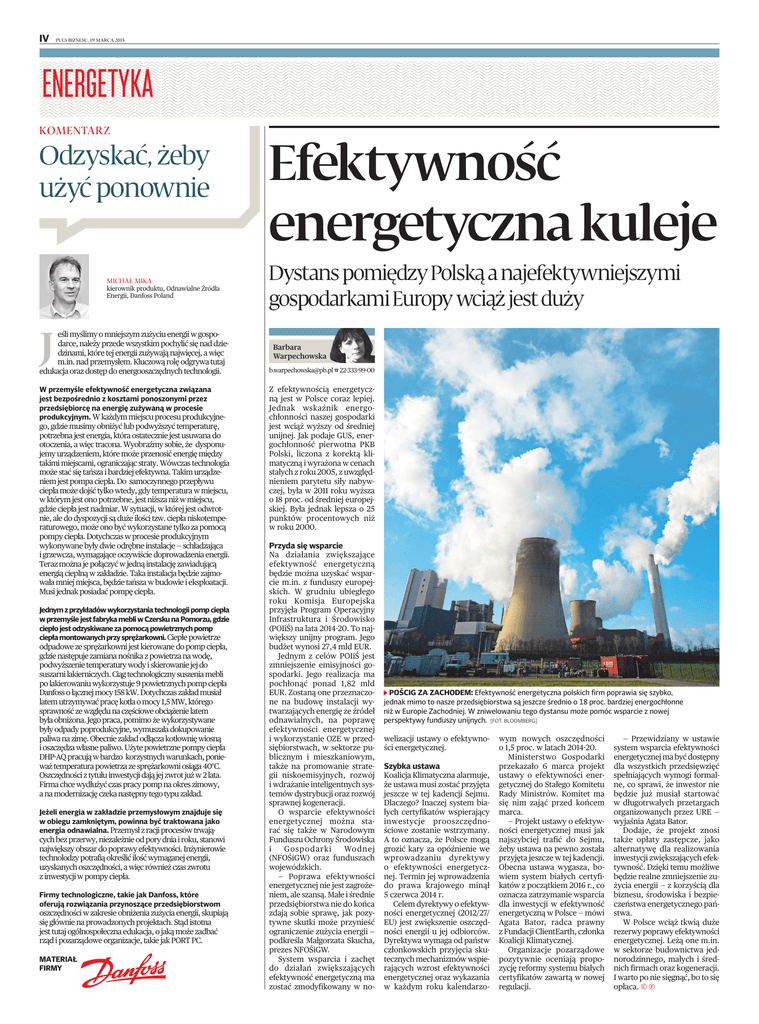 IV PULS BIZNESU, 19 MARCA 2015 ENERGETYKA KOMENTARZ Odzyskać, żeby użyć ponownie MICHAŁ MIKA kierownik produktu, Odnawialne Źródła Energii, Danfoss Poland J eśli myślimy o mniejszym zużyciu energii w gospodarce, należy przede wszystkim pochylić się nad dziedzinami, które tej energii zużywają najwięcej, a więc m.in. nad przemysłem. Kluczową rolę odgrywa tutaj edukacja oraz dostęp do energooszczędnych technologii. W przemyśle efektywność energetyczna związana jest bezpośrednio z kosztami ponoszonymi przez przedsiębiorcę na energię zużywaną w procesie produkcyjnym. W każdym miejscu procesu produkcyjnego, gdzie musimy obniżyć lub podwyższyć temperaturę, potrzebna jest energia, która ostatecznie jest usuwana do otoczenia, a więc tracona. Wyobraźmy sobie, że dysponujemy urządzeniem, które może przenosić energię między takimi miejscami, ograniczając straty. Wówczas technologia może stać się tańsza i bardziej efektywna. Takim urządzeniem jest pompa ciepła. Do samoczynnego przepływu ciepła może dojść tylko wtedy, gdy temperatura w miejscu, w którym jest ono potrzebne, jest niższa niż w miejscu, gdzie ciepła jest nadmiar. W sytuacji, w której jest odwrotnie, ale do dyspozycji są duże ilości tzw. ciepła niskotemperaturowego, może ono być wykorzystane tylko za pomocą pompy ciepła. Dotychczas w procesie produkcyjnym wykonywane były dwie odrębne instalacje — schładzająca i grzewcza, wymagające oczywiście doprowadzenia energii. Teraz można je połączyć w jedną instalację zawiadującą energią cieplną w zakładzie. Taka instalacja będzie zajmowała mniej miejsca, będzie tańsza w budowie i eksploatacji. Musi jednak posiadać pompę ciepła. Jednym z przykładów wykorzystania technologii pomp ciepła w przemyśle jest fabryka mebli w Czersku na Pomorzu, gdzie ciepło jest odzyskiwane za pomocą powietrznych pomp ciepła montowanych przy sprężarkowni. Ciepłe powietrze odpadowe ze sprężarkowni jest kierowane do pomp ciepła, gdzie następuje zamiana nośnika z powietrza na wodę, podwyższenie temperatury wody i skierowanie jej do suszarni lakierniczych. Ciąg technologiczny suszenia mebli po lakierowaniu wykorzystuje 9 powietrznych pomp ciepła Danfoss o łącznej mocy 158 kW. Dotychczas zakład musiał latem utrzymywać pracę kotła o mocy 1,5 MW, którego sprawność ze względu na częściowe obciążenie latem była obniżona. Jego praca, pomimo że wykorzystywane były odpady poprodukcyjne, wymuszała dokupowanie paliwa na zimę. Obecnie zakład odłącza kotłownię wiosną i oszczędza własne paliwo. Użyte powietrzne pompy ciepła DHP-AQ pracują w bardzo korzystnych warunkach, ponieważ temperatura powietrza ze sprężarkowni osiąga 40°C. Oszczędności z tytułu inwestycji dają jej zwrot już w 2 lata. Firma chce wydłużyć czas pracy pomp na okres zimowy, a na modernizację czeka następny tego typu zakład. Jeżeli energia w zakładzie przemysłowym znajduje się w obiegu zamkniętym, powinna być traktowana jako energia odnawialna. Przemysł z racji procesów trwających bez przerwy, niezależnie od pory dnia i roku, stanowi największy obszar do poprawy efektywności. Inżynierowie technolodzy potrafią określić ilość wymaganej energii, uzyskanych oszczędności, a więc również czas zwrotu z inwestycji w pompy ciepła. Firmy technologiczne, takie jak Danfoss, które oferują rozwiązania przynoszące przedsiębiorstwom oszczędności w zakresie obniżenia zużycia energii, skupiają się głównie na prowadzonych projektach. Stąd istotna jest tutaj ogólnospołeczna edukacja, o jaką może zadbać rząd i pozarządowe organizacje, takie jak PORT PC. MATERIAŁ FIRMY Efektywność energetyczna kuleje Dystans pomiędzy Polską a najefektywniejszymi gospodarkami Europy wciąż jest duży Barbara Warpechowska [email protected] % 22-333-99-00 Z efektywnością energetyczną jest w Polsce coraz lepiej. Jednak wskaźnik energochłonności naszej gospodarki jest wciąż wyższy od średniej unijnej. Jak podaje GUS, energochłonność pierwotna PKB Polski, liczona z korektą klimatyczną i wyrażona w cenach stałych z roku 2005, z uwzględnieniem parytetu siły nabywczej, była w 2011 roku wyższa o 18 proc. od średniej europejskiej. Była jednak lepsza o 25 punktów procentowych niż w roku 2000. Przyda się wsparcie Na działania zwiększające efektywność energetyczną będzie można uzyskać wsparcie m.in. z funduszy europejskich. W grudniu ubiegłego roku Komisja Europejska przyjęła Program Operacyjny Infrastruktura i Środowisko (POIiŚ) na lata 2014-20. To największy unijny program. Jego budżet wynosi 27,4 mld EUR. Jednym z celów POIiŚ jest zmniejszenie emisyjności gospodarki. Jego realizacja ma pochłonąć ponad 1,82 mld EUR. Zostaną one przeznaczone na budowę instalacji wytwarzających energię ze źródeł odnawialnych, na poprawę efektywności energetycznej i wykorzystanie OZE w przedsiębiorstwach, w sektorze publicznym i mieszkaniowym, także na promowanie strategii niskoemisyjnych, rozwój i wdrażanie inteligentnych systemów dystrybucji oraz rozwój sprawnej kogeneracji. O wsparcie efektywności energetycznej można starać się także w Narodowym Funduszu Ochrony Środowiska i Gospodarki Wodnej (NFOŚiGW) oraz funduszach wojewódzkich. — Poprawa efektywności energetycznej nie jest zagrożeniem, ale szansą. Małe i średnie przedsiębiorstwa nie do końca zdają sobie sprawę, jak pozytywne skutki może przynieść ograniczenie zużycia energii — podkreśla Małgorzata Skucha, prezes NFOŚiGW. System wsparcia i zachęt do działań zwiększających efektywność energetyczną ma zostać zmodyfikowany w no- POŚCIG ZA ZACHODEM: Efektywność energetyczna polskich firm poprawia się szybko, jednak mimo to nasze przedsiębiorstwa są jeszcze średnio o 18 proc. bardziej energochłonne niż w Europie Zachodniej. W zniwelowaniu tego dystansu może pomóc wspa