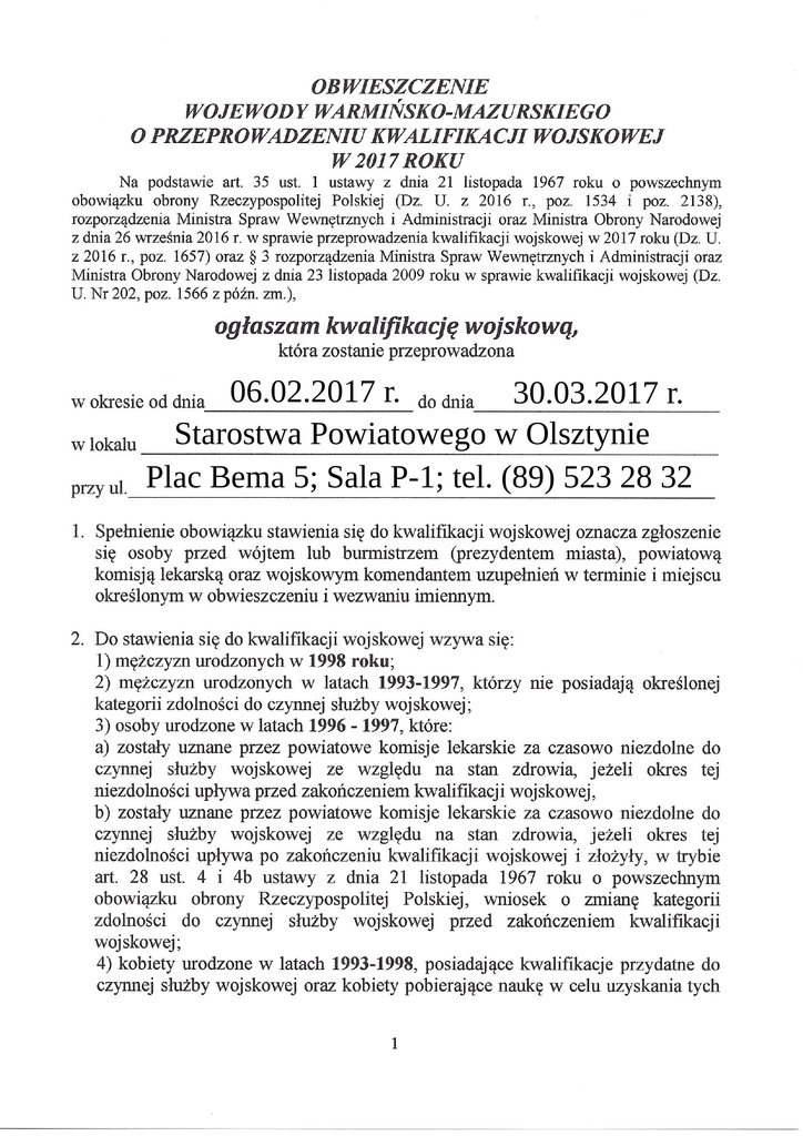 06.02.2017 r. 30.03.2017 r. Starostwa Powiatowego w Olsztynie Plac Bema 5; Sala P-1; tel. (89) 523 28 32