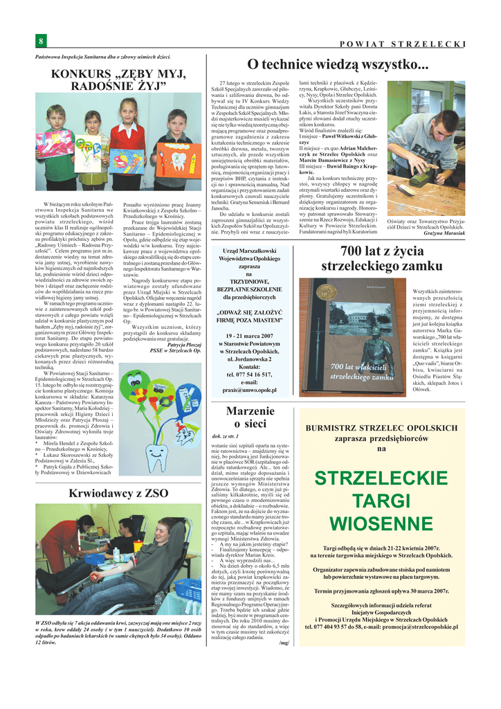 8 POWIAT STR Z E LE C K I Pañstwowa Inspekcja Sanitarna dba o zdrowy umiech dzieci. KONKURS ZÊBY MYJ, RADONIE ¯YJ W bie¿¹cym roku szkolnym Pañstwowa Inspekcja Sanitarna we wszystkich szko³ach podstawowych powiatu strzeleckiego, wród uczniów klas II realizuje ogólnopolski programu edukacyjnego z zakresu profilaktyki próchnicy zêbów pn. Radosny Umiech Radosna Przysz³oæ. Celem programu jest m.in. dostarczenie wiedzy na temat zdrowia jamy ustnej, wyrobienie nawyków higienicznych od najm³odszych lat, podniesienie wród dzieci odpowiedzialnoci za zdrowie swoich zêbów i dzi¹se³ oraz zachêcenie rodziców do wspó³dzia³ania na rzecz prawid³owej higieny jamy ustnej. W ramach tego programu uczniowie z zainteresowanych szkó³ podstawowych z ca³ego powiatu wziêli udzia³ w konkursie plastycznym pod has³em Zêby myj, radonie ¿yj, zorganizowanym przez G³ówny Inspektorat Sanitarny. Do etapu powiatowego konkursu przyst¹pi³o 20 szkó³ podstawowych, nades³ano 58 bardzo ciekawych prac plastycznych, wykonanych przez dzieci ró¿norodn¹ technik¹. W Powiatowej Stacji Sanitarno Epidemiologicznej w Strzelcach Op. 15. lutego br. odby³o siê rozstrzygniêcie konkursu plastycznego. Komisja konkursowa w sk³adzie: Katarzyna Kanoza Pañstwowy Powiatowy Inspektor Sanitarny, Maria Ko³odziej pracownik sekcji Higieny Dzieci i M³odzie¿y oraz Patrycja P³oszaj pracownik ds. promocji Zdrowia i Owiaty Zdrowotnej wy³oni³a troje laureatów: * Mirela Hendel z Zespo³u Szkolno Przedszkolnego w Kronicy, * £ukasz Skoroszewski ze Szko³y Podstawowej w Zalesiu l., * Patryk Gajda z Publicznej Szko³y Podstawowej w Dziewkowicach Ponadto wyró¿niono pracê Joanny Kwiatkowskiej z Zespo³u Szkolno Przedszkolnego w Kronicy. Prace trojga laureatów zostan¹ przekazane do Wojewódzkiej Stacji Sanitarno Epidemiologicznej w Opolu, gdzie odbêdzie siê etap wojewódzki w/w konkursu. Trzy najciekawsze prace z województwa opolskiego zakwalifikuj¹ siê do etapu centralnego i zostan¹ przes³ane do G³ównego Inspektoratu Sanitarnego w Warszawie. Nagrody konkursowe etapu powiatowego zosta³y ufundowane przez Urz¹d Miejski w Strzelcach Opolskich. Oficjalne wrêczenie nagród wraz z dyplomami nast¹pi³o 22. lutego br. w Powiatowej Stacji Sanitarno Epidemiologicznej w Strzelcach Op. Wszystkim uczniom, którzy przyst¹pili do konkursu sk³adamy podziêkowania oraz gratulacje. Patrycja P³oszaj PSSE w Strzelcach Op. Krwiodawcy z ZSO W ZSO odby³a siê 7 akcja oddawania krwi, zazwyczaj maj¹ one miejsce 2 razy w roku, krew odda³y 24 osoby ( w tym 1 nauczyciel). Dodatkowo 10 osób odpad³o po badaniach lekarskich (w sumie chêtnych by³o 34 osoby). Oddano 12 litrów. O technice wiedz¹ wszystko... 27 lutego w strzeleckim Zespole Szkó³ Specjalnych zawrza³o od pi³owania i szlifowania drewna, bo odbywa³ siê tu IV Konkurs Wiedzy Technicznej dla uczniów gimnazjum w Zespo³ach Szkó³ Specjalnych. M³odzi majsterkowicze musieli wykazaæ siê nie tylko wiedz¹ teoretyczn¹ obejmuj¹c¹ programowe oraz ponadprogramowe zagadnienia z zakresu kszta³cenia technicznego w zakresie obróbki drewna, metalu, tworzyw sztucznych, ale przede wszystkim umiejêtnoci¹ obróbki materia³ów, pos³ugiwania siê sprzêtem np. lutownic¹, znajomoci¹ organizacji pracy i przepisów BHP, czytania z instrukcji no i sprawnoci¹ manualn¹. Nad organizacj¹ i przygotowaniem zadañ konkursowych czuwali nauczyciele techniki: Gra¿yna Semeniuk i Bernard Janocha. Do udzia³u w konkursie zostali zaproszeni gimnazjalici ze wszystkich Zespo³ów Szkó³ na Opolszczynie. Przybyli oni wraz z nauczycie- Urz¹d Marsza³kowski Województwa Opolskiego zaprasza na TRZYDNIOWE, BEZP£ATNE SZKOLENIE dla przedsiêbiorczych ODWA¯ SIÊ ZA£O¯YÆ FIRMÊ POZA MIASTEM 19 - 21 marca 2007 w Starostwie Powiatowym w Strzelcach Opolskich, ul. Jordanowska 2 Kontakt: tel. 077 54 16 517, e-mail: [email protected] Marzenie o sieci dok. ze str. 1 wstanie sieæ szpitali oparta na systemie ratownictwa znajdziemy siê w niej, bo podstaw¹ jest funkcjonowanie w placówce SOR (szpitalnego oddzia³u ratunkowego). Ale... ten oddzia³, mimo sta³ego doposa¿ania i unowoczeniania sprzêtu nie spe³nia jeszcze wymogów Ministerstwa Zdrowia. To dlatego, o czym ju¿ pisalimy kilkakrotnie, myli siê od pewnego czasu o zmodernizowaniu obiektu, a dok³adnie o rozbudowie. Faktem jest, ¿e na dojcie do wyznaczonego standardu mamy jeszcze trochê czasu, ale... w Krapkowicach ju¿ rozpoczêto rozbudowê powiatowego szpitala, maj¹c w³anie na uwadze wymogi Ministerstwa Zdrowia. - A my na jakim jestemy etapie? - Finalizujemy koncepcjê odpowiada dyrektor Marian Kreis. - A wiêc wyprzedzili nas... - Na dzieñ dobry o oko³o 6,5 mln z³otych, czyli kwotê porównywaln¹ do tej, jak¹ powiat krapkowicki zamierza przeznaczyæ na pocz¹tkowy etap swojej inwestycji. Wiadomo, ¿e nie mamy szans na pozyskanie rodków z funduszy unijnych w ramach Regionalnego Programu Operacyjnego. Trzeba bêdzie ich szukaæ gdzie indziej, byæ mo¿e w programach centralnych. Do roku 2010 musimy dostosowaæ siê do standardów, a wiêc w tym czasie musimy te¿ zakoñczyæ realizacjê ca³ego zadania. /mg/ lami techniki z placówek z Kêdzierzyna, Krapkowic, G³ubczyc, Lenicy, Nysy, Opola i Strzelec Opolskich. Wszystkich uczestników przywita³a Dyrektor Szko³y pani Dorota £akis, a Starosta Józef Swaczyna ciep³ymi s³owami doda³ otuchy uczestnikom konkursu. Wród finalistów znaleli siê: I miejsce Pawe³ Witkowski z G³ubczyc II miejsce ex quo Adrian Malcherczyk ze Strzelec Opolskich oraz Marcin Damasiewicz z Nysy III miejsce Dawid Baingo z Krapkowic. Jak na konkurs techniczny przystoi, wszyscy ch³opcy w nagrodê otrzymali wiertarki udarowe oraz dyplomy. Gratulujemy uczestnikom i dziêkujemy organizatorom za organizacjê konkursu i nagrody. Honorowy patronat sprawowa³o Stowarzyszenie na Rzecz Rozwoju, Edukacji i Kultury w Powiecie Strzeleckim. Fundatorami nagród byli Kuratorium Owiaty oraz Towar