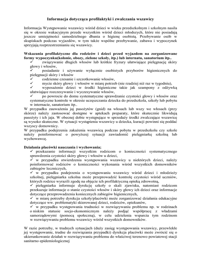 Informacja dotycząca profilaktyki i zwalczania wszawicy Informacja Występowanie wszawicy wśród dzieci w wieku przedszkolnym i szkolnym nasila się w okresie wakacyjnym przede wszystkim wśród dzieci młodszych, które nie posiadają jeszcze umiejętności samodzielnego dbania o higienę osobistą. Przebywanie osób w skupiskach podczas wyjazdów, w tym takŜe wspólne przebywanie, zabawa i wypoczynek sprzyjają rozprzestrzenianiu się wszawicy. Wskazania profilaktyczne dla rodziców i dzieci przed wyjazdem na zorganizowane formy wypoczynku(kolonie, obozy, zielone szkoły, itp.) lub internatu, sanatorium itp.. związywanie długich włosów lub krótkie fryzury ułatwiające pielęgnację skóry głowy i włosów, posiadanie i uŜywanie wyłącznie osobistych przyborów higienicznych do pielęgnacji skóry i włosów codzienne czesanie i szczotkowanie włosów, mycie skóry głowy i włosów w miarę potrzeb (nie rzadziej niŜ raz w tygodniu), wyposaŜenie dzieci w środki higieniczne takie jak szampony z odŜywką ułatwiające rozczesywanie i wyczesywanie włosów, po powrocie do domu systematyczne sprawdzanie czystości głowy i włosów oraz systematyczne kontrole w okresie uczęszczania dziecka do przedszkola, szkoły lub pobytu w internacie, sanatorium itp.. W przypadku zauwaŜenia jaj pasoŜytów (gnid) na włosach lub wszy we włosach (przy skórze) naleŜy zastosować dostępne w aptekach preparaty, które skutecznie likwidują pasoŜyty i ich jaja. W obecnej dobie występujące w sprzedaŜy środki zwalczające wszawicę są wysoko skuteczne. W sytuacji wystąpienia wszawicy u dziecka, kuracji powinni się poddać wszyscy domownicy. W przypadku podejrzenia zakaŜenia wszawicą podczas pobytu w przedszkolu czy szkole naleŜy poinformować o powyŜszej sytuacji zawiadomić pielęgniarkę szkolną lub wychowawcę. Działania placówki nauczania i wychowania; przekazanie informacji wszystkim rodzicom o konieczności systematycznego sprawdzenia czystości skóry głowy i włosów u dzieci, w przypadku stwierdzenia występowania wszawicy u niektórych dzieci, naleŜy poinformować rodziców o konieczności wykonania wśród wszystkich domowników zabiegów leczniczych, w przypadku podejrzenia o występowaniu wszawicy wśród dzieci i młodzieŜy szkolnej, pielęgniarka szkolna moŜe przeprowadzić kontrolę czystości wśród uczniów, których rodzice wyrazili zgodę na objęcie ich profilaktyczną opieką zdrowotną, pielęgniarka informuje dyrekcję szkoły o skali zjawiska, natomiast rodzicom przekazuje informacje o stanie czystości włosów i skóry głowy ich dzieci oraz informacje dotyczące przeprowadzenia koniecznych zabiegów higienicznych, w miarę potrzeby dyrekcja szkoły/placówki moŜe zorganizować działania edukacyjne dotyczące ww. problematyki skierowanej dzieci, rodziców, opiekunów, w przypadku występowania trudności w rozwiązywaniu problemu np. w rodzinach o niskim statusie socjo-ekonomicznym naleŜy podjąć współpracę z władzami samorządowymi (pomocą społeczną), w celu udzielenia wsparcia tym rodzinom w rozwiązywaniu problemu wszawicy wśród wszystkich domowników. W razie potrzeby, w trudnych sytuacjach (duŜy zasięg występowania wszawicy, przewlekłe jej występowanie, trudne do rozwiązania przypadki) dyrekcja placówki moŜe zwrócić się o ukierunkowanie działań w rozwiązywaniu problemu do właściwej terenowo powiatowej stacji sanitarno epidemiologicznej Stanowisko Instytutu Matki i Dziecka z dnia 29 listopada 2004r. w sprawie kontroli czystości uczniów przez pielęgniarki i higienistki szkolne Zgodnie z obecnie obowiązującym Rozporządzeniem Ministra Zdrowia z dnia 12 grudnia 2004 r. w sprawie zakresu i organizacji profilaktycznej opieki zdrowotnej nad dziećmi i młodzieŜą (Dz. U. Nr 282, poz. 2814) oraz zaleceniami Instytutu Matki i Dziecka zawartymi w publikacji "Standardy i metodyka pracy pielęgniarki i higienistki szkolnej" odstąpiono od procedury kontroli czystości uczniów Procedura ta była w latach ubiegłych przeprowadzana dwukrotnie w ciągu roku szkolnego i obejmowała wszystkich uczniów szkoły, a sposób jej realizacji budził wiele kontrowersji i naruszał poczucie godności uczniów. Ponadto nie prowadził do poprawy czystości uczniów, gdyŜ moŜliwości naprawcze były znikome. Dlatego obecnie nie wolno lekarzowi, pielęgniarce, ani nauczycielowi przeprowadzać publicznie kontroli czystości uczniów. Zgodnie z obowiązującymi standardami pielęgniarka i higienistka szkolna w ramach profilaktycznej opieki pielęgniarskiej rozpoznaje problemy zdrowotne i społeczne uczniów oraz wynikające z nich potrzeby zdrowotne, w tym w zakresie higieny osobistej. Uczniów, u których stwierdza problemy wynikające z niewydolności opiekuńczej rodziny, obejmuje opieką czynną i podejmuje odpowiednie do zaistniałej sytuacji działania. NaleŜy pamiętać, Ŝe wszelkie informacje dotyczące stanu zdrowia są informacjami objętymi tajemnicą medyczną i szczególną ochroną. Osoby trzecie, czyli dyrektorzy szkół i nauczyciele mogą Ŝądać informacji tylko w takim zakresie, w jakim pozwala na to prawo. NaleŜy pamiętać, iŜ nie wolno ograniczać dostępu do nauki z powodu stanu zdrowia ucznia. JeŜeli stan zdrowia ucznia tego wymaga, to dyrektor szkoły jest zobowiązany do stworzenia takich warunków, aby uczeń mógł bez przeszkód kontynuować naukę (Ustawa o systemie oświaty Dz.U. 1996, Nr 67, poz. 329, art 1, ze zmianami). Zakład Medycyny Szkolnej Instytutu Matki i Dziecka stoi na stanowisku, iŜ: • • • • • • • • nie wolno publicznie (w obecności osób trzecich) sprawdzać czystości uczniów decyzję o sprawdzeniu czystości skóry i włosów u uczniów w warunkach indywidualnego badania, podejmuje pielęgniarka rodzic/opiekun prawny moŜe nie wyrazić zgody na objęcie jego dziecka badaniem. pielęgniarka moŜe dokonać przeglądu czystości skóry i włosów, za zgodą rodzic