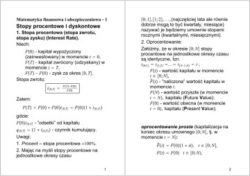 Matematyka finansowa i ubezpieczeniowa - 1 Stopy procentowe i dyskontowe 1. Stopa procentowa (stopa zwrotu, stopa zysku) (Interest Rate). Niech: F0 - kapitał wypoŜyczony (zainwestowany) w momencie t = 0, FT - kapitał zwrócony (odzyskany) w momencie t = T, FT − F0 - zysk za okres 0, T. Stopa zwrotu: i 0,T = FT−F0 F0 Zatem: FT = F0 + F0i 0,T = F01 + i 0,T  gdzie: F0i 0,T - ”odsetki” od kapitału q 0,T = 1 + i 0,T  - czynnik kumulujący. Uwagi: 1. Procent = stopa procentowa ×100%. 2. Mając na myśli stopy procentowe na jednostkowe okresy czasu 0; 1, 1; 2, . . . , (najczęściej lata ale równie dobrze mogą to być kwartały, miesiące) nazywać je będziemy umownie stopami rocznymi (kwartalnymi, miesięcznymi). 2. Oprocentowanie: ZałóŜmy, Ŝe w okresie 0; N stopy procentowe na jednostkowe okresy czasu są identyczne, tzn. i 0;1 = i 1;2 =. . . = i N−1;N = i ; Ft - wartość kapitału w momencie t ∈ 0; N, F̃ t - ”naliczona” wartość kapitału w momencie t. FN - wartość przyszła (w momencie t = N, kapitału (Future Value); F0 - wartość obecna (w momencie t = 0, kapitału (Present Value); oprocentowanie proste (kapitalizacja na koniec okresu umownego 0; N, tj. w momencie t = N: F̃ t = F01 + it, t ∈ 0; N, Ft = F0 t ∈ 0; N, 1 2 • oprocentowanie składane (kapitalizacja odsetek na koniec podokresów t k−1 , t k  ⊂ 0; N: oprocentowanie składane kapitalizacja zgodna z okresem stopy i (kapitalizacja odsetek w momentach t = n = 1, 2, . . . , N F̃ N = FN = F01 + iN 300 250 Fn = Fn − 11 + i = Fn − 1q, n = 1, 2, . . . , N, 200 Fn = F01 + i n = F0q n , n = 0, 1, 2, . . . , N, F̃ t = Fn1 + it − n, t ∈ n; n + 1, 150 100 FN = F01 + i N 50 0 1 2t 3 4 F̃ t = 1001 + 0. 30t 3 4 • oprocentowanie składane kapitalizacja niezgodna z okresem stopy i , z częstością m (kapitalizacja w momentach t = mk , k = 1, 2, . . . , mN: k  = F k − 1 1 + i 1 , k = 1, 2, . . . , mN, F m m m k  = F01 + i 1  k , k = 0, 1, 2, . . . , mN, F m m k 1 + it − k , t ∈  k ; k + 1 , F̃ t = F m m m m 300 250 200 150 100 50 0 1 2t 3 4 FN = F01 + i m1  mN = F01 + i m1  m  Fn = 1001 + 0. 30 n , n = 1, 2, 3, 4 N 300 250 200 150 100 50 0 1 F 2k  = 1001 + 5 2t 0.30 2 3 4  k , k = 1, . . . , 8 6 1001 + 0. 30 1  12 12 1001 + 0. 30 1  365 365 1  3652460 1001 + 0. 30 3652460 100e 0.30 oprocentowanie składane - kapitalizacja ciągła (nieskończenie często, i −ciągła stopa procentowa) 1  m kmm lim F01 + i m F̃ t = Ft = m→∞ 1  mt = F0 lim 1 + 1  mi = m→∞ lim F01 + i m m m→∞ i it = 134. 488 882 = 134. 969 258 = 134. 985 869 = 134. 985 881 Liczba Eulera e ≈ 2, 718281828. . . , y = ln x  x = e y = F0e it gdzie km m ≤t< k m +1 m 300 Stąd (i z tw. o trzech ciągach) gdy m → ∞ to km → t m k gdyŜ t − m1 < mm ≤ t Przykład: 250 200 150 100 50 0 1 2t 3 4 Ft = 100e 0.30t 7 8 Tempo przyrostu kapitału F ′ t oraz tempo ′ t procentowego przyrostu kapitału FFt przy nominalnej stopie rocznej i : w oprocentowaniu prostym: 300 250 200 dF̃ t = F̃ ′ t = F0i dt dF̃ t F̃ ′ t i = = ̃Fdt ̃Ft 1 + it 150 100 50 0 1 2t 3 w oprocentowaniu ciągłym: 4 Stopa nominalna i = 0. 30, cz ęstości m = 9 F ′ t = F0e it i F ′ t =i Ft 10 42 0.42 40 0.4 38 0.38 36 0.36 34 0.34 32 0.32 30 0.3 28 0.28 26 0.26 24 0.24 22 0 0.2 0.4 t 0.6 0.8 0.22 0 1 0.2 0.4 t 0.6 0.8 1 i = 0. 30; i = 0. 30, F0 = 100; F̃ ′ t = F0i (zielony); F ′ t = F0e it i (fiolet) F̃ ′ t F̃ t = F ′ t Ft = i (fiolet) i 1+it (zielony); 3. RównowaŜność stóp procentowych Niech: i - nominalna stopa procentowa na okres jednostkowy (Nominal), m - częstość kapitalizacji w okresie jednostkowym, w momentach t = mk , k = 1, 2, . . . , wg stopy i m1 na kaŜdy z k podokresów  k−1 m , m . Stopa efektywna (Effective) równowaŜna stopie nominalnej i przy 11 12 kapitalizacji składanej z częstością m to taka stopa i ef na okres jednostkowy, Ŝe efekt dopisania odsetek wg tej stopy raz po okresie jednostkowym jest taki sam jak efekt dopisywania m razy - co m1 − ta okresu jednostkowego - ze stopą i m1 za kaŜdy k podokres  k−1 m ; m , k = 1, 2, . . . m, tzn.: i ef ≅ m i gdy 1 + i ef = 1 + i 1 m  . m Stąd i ef ≊ ∞ δ ⇕ 1 m = eδ, lim 1 + δ m 1 + i ef = m→∞ δ = m→∞ lim m m 1 + i ef − 1 = ln1 + i ef  δ - siła oprocentowania albo ciągła stopa procentowa 1 + i ef  t = e δt - czynnik kumulujący (oprocentowujący) na okres 0, t. i ef ≅ m i gdy i = m m 1 + i ef − 1 Uwagi. 1. Gdy m = 1, (kapitalizacja zgodna), to stopa nominalna = stopa efektywna i = i ef . 2. Stopa efektywna i ef równowaŜna stopie nominalnej δ przy kapitalizacji ciągłej m = +∞: 13 14 Przykład: Dla i ef = 0. 80 m i m i m 1 + i ef − 1, nom ≅ i ef : nom = m m i m nom ≅ 0. 80 1 0. 80 2 0. 6833 4 0. 6332 12 0. 6024 365 0. 5883 d F0 1−d0,T - odsetki (”z dołu”) od kapitału 0,T F0. 180 160 1 + d + d 2 + d 3 +. . . = 1 + 140 100 0 0. 587 787 0.2 0.4 t 0.6 0.8 F mk  = 1001 + m = 1, 2, 4, ∞ −1 < d stopa procentowa i i stopa dyskontowa d równowaŜne w momencie t = N : 1 1 − d 0,N 1 1 − d 0,N 1 1 + iN = 1 − dN i d= 1 + iN 1 + i 0,N = FT−F0 FT F0 = FT − FTd 0,T = FT1 − d 0,T  FT = F0 k F01 + i 0,N  = FN = F0 4. Dyskontowanie, stopa dyskontowa (Discount Rate) d 0,T = 1 i m nom m d = 1 , 1−d 1−d ZałóŜmy, Ŝe stopa dyskontowa d n−1,n = d dla n = 1, 2, . . . , N; • dyskontowanie proste d 0,N = dN FN = F0 1 1 − dN 120 365 × 60 0. 587 795 ∞ F0d 0,T - ”odsetki z góry” od kapitału F0 d 0,T 1 = F0 + F0 1 − d 0,T 1 − d 0,T 15 16 1 , 1−d δ = 1 1+ m przy częstości m 1 − dmm 1+i = dyskontowanie składane dyskontowanie składane- kapitalizacja zgodna: Fn − 1 = Fn1 − d F0 = Fn1 − d n 1 Fn = F0 , n = 1, 2, . . . , N, 1 − d n dyskontowanie składane- kapitalizacja niezgodna (kapitalizacja w momentach t = mk , k = 1, 2, . . . , mN: − 1  = F k 1 − d  F k m m m 1 1 − d  =. . . = F k 1 − d  k F0 = F m m m m k  = F0 1 F m , k = 1, 2, . . . , mN, 1 − md 