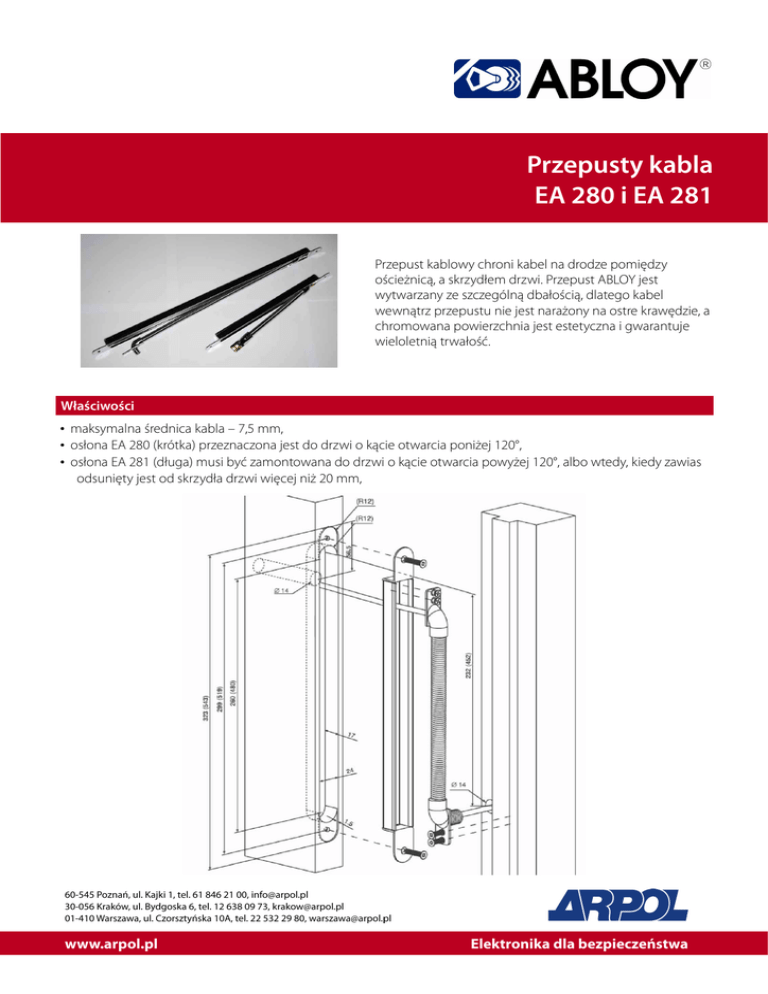 Przepusty kabla EA 280 i EA 281 Przepust kablowy chroni kabel na drodze pomiędzy ościeżnicą, a skrzydłem drzwi. Przepust ABLOY jest wytwarzany ze szczególną dbałością, dlatego kabel wewnątrz przepustu nie jest narażony na ostre krawędzie, a chromowana powierzchnia jest estetyczna i gwarantuje wieloletnią trwałość. Właściwości • maksymalna średnica kabla – 7,5 mm, • osłona EA 280 (krótka) przeznaczona jest do drzwi o kącie otwarcia poniżej 120°, • osłona EA 281 (długa) musi być zamontowana do drzwi o kącie otwarcia powyżej 120°, albo wtedy, kiedy zawias odsunięty jest od skrzydła drzwi więcej niż 20 mm,