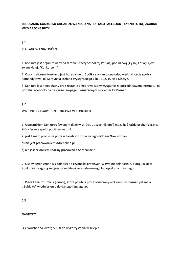 REGULAMIN KONKURSU ORGANIZOWANEGO NA PORTALU FACEBOOK – CYKNIJ FOTKĘ, ZGARNIJ WYMARZONE BUTY §1 POSTANOWIENIA OGÓLNE 1. Konkurs jest organizowany na terenie Rzeczypospolitej Polskiej pod nazwą „Cyknij Fotkę” i jest zwany dalej: "Konkursem". 2. Organizatorem Konkursu jest Adrenaline.pl Spółka z ograniczoną odpowiedzialnością spółka komandytowa, ul. Kardynała Stefana Wyszyńskiego 1 lok. 302, 10-457 Olsztyn, 3. Konkurs jest nieodpłatny oraz zostanie przeprowadzony wyłącznie za pośrednictwem Internetu, na portalu Facebook- na osi czasu fan-page’u oznaczonym nickiem Nike Poznań. §2 WARUNKI I ZASADY UCZESTNICTWA W KONKURSIE 1. Uczestnikiem Konkursu (zwanym dalej w skrócie „Uczestnikiem”) może być każda osoba fizyczna, która łącznie spełni poniższe warunki: a) jest Fanem profilu na portalu Facebook oznaczonego nickiem Nike Poznań d) nie jest pracownikiem Adrenaline.pl c) nie jest członkiem rodziny pracownika Adrenaline.pl 2. Osoby ograniczone w zdolności do czynności prawnych, w tym niepełnoletnie, biorą udział w Konkursie za zgodą swojego przedstawiciela ustawowego lub opiekuna prawnego. 3. Przez Fana rozumie się osobę, która polubiła profil oznaczony nickiem Nike Poznań /kliknęła „ Lubię to” w odniesieniu do danego fanpage’a/. §3 NAGRODY 4 x Voucher na kwotę 500 zł do wykorzystania w sklepie 2. Zdobywcą nagrody w Konkursie jest Uczestnik, który spełni łącznie następujące warunki: a) Wykona zdjęcie swojej osoby na tle witryny sklepu Nike, znajdującego się w CH Posnania w Poznaniu b) Wyśle zdjęcie na adres [email protected], my udostępnimy je w albumie ,,Cyknij fotkę" na naszym fanpage. c) Zbierze jedną z czterech największych publiczności pod swoim zdjęciem d) Podczas odbioru nagrody przedstawi tożsamość. 3. Zdobywca nagrody zostanie powiadomiony o wygranej pocztą elektroniczną w przeciągu 5 (pięciu) dni roboczych od zakończenia Konkursu. 4. Celem potwierdzenia chęci przyjęcia nagrody, powiadomiony Zdobywca powinien odpowiedzieć pocztą elektroniczną na adres [email protected] w terminie 3 (trzech) dni od dnia otrzymania przez Organizatora potwierdzenia odczytania wiadomości przez Uczestnika, pod rygorem uznania, iż odmawia przyjęcia nagrody. 5. Za przekazanie nagrody zwycięzcy odpowiedzialny będzie Organizator, który równocześnie ponosi koszt tego przekazania. 6. Osoby posługujące się programami automatyzującymi udział w konkursie, w szczególności poprzez tzw. „pulsacyjne dodawanie lajków” nie mogą zostać jego zwycięzcami. Zakazuje się także wszelkich praktyk związanych z manipulowaniem, sprzedażą, kupowaniem czy wymianą „Lubię to”. Punkty zdobyte w ten sposób nie będą brane pod uwagę przy rozstrzyganiu o zwycięstwie, a taki Uczestnik może być wykluczony z niniejszego Konkursu. §4 DANE OSOBOWE UCZESTNIKÓW KONKURSU 1. Warunkiem udziału w Konkursie jest podanie przez Uczestnika Konkursu prawdziwych danych osobowych, w szczególności imienia, nazwiska, wieku, adresu konta poczty elektronicznej, numeru tel. kontaktowego- niezbędnych do przekazania nagrody. 2. Przystępując do Konkursu i akceptując niniejszy regulamin Uczestnik wyraża zgodę na przetwarzanie podanych przez niego danych osobowych przez Organizatora. Dane będą wykorzystywane i przetwarzane wyłącznie w celu przeprowadzenia niniejszego Konkursu oraz w związku z wydaniem nagrody. 3. Administratorem danych osobowych uzyskanych na potrzeby Konkursu jest bezpośrednio Organizator. 4. Każdy Uczestnik ma prawo nieograniczonego dostępu do przekazanych danych osobowych i ma prawo ich weryfikowania, poprawiania i aktualizacji. §5 PRAWA AUTORSKIE 1. Uczestnik zamieszczając na profilu Organizatora fotografię ze swoim wizerunkiem, udziela mu w ten sposób licencji na korzystanie z fotografii i upubliczniania jego wizerunku- wyłącznie na potrzeby Konkursu- wyłącznie na portalu Facebook, na fanpage’u pod nickiem Nike Poznań, przez czas trwania Konkursu. §6 POSTANOWIENIA KOŃCOWE 1. Celem zapewnienia prawidłowej organizacji Konkursu, Organizator powołuje komisję konkursową. Wszelkie wątpliwości dotyczące zasad Konkursu, interpretacji i postanowień tego Regulaminu rozstrzyga Organizator. 2. Organizator ma prawo do zmiany postanowień niniejszego Regulaminu, o ile nie wpłynie to na pogorszenie warunków uczestnictwa w Konkursie. Dotyczy to w szczególności zmian terminów poszczególnych czynności konkursowych. Zmieniony Regulamin obowiązuje od czasu opublikowania go na profilu Nike Poznań 3. Organizator informuje, iż Konkurs nie jest w żaden sposób sponsorowany, popierany ani przeprowadzany przez Facebook ani firmę z nim związaną. 4. Organizator informuje, iż każdy Uczestnik jest zwolniony od odpowiedzialności prawnej wynikającej z wzięcia udziału w konkursie. 5. Za wady fizyczne Nagrody Organizator odpowiada na zasadach ogólnych.