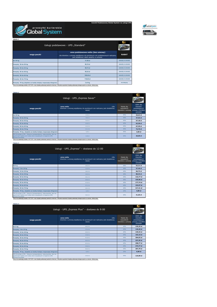 Cennik Podstawowy Global System na usługi UPS tabela 1 Usługi podstawowe - UPS „Standard” cena podstawowa netto (bez umowy) waga paczki dla klientów z umową współpracy do poniższych cen podstawowych naliczany jest dodatkowy rabat zawarty w umowie. RABAT Do 30 kg 31,58 zł zawarty w umowie Powyżej 30 do 50 kg 80,18 zł zawarty w umowie Powyżej 50 do 55 kg 89,72 zł zawarty w umowie Powyżej 55 do 60 kg 99,34 zł zawarty w umowie Powyżej 60 do 65 kg 108,44 zł zawarty w umowie Powyżej 65 do 70 kg 118,02 zł zawarty w umowie 2 zł/ kg nie dotyczy Powyżej 70 kg (dopłata za każdy kolejny rozpoczęty kilogram) Ceny nie zawierają podatku VAT 23% oraz dopłaty paliwowej (wartość zmienna) . Aktualna wysokość dopłaty paliwowej dostępna jest na stronie: kliknij tutaj Tabela 2 Usługi - UPS „Express Saver” cena netto (dla klientów z umową współpracy do poniższych cen naliczany jest dodatkowy rabat) waga paczki CENY dla Rabat dla klientów wszystkich posiadających klientów z umową umowę z GLOBAL SYSTEM Do 30 kg 34,36 zł 40% 20,62 zł Powyżej 30 do 50 kg 79,22 zł 40% 47,53 zł Powyżej 50 do 55 kg 95,30 zł 40% 57,18 zł Powyżej 55 do 60 kg 103,84 zł 40% 62,30 zł Powyżej 60 do 65 kg 112,32 zł 40% 67,39 zł Powyżej 65 do 70 kg 121,16 zł 40% 72,70 zł 5,00 zł 40% 3,00 zł 40% 20,69 zł Powyżej 70 kg (dopłata za każdy kolejny rozpoczęty kilogram) UPS Envelope (LTR) - Dotyczy korespondencji i dokumentów. Nie ma 34,48 zł ograniczeń ciężaru ani liczby stron wysyłanych w kopercie UPS Express Envelope. Ceny nie zawierają podatku VAT 23% oraz dopłaty paliwowej (wartość zmienna) . Aktualna wysokość dopłaty paliwowej dostępna jest na stronie: kliknij tutaj Tabela 3 Usługi - UPS „Express” – dostawa do 12:00 cena netto (dla klientów z umową współpracy do poniższych cen naliczany jest dodatkowy rabat) waga paczki CENY dla Rabat dla klientów wszystkich posiadających klientów z umową umowę z GLOBAL SYSTEM Do 5 g 100,40 zł 48% 52,21 zł Powyżej 5 do 10 kg 110,50 zł 48% 57,46 zł Powyżej 10 do 20 kg 128,30 zł 48% 66,72 zł Powyżej 20 do 30 kg 154,50 zł 48% 80,34 zł Powyżej 30 do 50 kg 236,10 zł 48% 122,77 zł Powyżej 50 do 55 kg 299,80 zł 48% 155,90 zł Powyżej 55 do 60 kg 341,80 zł 48% 177,74 zł Powyżej 60 do 65 kg 371,10 zł 48% 192,97 zł Powyżej 65 do 70 kg 418,10 zł 48% 217,41 zł 6,00 zł 20% 4,80 zł 48% 41,65 zł Powyżej 70 kg (dopłata za każdy kolejny rozpoczęty kilogram) UPS Envelope (LTR) - Dotyczy korespondencji i dokumentów. Nie ma 80,10 zł ograniczeń ciężaru ani liczby stron wysyłanych w kopercie UPS Express Envelope. Ceny nie zawierają podatku VAT 23% oraz dopłaty paliwowej (wartość zmienna) . Aktualna wysokość dopłaty paliwowej dostępna jest na stronie: kliknij tutaj Tabela 4 Usługi - UPS „Express Plus” – dostawa do 9:00 waga paczki cena netto (dla klientów z umową współpracy do poniższych cen naliczany jest dodatkowy rabat) CENY dla Rabat dla klientów wszystkich posiadających klientów z umową umowę z GLOBAL SYSTEM Do 5 kg 265,20 zł 49% 135,25 zł Powyżej 5 do 10 kg 275,30 zł 49% 140,40 zł Powyżej 10 do 20 kg 293,00 zł 49% 149,43 zł Powyżej 20 do 30 kg 319,80 zł 49% 163,10 zł Powyżej 30 do 50 kg 401,80 zł 49% 204,92 zł Powyżej 50 do 55 kg 465,40 zł 49% 237,35 zł Powyżej 55 do 60 kg 507,40 zł 49% 258,77 zł Powyżej 60 do 65 kg 536,80 zł 49% 273,77 zł Powyżej 65 do 70 kg 583,90 zł 49% 297,79 zł 8,00 zł 25% 6,00 zł 49% 124,90 zł Powyżej 70 kg (dopłata za każdy kolejny rozpoczęty kilogram) UPS Envelope (LTR) - Dotyczy korespondencji i dokumentów. Nie ma 244,90 zł ograniczeń ciężaru ani liczby stron wysyłanych w kopercie UPS Express Envelope. Ceny nie zawierają podatku VAT 23% oraz dopłaty paliwowej (wartość zmienna) . Aktualna wysokość dopłaty paliwowej dostępna jest na stronie: kliknij tutaj Tabela 5 Usługi paletowe – UPS „Standard Paletowy” cena netto (dla klientów z umową współpracy do poniższych cen naliczany jest dodatkowy rabat) waga paczki CENY dla Rabat dla klientów wszystkich posiadających klientów z umową umowę z GLOBAL SYSTEM Do 100 kg 414,00 zł 49% 211,14 zł Powyżej 100 do 140 kg 504,00 zł 49% 257,04 zł Powyżej 140 do 200 kg 538,00 zł 49% 274,38 zł Powyżej 200 do 240 kg 602,00 zł 49% 307,02 zł Powyżej 240 do 280 kg 616,00 zł 49% 314,16 zł Powyżej 280 do 300 kg 708,00 zł 49% 361,08 zł Powyżej 300 do 350 kg 806,00 zł 49% 411,06 zł Powyżej 350 do 400 kg 856,00 zł 49% 436,56 zł Powyżej 400 do 450 kg 954,00 zł 49% 486,54 zł Powyżej 450 do 500 kg 1 048,00 zł 49% 534,48 zł Powyżej 500 do 600 kg 1 118,00 zł 49% 570,18 zł Powyżej 600 do 700 kg 1 222,00 zł 49% 623,22 zł Powyżej 700 do 800 kg 1 390,00 zł 49% 708,90 zł Powyżej 800 do 1000 kg 1 734,00 zł 49% 884,34 zł cena netto (dla klientów z umową współpracy do poniższych cen naliczany jest dodatkowy rabat) Rabat dla wszystkich klientów z umową Ceny nie zawierają podatku VAT 23% oraz dopłaty paliwowej (wartość zmienna) . Aktualna wysokość dopłaty paliwowej dostępna jest na stronie: kliknij tutaj Tabela 6 Dopłaty do cen podstawowych za usługi dodatkowe i niestandardowe usługa opis usługi CENY dla klientów posiadających umowę z GLOBAL SYSTEM · Maksymalna zadeklarowana wartość towarów w paczce nie może przekraczać 50.000 USD lub równowartości tej kwoty w miejscowej walucie · Uprawnia do zgłaszania roszczeń o odszkodowanie za udowodnione straty do wysokości zadeklarowanej wartości przesyłki: Ubezpieczenie od zadeklarowana wartość przesyłki · przesyłka o wartość do 323zł · przesyłka o wartość od 323zł do 50.000zł · przesyłka o wartość od 50.000zł do 100.000zł · przesyłka o wartości ponad 100.000zł · przesyłki międzynarodowej wynosi 1,5% zadeklarowanej wartości towarów, ale nie mniej niż 30PLN. · Max kwota pobrania COD to 5000 USD · Pobranie za każdy rozpocz