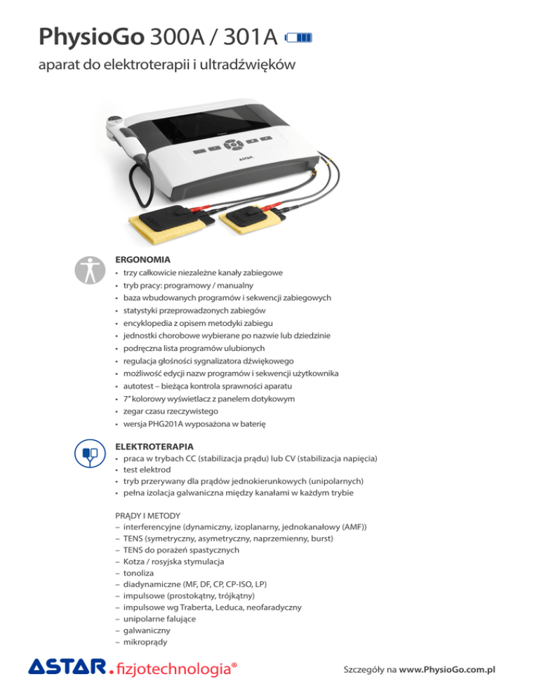 PhysioGo 300A / 301A aparat do elektroterapii i ultradźwięków ERGONOMIA • trzy całkowicie niezależne kanały zabiegowe • tryb pracy: programowy / manualny • baza wbudowanych programów i sekwencji zabiegowych • statystyki przeprowadzonych zabiegów • encyklopedia z opisem metodyki zabiegu • jednostki chorobowe wybierane po nazwie lub dziedzinie • podręczna lista programów ulubionych • regulacja głośności sygnalizatora dźwiękowego • możliwość edycji nazw programów i sekwencji użytkownika • autotest – bieżąca kontrola sprawności aparatu • 7’’ kolorowy wyświetlacz z panelem dotykowym • zegar czasu rzeczywistego • wersja PHG201A wyposażona w baterię ELEKTROTERAPIA • praca w trybach CC (stabilizacja prądu) lub CV (stabilizacja napięcia) • test elektrod • tryb przerywany dla prądów jednokierunkowych (unipolarnych) • pełna izolacja galwaniczna między kanałami w każdym trybie PRĄDY I METODY – interferencyjne (dynamiczny, izoplanarny, jednokanałowy (AMF)) – TENS (symetryczny, asymetryczny, naprzemienny, burst) – TENS do porażeń spastycznych – Kotza / rosyjska stymulacja – tonoliza – diadynamiczne (MF, DF, CP, CP‐ISO, LP) – impulsowe (prostokątny, trójkątny) – impulsowe wg Traberta, Leduca, neofaradyczny – unipolarne falujące – galwaniczny – mikroprądy Szczegóły na www.PhysioGo.com.pl ELEKTRODIAGNOSTYKA • elektrodiagnostyka z graficzną prezentacją krzywej I/t • automatyczne przeliczanie reobazy, chronaksji, współczynnika i ilorazu akomodacji TERAPIA ULTRADŹWIĘKOWA • częstotliwość pracy 1 MHz/ 3,5 MHz • efektywna powierzchnia promieniowania 1 cm2 i 4 cm2 • emisja ciągła – efekt termiczny • emisja impulsowa – mikromasaż • kontrola przylegania czoła głowicy sprzężona z zegarem zabiegowym • precyzyjna kontrola emisji fali ultradźwiękowej w trakcie zabiegu • kalibracja czułości głowicy według potrzeb • automatyczna kontrola emitowanej mocy TERAPIA SKOJARZONA • praca w trybach CC (stabilizacja prądu) lub CV (stabilizacja napięcia) • częstotliwość pracy 1 MHz/ 3,5 MHz • efektywna powierzchnia promieniowania 1 cm2 i 4 cm2 • emisja ciągła – efekt termiczny • emisja impulsowa – mikromasaż • kontrola przylegania czoła głowicy sprzężona z zegarem zabiegowym • precyzyjna kontrola emisji fali ultradźwiękowej w trakcie zabiegu • kalibracja czułości głowicy według potrzeb • automatyczna kontrola emitowanej mocy PRĄDY I METODY – interferencyjne (dynamiczny, izoplanarny, jednokanałowy (AMF)) – TENS (symetryczny, asymetryczny, naprzemienny, burst) – Kotza / rosyjska stymulacja TRYB MANUALNY pełna kontrola nad parametrami zabiegowymi dla zaawansowanych użytkowników PROGRAMY ZABIEGOWE • uproszczenie obsługi aparatu • 204 wbudowanych programów zabiegowych • 150 programów do ustawienia dla użytkowników • 204 programów ulubionych • nadawanie własnych nazw programom PARAMETRY TECHNICZNE • • • • • sterownik – maks. natężenie prądu w obwodzie pacjenta (tryb CC) – galwaniczne 40 mA – diadynamiczne, impulsowe 60 mA – interferencyjne, Kotza, unipolarne falujące 100 mA – TENS 140 mA – tonoliza 100 mA – mikroprądy 1000 µA maks. amplituda napięcia w obwodzie pacjenta (tryb CV) 140 V maks. natężenie fali ultradźwiękowej w trybie ciągłym / impulsowym 2 / 3 W/cm2 częstotliwość w trybie impulsowym 16 Hz, 48 Hz, 100 Hz wypełnienie w trybie impulsowym 5 – 75 %, krok 5 % Szczegóły na www.PhysioGo.com.pl • zasilanie, pobór mocy • wymiary • masa 230 V, 50/60 Hz, max 75W, 90VA 34 x 28 x 11‐16 6 kg WYPOSAŻENIE STANDARDOWE • przewód sieciowy • kable pacjenta (2 szt.) • elektrody do elektroterapii 6 x 6 cm (4 szt.); 7,5 x 9 cm (2 szt.) • pokrowce wiskozowe do elektroterapii 6 x 6 cm (8 szt.); 7,5 x 9 cm (4 szt.) • pasy rzepowe 40 x 10 cm (2 szt.); 100 x 10 cm (2 szt.) • żel do ultradźwięków 500 g (1 szt.) • bezpieczniki zapasowe WTA‐T 1 A/250 V (2 szt.) • rysik pojemnościowy do ekranu LCD (1 szt.) • ścierka do ekranu LCD (1 szt.) • nakładki maskujące z wycięciem (2 szt.) WYPOSAŻENIE OPCJONALNE • elektrody samoprzylepne 3 x 4 cm; 5,5 x 5,5 cm; 5,5 x 12,5 cm • elektrody punktowe 6 mm, 10 mm, 15 mm, 20 mm • złącze typu krokodylek • woreczek z piaskiem 21 x 14 cm, 21 x 28 cm • głowica 1/ 3,5 MHz, 1 cm2 z uchwytem • głowica 1/ 3,5 MHz, 4 cm2 z uchwytem • przewód do terapii skojarzonej • wyłącznik pacjenta • torba mieszcząca aparat wraz z wyposażeniem • stolik Elf, Elf X • akumulator Szczegóły na www.PhysioGo.com.pl