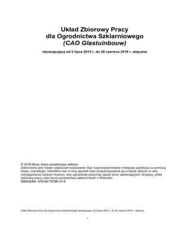 Układ Zbiorowy Pracy dla Ogrodnictwa Szklarniowego (CAO Glastuinbouw) obowiązujący od 2 lipca 2015 r. do 30 czerwca 2018 r. włącznie © 2016 Biuro Actor poradnictwo sektora Zabronione jest nawet częściowe kopiowanie i/lub rozpowszechnianie niniejszej publikacji za pomocą druku, kserokopii, mikrofilmu lub w inny sposób oraz przechowywanie jej w bazie danych w celu udostępniania osobom trzecim, bez uprzedniej pisemnej zgody stron zawierających niniejszy układ zbiorowy pracy oraz biura poradnictwa sektora Actor z Woerden. ISBN/EAN: 978-90-79788-37-8 Układ Zbiorowy Pracy dla Ogrodnictwa Szklarniowego obowiązujący od 2 lipca 2015 r. do 30 czerwca 2018 r. włącznie. 1 Strony Układu Zbiorowego Pracy Układ Zbiorowy Pracy dla Ogrodnictwa Szklarniowego został zawarty pomiędzy: - Organizacją Przedsiębiorców Ogrodnictwa Szklarniowego LTO Noord Glaskracht z siedzibą w Bleiswijk, Organizacją ds. Rolnictwa i Ogrodnictwa oddział Północ (LTO Noord) z siedzibą w Zwolle Organizacją ds. Rolnictwa i Ogrodnictwa oddział Południe (ZLTO) z siedzibą w Den Bosch Organizacją ds. Rolnictwa i Ogrodnictwa oddział Limburg (LLTB) z siedzibą w Roermond Plantum z siedzibą w Goudzie z jednej strony, a - Związkiem Zawodowym FNV z siedzibą w Amsterdamie, Związkiem Zawodowym CNV Vakmensen.nl z siedzibą w Utrechcie, z drugiej strony. Układ Zbiorowy Pracy dla Ogrodnictwa Szklarniowego obowiązujący od 2 lipca 2015 r. do 30 czerwca 2018 r. włącznie. 2 Przedmowa Oto leży przed Państwem Układ Zbiorowy Pracy (CAO) dla Ogrodnictwa Szklarniowego, obowiązujący od 2 lipca 2015 roku do 30 czerwca 2018 roku włącznie. Na mocy ustawy Ministra Pracy i Spraw Socjalnych o powszechnie wiążącym charakterze postanowień normatywnych układu zbiorowego pracy (AVV), większość postanowień niniejszego układu ma zastosowanie do wszystkich pracowników i pracodawców, którzy w momencie wejścia w życie danego układu znajdują się lub znajdą się w zakresie jego działania. Strony zawierające niniejszy układ nie nadały wszystkim postanowieniom charakteru powszechnie wiążącego. Są one więc wiążące tylko i wyłącznie dla zrzeszonych pracodawców i ich pracowników. Niezależnie od powyższego, także samo Ministerstwo Pracy i Spraw Socjalnych wykluczyło moc powszechnie wiążącą niektórych postanowień układu zbiorowego pracy. Również te postanowienia są wiążące tylko i wyłącznie dla zrzeszonych pracodawców i ich pracowników. Postanowieniami nie mającymi mocy powszechnie wiążącej są na przykład: porozumienia dotyczące emerytury, dodatkowe ubezpieczenie ryzyka własnego pracodawców oraz postanowienia nie mające nic wspólnego z wykonywaniem pracy. Porozumienia dotyczące emerytur są przedmiotem osobnego Porozumienia Emerytalnego. Nie obejmuje ich działanie układu zbiorowego pracy – są oparte na zobowiązaniach funduszu emerytalnego w stosunku do pracodawców i pracowników. W ustawie AVV mogą Państwo znaleźć listę postanowień, którym nadano charakter powszechnie wiążący. Ustawa AVV została opublikowana przez Ministerstwo Pracy i Spraw Socjalnych na stronie wydziału Wdrażanie Prawodawstwa w Zakresie Zatrudnienia (www.cao.szw.nl) oraz na stronie Dziennika Ustaw (Staatscourant) (www.sconline.nl). Do niniejszego układu zbiorowego pracy zastosowanie ma wyłącznie prawo holenderskie. Układ Zbiorowy Pracy dla Ogrodnictwa Szklarniowego obowiązujący od 2 lipca 2015 r. do 30 czerwca 2018 r. włącznie. 3 SPIS TREŚCI Postanowienia Układu Zbiorowego Pracy (CAO) Przedmowa Rozdział 1 Artykuł 1 Artykuł 2 Artykuł 3 Artykuł 4 Artykuł 5 Artykuł 6 Artykuł 7 Postanowienia ogólne oraz obowiązki Zakres obowiązywania Ograniczone działanie w stosunku do niektórych grup pracowniczych Definicje Zobowiązania organizacji pracowników i organizacji pracodawców Obowiązki pracodawcy Obowiązki pracownika Inwentaryzacja i Ewaluacja Ryzyka (RI&E) oraz katalog BHP 7 Rozdział 2 Artykuł 8 Artykuł 9 Artykuł 10 Artykuł 11 Artykuł 12 Artykuł 13 Artykuł 14 Stosunek pracy Nawiązanie i rozwiązanie stosunku pracy Ustalenia nadzwyczajne dotyczące umowy o pracę na czas (nie)określony Pracownicy sezonowi powracający co roku „Piekarbeiders” Studenci i uczniowie oraz pracownicy wakacyjni Pracownicy z ograniczoną zdolnością do pracy Praca dla osób trzecich 12 Rozdział 3 Artykuł 15 Artykuł 16 Artykuł 17 Artykuł 18 Artykuł 19 Artykuł 20 Artykuł 21 Artykuł 22 Artykuł 23 Artykuł 24 Artykuł 25 Artykuł 26 Artykuł 27 Artykuł 28 Artykuł 29 Artykuł 30 Artykuł 31 Artykuł 32 Czas pracy i jego wymiar 19 Czas pracy zakładu pracy Wymiar czasu pracy Praca w niedzielę, w dni świąteczne Praca w niepełnym wymiarze Roczny model godzinowy Budowa rocznej normy godzinowej Rozliczenie mniejszej lub większej liczby godzin w rocznym modelu godzinowym Pracownicy z regularnym harmonogramem pracy Regulacja+ dla Ogrodnictwa Szklarniowego System pracy zmianowej Praca zmianowa w wymiarze tygodniowym Stanowiska pracy poza zakładem pracy i poza godzinami pracy zakładu Przerwy Harmonogram pracy w czasie upałów Bez obowiązku nadgodzin Nadgodziny i posiłki Dodatki Dodatki w rocznym modelu godzinowym Rozdział 4 Artykuł 33 Artykuł 34 Artykuł 35 Klasyfikacja stanowisk i wynagrodzenie Podział na grupy stanowisk Wynagrodzenie Płace 25 Rozdział 5 Artykuł 36 Artykuł 37 Artykuł 38 Dodatki specjalne Zwrot kosztów dojazdów do pracy i kosztów przeprowadzki Rekompensata za dyspozycyjność Nagrody jubileuszowe 28 Układ Zbiorowy Pracy dla Ogrodnictwa Szklarniowego obowiązujący od 2 lipca 2015 r. do 30 czerwca 2018 r. włącznie. 4 Rozdział 6 Artykuł 39 Artykuł 40 Artykuł 41 Artykuł 42 Urlop Urlop wypoczynkowy Płatny urlop okolicznościowy Szkolenie zawodowe Urlop przedemerytalny 30 Rozdział 7 Artykuł 43 Artykuł 44 Niezdolność do pracy Zgłoszenie choroby i przepisy kontrolne Obowiązki płatnicze pracodawcy w przypadku niezdolnośc