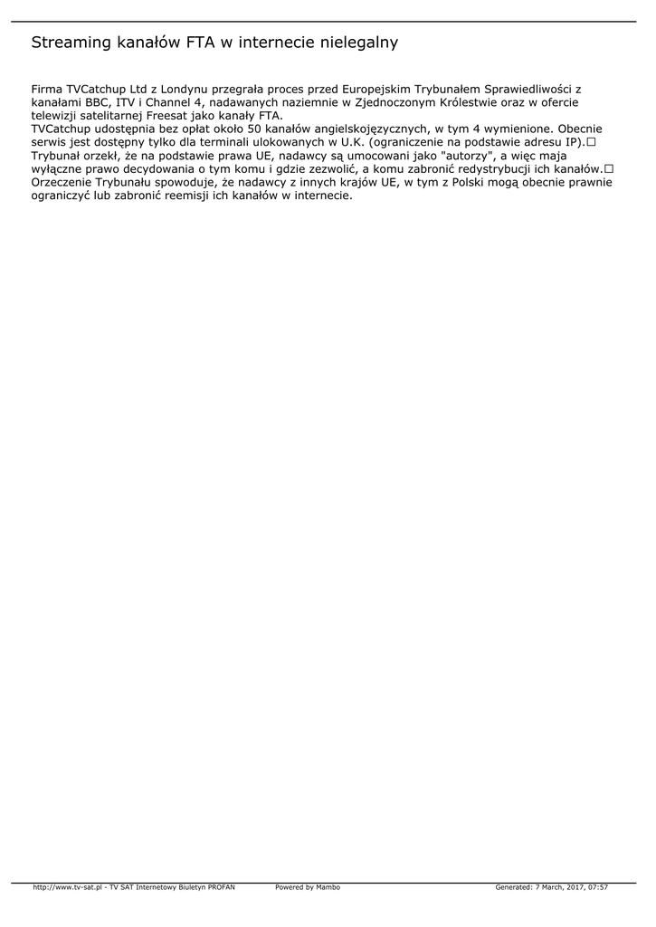 Streaming kanałów FTA w internecie nielegalny Firma TVCatchup Ltd z Londynu przegrała proces przed Europejskim Trybunałem Sprawiedliwości z kanałami BBC, ITV i Channel 4, nadawanych naziemnie w Zjednoczonym Królestwie oraz w ofercie telewizji satelitarnej Freesat jako kanały FTA. TVCatchup udostępnia bez opłat około 50 kanałów angielskojęzycznych, w tym 4 wymienione. Obecnie serwis jest dostępny tylko dla terminali ulokowanych w U.K. (ograniczenie na podstawie adresu IP). Trybunał orzekł, że na podstawie prawa UE, nadawcy są umocowani jako "autorzy", a więc maja wyłączne prawo decydowania o tym komu i gdzie zezwolić, a komu zabronić redystrybucji ich kanałów. Orzeczenie Trybunału spowoduje, że nadawcy z innych krajów UE, w tym z Polski mogą obecnie prawnie ograniczyć lub zabronić reemisji ich kanałów w internecie. http://www.tv-sat.pl - TV SAT Internetowy Biuletyn PROFAN Powered by Mambo Generated: 7 March, 2017, 07:57