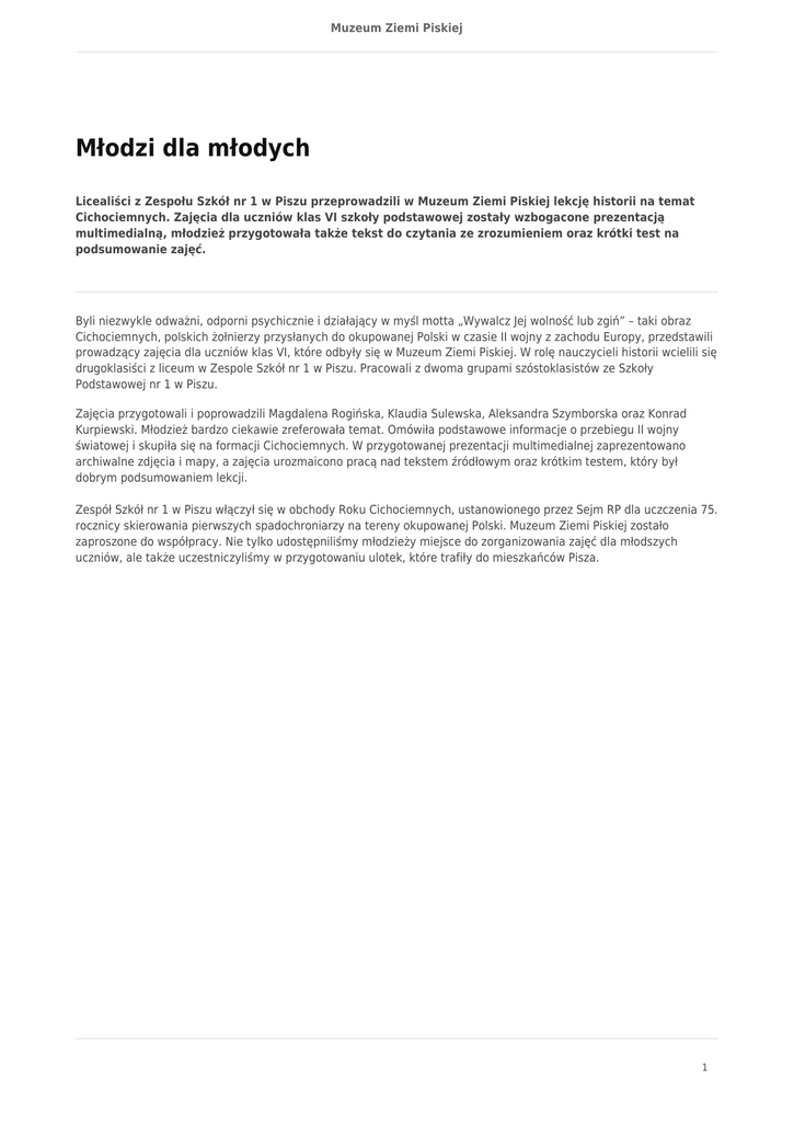Muzeum Ziemi Piskiej Młodzi dla młodych Licealiści z Zespołu Szkół nr 1 w Piszu przeprowadzili w Muzeum Ziemi Piskiej lekcję historii na temat Cichociemnych. Zajęcia dla uczniów klas VI szkoły podstawowej zostały wzbogacone prezentacją multimedialną, młodzież przygotowała także tekst do czytania ze zrozumieniem oraz krótki test na podsumowanie zajęć. Byli niezwykle odważni, odporni psychicznie i działający w myśl motta „Wywalcz Jej wolność lub zgiń” – taki obraz Cichociemnych, polskich żołnierzy przysłanych do okupowanej Polski w czasie II wojny z zachodu Europy, przedstawili prowadzący zajęcia dla uczniów klas VI, które odbyły się w Muzeum Ziemi Piskiej. W rolę nauczycieli historii wcielili się drugoklasiści z liceum w Zespole Szkół nr 1 w Piszu. Pracowali z dwoma grupami szóstoklasistów ze Szkoły Podstawowej nr 1 w Piszu. Zajęcia przygotowali i poprowadzili Magdalena Rogińska, Klaudia Sulewska, Aleksandra Szymborska oraz Konrad Kurpiewski. Młodzież bardzo ciekawie zreferowała temat. Omówiła podstawowe informacje o przebiegu II wojny światowej i skupiła się na formacji Cichociemnych. W przygotowanej prezentacji multimedialnej zaprezentowano archiwalne zdjęcia i mapy, a zajęcia urozmaicono pracą nad tekstem źródłowym oraz krótkim testem, który był dobrym podsumowaniem lekcji. Zespół Szkół nr 1 w Piszu włączył się w obchody Roku Cichociemnych, ustanowionego przez Sejm RP dla uczczenia 75. rocznicy skierowania pierwszych spadochroniarzy na tereny okupowanej Polski. Muzeum Ziemi Piskiej zostało zaproszone do współpracy. Nie tylko udostępniliśmy młodzieży miejsce do zorganizowania zajęć dla młodszych uczniów, ale także uczestniczyliśmy w przygotowaniu ulotek, które trafiły do mieszkańców Pisza. 1