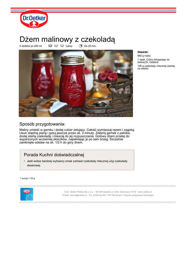 Dżem malinowy z czekoladą 5 słoików po 200 ml Łatwy Do 20 min. Składniki: 900 g malin 1 opak. Cukru żelującego ze stewią Dr. Oetkera 100 g czekolady mlecznej (startej na wiórki) Sposób przygotowania: Maliny umieść w garnku i dodaj cukier żelujący. Całość wymieszaj razem i zagotuj. Usuń zbędną pianę i gotuj jeszcze przez ok. 3 minuty. Zdejmij garnek z palnika, dodaj startą czekoladę i mieszaj do jej rozpuszczenia. Gotowy dżem przelej do wyparzonych wcześniej słoiczków, napełniając je po sam brzeg. Szczelnie zamknięte odstaw na ok. 1/2 h do góry dnem. Porada Kuchni doświadczalnej • Jeśli wolisz bardziej wytrawny smak zamiast czekolady mlecznej użyj czekolady deserowej. 1 porcja = 25 g © Dr. Oetker Polska Sp. z o.o. · 80-339 Gdańsk ul. Adm. Dickmana 14/15 · www.oetker.pl E-Mail: [email protected] · Tel. (Infolinia) 801 100 700 (koszt 1 impulsu połączenia lokalnego)