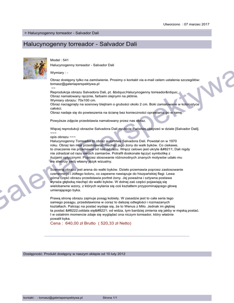 Utworzono : 07 marzec 2017 > Halucynogenny torreador - Salvador Dali Halucynogenny torreador - Salvador Dali Model : 541 Halucynogenny torreador - Salvador Dali a w ty Wymiary : - Obraz dostępny tylko na zamówienie. Prosimy o kontakt via e-mail celem ustalenia szczegółów: [email protected] ~~ Reprodukcja obrazu Salvadora Dali, pt. „Halucynogenny torreador”. Obraz namalowany ręcznie, farbami olejnymi na płótnie. Wymiary obrazu: 70x100 cm. Obraz naciągnięty na sosnowy blejtram o grubości około 2 cm. Boki zamalowane w kolorystyce całości. Obraz nadaje się do powieszenia na ścianę bez konieczności oprawiania go w ramę. Więcej reprodukcji obrazów Salvadora Dali możecie Państwo obejrzeć w dziale [Salvador Dali]. ~~~ opis obrazu ~~~ Halucynogenny Torreador to obraz autorstwa Salvadora Dali. Powstał on w 1970 roku. Obraz ten miał przedstawiać niechęć jego żony do walk byków. Co ciekawe, to znaczenie nie przemawia od nas od razu. Wręcz celowo jest ukryte – Dali nigdy nie zdradzał od razu swoich zamiarów. Potrafił doskonale łączyć symbolikę z iluzjami optycznymi. Poprzez stosowanie różnorodnych znanych motywów udało mu się stworzy swój własny język wizualny. a i r e l a G k e p rs Powyższe zdjęcie przedstawia namalowany przez nas obraz. e P Scenerią obrazu jest arena do walki byków. Dzieło przemawia poprzez zastosowanie czerwonego i żółtego koloru, co zapewne nawiązuje do hiszpańskiej flagi. Lewa górna część obrazu przedstawia portret żony. Jej poważna i sztywna postawa wyraża głęboką niechęć do walki byków. W dolnej zaś części pojawiają się wielobarwne wzory, z których wyłania się coś kształtem przypominającego głowę umierającego byka. Prawą stronę obrazu zajmuje posąg kobiety. W zasadzie jest to cała seria tego samego posągu, przedstawiona w coraz to dalszej odległości i rozmazanych kształtach. Patrząc na postać wydaje się, że to Wenus z Milo. Jednak im głębiej ta postać „oddala się” od widza, tym bardziej zmienia się jakby w męską postać. I w ostatnim momencie zdaje się wyglądać ona niczym torreador, który właśnie powalił byka. Cena : 640,00 zł Brutto ( 520,33 zł Netto) Dostępność: Produkt dostępny w naszym sklepie od 10 luty 2012 kontakt : - [email protected] Strona 1/1