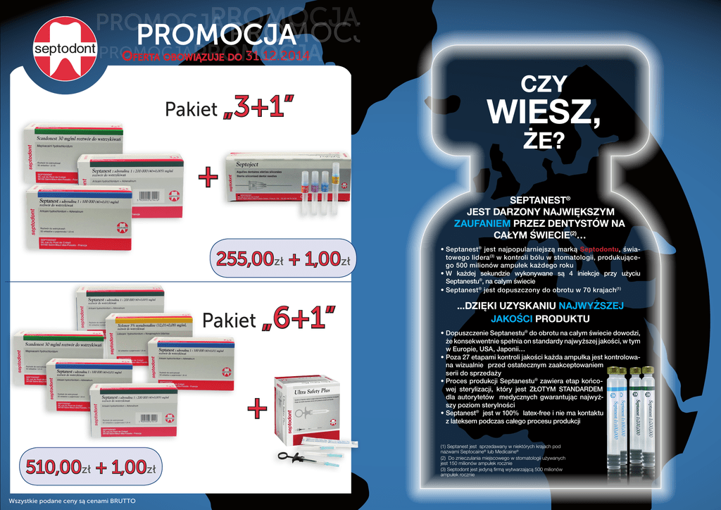 PROMOCJA PROMOCJA PROMOCJA PROMOCJA Oferta obowiązuje do 31.12.2014 PROMOCJA Pakiet „3+1” CZY WIESZ, ŻE? + SEPTANEST® JEST DARZONY NAJWIĘKSZYM ZAUFANIEM PRZEZ DENTYSTÓW NA CAŁYM ŚWIECIE(2)… 255,00zł + 1,00zł Pakiet „6+1” + 510,00zł + 1,00zł Wszystkie podane ceny są cenami BRUTTO •Septanest® jest najpopularniejszą marką Septodontu, światowego lidera(3) w kontroli bólu w stomatologii, produkującego 500 milionów ampułek każdego roku •W każdej sekundzie wykonywane są 4 iniekcje przy użyciu Septanestu®, na całym świecie •Septanest® jest dopuszczony do obrotu w 70 krajach(1) ...DZIĘKI UZYSKANIU NAJWYŻSZEJ JAKOŚCI PRODUKTU •Dopuszczenie Septanestu® do obrotu na całym świecie dowodzi, że konsekwentnie spełnia on standardy najwyższej jakości, w tym w Europie, USA, Japonii… •Poza 27 etapami kontroli jakości każda ampułka jest kontrolowana wizualnie przed ostatecznym zaakceptowaniem serii do sprzedaży •Proces produkcji Septanestu® zawiera etap końcowej sterylizacji, który jest ZŁOTYM STANDARDEM dla autorytetów medycznych gwarantując najwyższy poziom sterylności •Septanest® jest w 100% latex-free i nie ma kontaktu z lateksem podczas całego procesu produkcji (1) Septanest jest sprzedawany w niektórych krajach pod nazwami Septocaine® lub Medicaine® (2) Do znieczulania miejscowego w stomatologii używanych jest 150 milionów ampułek rocznie (3) Septodont jest jedyną firmą wytwarzającą 500 milionów ampułek rocznie NOWE PRZEPISY DOTYCZACE ZRANIENIA IGŁA? Septoject - standardowe igły do wszystkich rodzajów znieczuleń BADZ BEZPIECZNY Właściwości i zalety • Doskonała penetracja tkanek uzyskana dzięki wysokiej jakości polerowanych i silikonowanych igieł z potrójnym skosem. • Rurka z nierdzewnej wysokiej jakości stali chirurgicznej zmniejsza ryzyko złamania. • Wskaźnik skosu zapewnia dobrą orientację ustawienia igły do wkłucia. • Plastikowe kapturki dostosowane zarówno do wymiarów metrycznych jak i amerykańskich. ZGODNIE Z NOWYMI REGULACJAMI1! ULTRA SAFETY PLUS XL BEZPIECZNY SYSTEM DO INIEKCJI 2 Uchwyt do sterylizacji w autoklawie Przezroczysty cylinder sprawia, że aspiracja jest łatwo widoczna Możliwość ponownego załadowania ampułki, idealne dla długich zabiegów Przesuwana osłonka igły chroni przed zakłuciem Dyrektywa Rady 2010/32/EU z 10 maja 2010 oraz rozporządzenie Ministra Zdrowia z 6 czerwca 2013 Septodont jest jedyną firmą produkującą 500 milionów ampułek ze znieczuleniami rocznie Źródło dane SDM, YTD Q3 2012 Jako światowy lider kontroli bólu w stomatologii Septodont rozwiązuje zwiększone zapotrzebowanie na proste i bezpieczne systemy do iniekcji spełniające wymagania nowych regulacji unijnych. Przez lata system Ultra Safety Plus XL udowodnił swoją skuteczność i łatwość użycia stając się standardem dla bezpiecznych systemów do iniekcji z ochroną przed zakłuciem igłą we wszystkich anestetycznych procedurach w stomatologii. Jednym z przykładów jest Wielka Brytania, gdzie Ultra Safety Plus stanowi ponad 45% systemów do iniekcji stosowanych 3 w gabinetach dentystycznych i szpitalach . System Ultra Safety Plus XL oferowany jest z igłami o różnej długości a uchwyt można wybrać sterylny, jednorazowego użycia lub do sterylizacji w autoklawie. 1 2 3 Ultra Safety Plus XL. Bądź bezpieczny. Długość Średnica Extra krótkie – 8, 12mm 30G = 0,30mm Extra krótkie – 12mm 27G = 0,40mm Kod kolorystyczny Krótkie - 16, 21, 23, 25mm 30G = 0,30mm Krótkie - 16, 21, 25mm 27G = 0,40mm Długie - 35mm 27G = 0,40mm Każdemu dentyście zdarzają się trudności z wkłuciem igły i torem jej wprowadzania, co często przekłada się bezpośrednio na odczucie bólu przez pacjenta, zarówno w trakcie iniekcji, jak i po jej zakończeniu. Przyczyny tych trudności dla lekarza i dyskomfortu dla pacjenta są często związane nie tyle z techniką wykonywania zabiegu, co z konstrukcją samej igły. W trakcie niezależnych badań klinicznych, których wyniki zostały opublikowane w roku 2005, analizowano pod mikroskopem elektronowym siedem najczęściej stosowanych rodzajów jednorazowych igieł stomatologicznych. W ramach tych badań stwierdzono różne wady produkcyjne występującena ostrzu igieł, takie jak zadziory, wyszczerbione krawędzie i stępione ostrza. Inni producenci Septoject Badania porównawcze wykazały, że spośród siedmiu znanych producentów. “… najlepszą jakością odznaczały się igły Septoject firmy Septodont” Septodont Polska sp. z o.o. 02-829 Warszawa, ul. Taneczna 18 A tel.: 22 545-89-50 do 52, fax: 22 641-80-21 www.septodont.com.pl