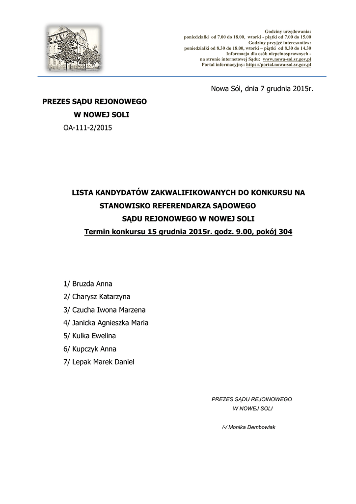 Godziny urzędowania: poniedziałki od 7.00 do 18.00, wtorki - piątki od 7.00 do 15.00 Godziny przyjęć interesantów: poniedziałki od 8.30 do 18.00, wtorki – piątki od 8.30 do 14.30 Informacja dla osób niepełnosprawnych na stronie internetowej Sądu: www.nowa-sol.sr.gov.pl Portal informacyjny: https://portal.nowa-sol.sr.gov.pl Nowa Sól, dnia 7 grudnia 2015r. PREZES SĄDU REJONOWEGO W NOWEJ SOLI OA-111-2/2015 LISTA KANDYDATÓW ZAKWALIFIKOWANYCH DO KONKURSU NA STANOWISKO REFERENDARZA SĄDOWEGO SĄDU REJONOWEGO W NOWEJ SOLI Termin konkursu 15 grudnia 2015r. godz. 9.00, pokój 304 1/ Bruzda Anna 2/ Charysz Katarzyna 3/ Czucha Iwona Marzena 4/ Janicka Agnieszka Maria 5/ Kulka Ewelina 6/ Kupczyk Anna 7/ Lepak Marek Daniel PREZES SĄDU REJOINOWEGO W NOWEJ SOLI /-/ Monika Dembowiak