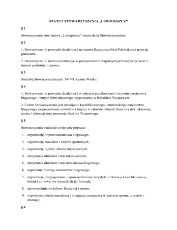STATUT STOWARZYSZENIA „LUBOGOSZCZ” §1 Stowarzyszenie nosi nazwę „Lubogoszcz" zwane dalej Stowarzyszeniem. §2 1. Stowarzyszenie prowadzi działalność na terenie Rzeczpospolitej Polskiej oraz poza jej granicami. 2. Stowarzyszenie może uczestniczyć w podejmowaniu wspólnych przedsięwzięć wraz z innymi podmiotami prawa. §3 Siedzibą Stowarzyszenia jest: 34-741 Kasina Wielka. §4 1. Stowarzyszenie prowadzi działalność w zakresie popularyzacji i rozwoju narciarstwa biegowego i innych form aktywnego wypoczynku w Beskidzie Wyspowym. 2. Celem Stowarzyszenia jest rozwijanie kwalifikowanego i amatorskiego narciarstwa biegowego, organizowanie zawodów i imprez w zakresie różnych form turystyki aktywnej, sportu i rekreacji oraz promocja Beskidu Wyspowego. §5 Stowarzyszenie realizuje swoje cele poprzez: 1. organizację imprez narciarstwa biegowego, 2. organizację zawodów i imprez sportowych, 3. organizację rajdów, złazów turystycznych, 4. utrzymanie obiektów i tras turystycznych, 5. utrzymanie obiektów i tras narciarstwa biegowego, 6. wspieranie rozwoju narciarstwa biegowego, 7. organizację, propagowanie i upowszechnianie turystyki i rekreacji kwalifikowanej letniej i zimowej we wszystkich jej formach, 8. upowszechnianie kultury fizycznej i sportu, 9. współpracę międzynarodową i integrację europejską w zakresie sportu, turystyki i rekreacji. §6 1. Działalność Stowarzyszenia oparta jest przede wszystkim na pracy społecznej Członków. §7 1. Stowarzyszenie jest dobrowolnym, samorządnym i trwałym zrzeszeniem o celach statutowych. 2. Członkami Stowarzyszenia mogą być osoby fizyczne i prawne. Osoba prawna może być jedynie Członkiem Wspierającym Stowarzyszenia. §8 Członkowie Stowarzyszenia dzielą się na: 1. Zwyczajnych 2. Wspierających 3. Honorowych §9 1. Członkiem zwyczajnym Stowarzyszenia może zostać osoba fizyczna z Polski i zagranicy, posiadająca pełną zdolność do czynności prawnych z chwilą podpisania deklaracji członkowskiej. 2. Członkiem wspierającym może zostać osoba prawna i fizyczna, deklarująca pomoc materialną na rzecz Stowarzyszenia. 3. Członkiem honorowym Stowarzyszenia może zostać osoba fizyczna, która wniosła wybitny wkład w działalność i rozwój Stowarzyszenia. 4. Członków zwyczajnych i wspierających przyjmuje Zarząd Stowarzyszenia. 5. Członkowie honorowi przyjmowani są przez Walne Zebranie na wniosek 10 (dziesięciu) Członków Stowarzyszenia. § 10 Członkowie zwyczajni mają prawo: 1. Biernego i czynnego uczestniczenia w wyborach do władz Stowarzyszenia. 2. Współdecydować o sprawach Stowarzyszenia zgodnie ze Statutem. 3. Zgłaszać postulaty i wnioski do władz Stowarzyszenia. § 11 Członkowie zwyczajni są zobowiązani: 1. Przestrzegać postanowień Statutu, regulaminów oraz uchwał władz Związku. 2. Czynnie działać na rzecz realizacji celów statutowych Stowarzyszenia. 3. Regularnie opłacać składki członkowskie. § 12 1. Członkowie wspierający i honorowi nie posiadają biernego oraz czynnego prawa wyborczego. Mogą jednak brać udział z głosem doradczym w statutowych władzach Stowarzyszenia, poza tym posiadają takie prawa jak Członkowie zwyczajni. 2. Członek wspierający ma obowiązek wywiązywania się z zadeklarowanych świadczeń, przestrzegania statutu oraz uchwał władz Stowarzyszenia. 3. Członkowie honorowi są zwolnieni ze składek członkowskich. § 13 Utrata członkostwa może nastąpić przez : 1. dobrowolne wystąpienie ze Stowarzyszenia. 2. wydalenie ze Stowarzyszenia uchwałą Zarządu wskutek działań sprzecznych ze Statutem lub nieopłacenie składek przez okres przekraczający 12 miesięcy. 3. śmierci Członka oraz utraty osobowości prawnej przez osoby prawne. 4. Od uchwały o wydaleniu przysługuje odwołanie do Walnego Zebrania w terminie 30 dni od daty podjęcia uchwały przez Zarząd. § 14 Władzami Stowarzyszenia są: 1. Walne Zebranie Członków. 2. Zarząd Stowarzyszenia. 3. Komisja Rewizyjna. § 15 1. Kadencja wszystkich władz wybieranych Stowarzyszenia trwa 3 (trzy) lata. 2. Wybór władz odbywa się w głosowaniu tajnym, chyba, że większość obecnych zdecyduje za głosowaniem jawnym. 3. Władze Stowarzyszenia wybierane są spośród Członków zwyczajnych Stowarzyszenia. 4. Uchwały wszystkich władz Stowarzyszenia zapadają zwykłą większością głosów przy obecności co najmniej połowy Członków uprawnionych do głosowania, chyba, że dalsze postanowienia Statutu stanowią inaczej. § 16 1. Walne Zebranie Członków jest najwyższą władzą Stowarzyszenia. 2. Walne Zebranie Członków może być Zwyczajne i Nadzwyczajne. 3. Walne Zebranie Członków Zwyczajne jest zwoływane raz na rok przez Zarząd Stowarzyszenia do 30 marca danego roku. Termin i miejsce obrad Zarząd podaje do wiadomości wszystkich Członków co najmniej na 7 (siedem) dni przed terminem zebrania. 4. Walne Zebranie Członków Nadzwyczajne winno być zwołane na wniosek Zarządu, Komisji Rewizyjnej lub pisemny wniosek co najmniej 1/3 (jednej trzeciej) ogólnej liczby Członków zwyczajnych Stowarzyszenia. 5. Uchwały Walnego Zebrania Członków zapadają bezwzględną większością głosów w obecności połowy ogólnej liczby Członków. § 17 1. Do kompetencji Walnego Zebrania Zwyczajnego członków należy: 1.1. uchwalanie ogólnych kierunków działalności Stowarzyszenia. 1.2. uchwalanie zmian w Statucie. 1.3. wybór i odwoływanie Zarządu Stowarzyszenia i Komisji Rewizyjnej. 1.4. rozpatrywanie sprawozdań z działalności Zarządu i Komisji Rewizyjnej. 1.5. rozpatrywanie i zatwierdzanie rocznych sprawozdań finansowych. 1.6. uchwalanie budżetu. 1.7. uchwalanie wysokości składek członkowskich. 1.8. podejmowanie uchwał w sprawie przyjęcia Członka honorowego. 1.9. udzielanie Zarządowi absolutorium na wniosek Komisji Rewizyjnej. 1.10. rozpatrywanie wniosków i postulatów zgłoszonych przez Członków Stowarzyszenia lub jego władze. 1.11. rozpatrywa
