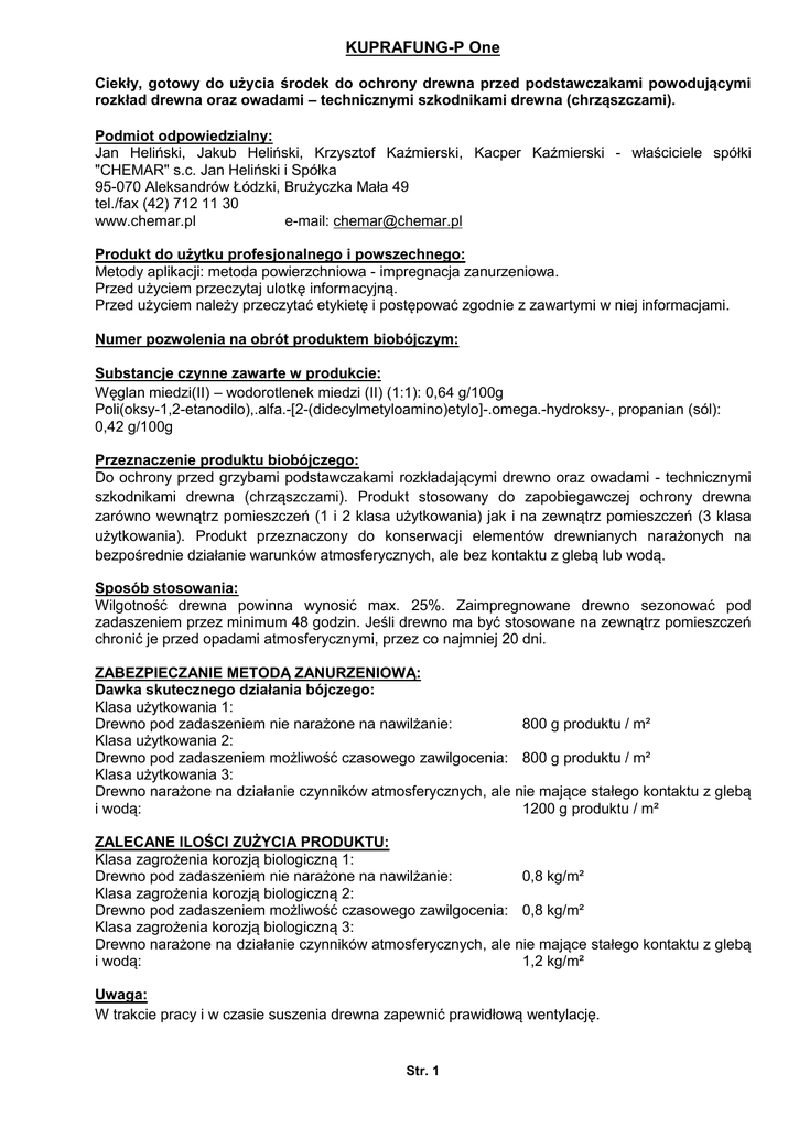 KUPRAFUNG-P One Ciekły, gotowy do użycia środek do ochrony drewna przed podstawczakami powodującymi rozkład drewna oraz owadami – technicznymi szkodnikami drewna (chrząszczami). Podmiot odpowiedzialny: Jan Heliński, Jakub Heliński, Krzysztof Kaźmierski, Kacper Kaźmierski - właściciele spółki "CHEMAR" s.c. Jan Heliński i Spółka 95-070 Aleksandrów Łódzki, Brużyczka Mała 49 tel./fax (42) 712 11 30 www.chemar.pl e-mail: [email protected] Produkt do użytku profesjonalnego i powszechnego: Metody aplikacji: metoda powierzchniowa - impregnacja zanurzeniowa. Przed użyciem przeczytaj ulotkę informacyjną. Przed użyciem należy przeczytać etykietę i postępować zgodnie z zawartymi w niej informacjami. Numer pozwolenia na obrót produktem biobójczym: Substancje czynne zawarte w produkcie: Węglan miedzi(II) – wodorotlenek miedzi (II) (1:1): 0,64 g/100g Poli(oksy-1,2-etanodilo),.alfa.-[2-(didecylmetyloamino)etylo]-.omega.-hydroksy-, propanian (sól): 0,42 g/100g Przeznaczenie produktu biobójczego: Do ochrony przed grzybami podstawczakami rozkładającymi drewno oraz owadami - technicznymi szkodnikami drewna (chrząszczami). Produkt stosowany do zapobiegawczej ochrony drewna zarówno wewnątrz pomieszczeń (1 i 2 klasa użytkowania) jak i na zewnątrz pomieszczeń (3 klasa użytkowania). Produkt przeznaczony do konserwacji elementów drewnianych narażonych na bezpośrednie działanie warunków atmosferycznych, ale bez kontaktu z glebą lub wodą. Sposób stosowania: Wilgotność drewna powinna wynosić max. 25%. Zaimpregnowane drewno sezonować pod zadaszeniem przez minimum 48 godzin. Jeśli drewno ma być stosowane na zewnątrz pomieszczeń chronić je przed opadami atmosferycznymi, przez co najmniej 20 dni. ZABEZPIECZANIE METODĄ ZANURZENIOWĄ: Dawka skutecznego działania bójczego: Klasa użytkowania 1: Drewno pod zadaszeniem nie narażone na nawilżanie: 800 g produktu / m² Klasa użytkowania 2: Drewno pod zadaszeniem możliwość czasowego zawilgocenia: 800 g produktu / m² Klasa użytkowania 3: Drewno narażone na działanie czynników atmosferycznych, ale nie mające stałego kontaktu z glebą i wodą: 1200 g produktu / m² ZALECANE ILOŚCI ZUŻYCIA PRODUKTU: Klasa zagrożenia korozją biologiczną 1: Drewno pod zadaszeniem nie narażone na nawilżanie: 0,8 kg/m² Klasa zagrożenia korozją biologiczną 2: Drewno pod zadaszeniem możliwość czasowego zawilgocenia: 0,8 kg/m² Klasa zagrożenia korozją biologiczną 3: Drewno narażone na działanie czynników atmosferycznych, ale nie mające stałego kontaktu z glebą i wodą: 1,2 kg/m² Uwaga: W trakcie pracy i w czasie suszenia drewna zapewnić prawidłową wentylację. Str. 1 Przechowywanie, transport i odpady. Przechowywać w bezpiecznym miejscu w oryginalnych, oznakowanych i zamkniętych pojemnikach w chłodnym, suchych i dobrze wentylowanych pomieszczeniach, z dala od środków spożywczych i pasz, w miejscach niedostępnych dla dzieci. W transporcie zabezpieczyć przed przesuwaniem się, uszkodzeniem lub zniszczeniem. Pojemniki, które zostały otwarte muszą być ponownie szczelnie zamknięte i przechowywane w pozycji pionowej, aby zapobiec wyciekom. Unikać zrzutów do środowiska. Wszelkie wycieki zbierać do ponownego wykorzystania lub utylizacji. Postępować zgodnie z instrukcją lub kartą charakterystyki. Odpady produktu: Odpad produktu jest odpadem niebezpiecznym, jeżeli to możliwe należy go odzyskać i zawrócić do produkcji. Nie utylizować razem z odpadami komunalnymi. Nie usuwać do kanalizacji. Nie dopuszczać do zanieczyszczenia wód powierzchniowych, gruntowych i gleby. Utylizować zgodnie z obowiązującymi aktualnie przepisami odnoszącymi się do niebezpiecznych odpadów chemicznych. Poddać unieszkodliwieniu, wyłącznie w miejscach wyznaczonych, w instalacjach lub urządzeniach spełniających ustawowe wymagania. Opakowanie: Przekazać do utylizacji przedsiębiorstwom wyspecjalizowanym w utylizacji odpadów opakowaniowych. Popłuczyny po myciu opakowań dodawać do kąpieli roboczej lub traktować jak odpady produktu. Znak rodzaju materiału, z którego wykonano opakowanie umieszczono na nim podczas jego produkcji. Nie utylizować razem z odpadami komunalnymi. Poddać unieszkodliwieniu, wyłącznie w miejscach wyznaczonych, w instalacjach lub urządzeniach spełniających ustawowe wymagania. Po wypłukaniu wodą opakowanie można oddać do Producenta w celu ponownego wykorzystania. Warunki BHP R52/53 S24/25 S46 S61 Działa szkodliwie na organizmy wodne; może powodować długo utrzymujące się niekorzystne zmiany w środowisku wodnym Unikać zanieczyszczenia skóry i oczu W razie połknięcia niezwłocznie zasięgnij porady lekarza - pokaż opakowanie lub etykietę Unikać zrzutów do środowiska. Postępować zgodnie z instrukcją lub kartą charakterystyki Przed użyciem przeczytaj załączoną ulotkę. Podczas pracy z produktem wymagane są okulary ochronne i maski ochronne oraz odzież ochronna (kombinezony, rękawice ochronne z materiałów odpornych na działanie alkaliów i obuwie ochronne). Unikać zanieczyszczenia wyposażenia ochronnego. Przed jedzeniem, piciem, paleniem oraz po pracy umyć ręce, i odsłoniętą skórę. Unikać zanieczyszczenia skóry i oczu. Unikać kontaktu z ubraniem. Natychmiast zdjąć zanieczyszczoną odzież. Zanieczyszczone rękawice powinny być czyszczone lub usuwane. Nie dopuścić, aby woda użyta do czyszczenia rękawic dostała się do gleby, wód powierzchniowych i kanalizacji. Stosować w dobrze wentylowanych pomieszczeniach. Pierwsza pomoc: W przypadku wystąpienia jakichkolwiek niepokojących objawów wezwać natychmiast lekarza lub odwieźć poszkodowanego do szpitala, pokazać opakowanie lub etykietkę produktu. W kontakcie ze skórą: zanieczyszczone partie skóry zmyć dokładnie wodą. W kontakcie z oczami: zanieczyszczone oczy przepłukać obficie wodą. Po połknięciu: wypłukać usta a następnie wypić duże ilości wo