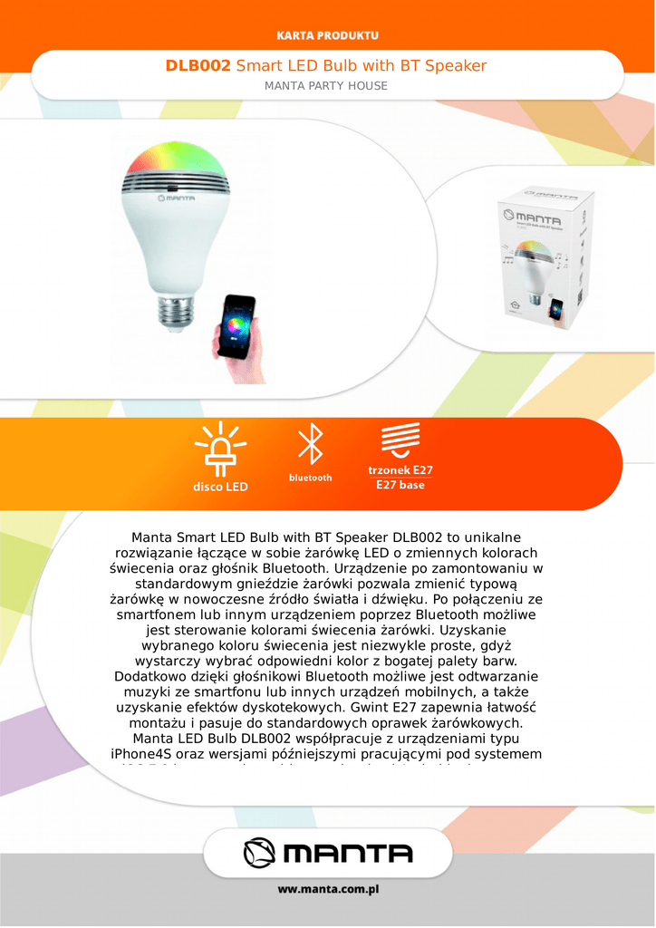 DLB002SmartLEDBulbwithBTSpeaker MANTAPARTYHOUSE MantaSmartLEDBulbwithBTSpeakerDLB002tounikalne rozwiązaniełączącewsobieżarówkęLEDozmiennychkolorach świeceniaorazgłośnikBluetooth.Urządzeniepozamontowaniuw standardowymgnieździeżarówkipozwalazmienićtypową żarówkęwnowoczesneźródłoświatłaidźwięku.Popołączeniuze smartfonemlubinnymurządzeniempoprzezBluetoothmożliwe jeststerowaniekoloramiświeceniażarówki.Uzyskanie wybranegokoloruświeceniajestniezwykleproste,gdyż wystarczywybraćodpowiednikolorzbogatejpaletybarw. DodatkowodziękigłośnikowiBluetoothmożliwejestodtwarzanie muzykizesmartfonulubinnychurządzeńmobilnych,atakże uzyskanieefektówdyskotekowych.GwintE27zapewniałatwość montażuipasujedostandardowychoprawekżarówkowych. MantaLEDBulbDLB002współpracujezurządzeniamitypu iPhone4Sorazwersjamipóźniejszymipracującymipodsystemem iOS7.0inowszymi,atakżeurządzeniamiAndroidodsystemu DLB002SmartLEDBulbwithBTSpeaker MANTAPARTYHOUSE Specyfikacja MantaDLB002tomałaisprytnażarówka,któraw dowolnejchwilizamienipokójnastolatkaw imprezowyklimat.Totakżedoskonałyiniedrogi pomysłnaoryginalnyprezent. Dodatkowożarówkęmożemypodłączyć bezpośredniodokontaktubezkonieczności używaniagwintulampypoprzezdedykowany adapterMantaE27DLB001A(dostępnyosobno). Jasność 400lm Wbudowanegłośniki TAK,5W,40Hz-18kHz Zasilanie AC100-240V50-60Hz Dodatkowefunkcje sterowaniesmartfonem,zmianakoloruRGB, odtwarzaniemuzyki,wybórgodzinpracy Zniekształcenia poniżej1% Mocurządzenia 15W Rodzajgwintu E27 http://www.manta.com.pl/pl/dlb002 EAN:5907377868095