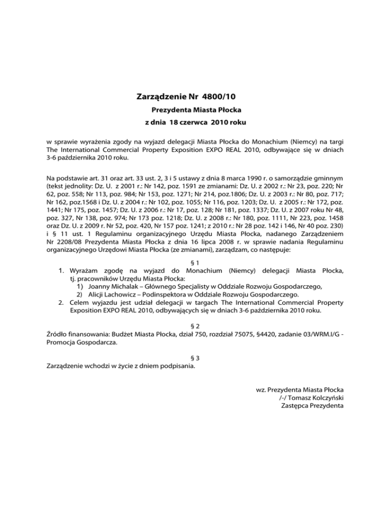 Zarządzenie Nr 4800/10……. Prezydenta Miasta Płocka z dnia 18 czerwca 2010 roku w sprawie wyrażenia zgody na wyjazd delegacji Miasta Płocka do Monachium (Niemcy) na targi The International Commercial Property Exposition EXPO REAL 2010, odbywające się w dniach 3-6 października 2010 roku. Na podstawie art. 31 oraz art. 33 ust. 2, 3 i 5 ustawy z dnia 8 marca 1990 r. o samorządzie gminnym (tekst jednolity: Dz. U. z 2001 r.: Nr 142, poz. 1591 ze zmianami: Dz. U. z 2002 r.: Nr 23, poz. 220; Nr 62, poz. 558; Nr 113, poz. 984; Nr 153, poz. 1271; Nr 214, poz.1806; Dz. U. z 2003 r.: Nr 80, poz. 717; Nr 162, poz.1568 i Dz. U. z 2004 r.: Nr 102, poz. 1055; Nr 116, poz. 1203; Dz. U. z 2005 r.: Nr 172, poz. 1441; Nr 175, poz. 1457; Dz. U. z 2006 r.: Nr 17, poz. 128; Nr 181, poz. 1337; Dz. U. z 2007 roku Nr 48, poz. 327, Nr 138, poz. 974; Nr 173 poz. 1218; Dz. U. z 2008 r.: Nr 180, poz. 1111, Nr 223, poz. 1458 oraz Dz. U. z 2009 r. Nr 52, poz. 420, Nr 157 poz. 1241; z 2010 r.: Nr 28 poz. 142 i 146, Nr 40 poz. 230) i § 11 ust. 1 Regulaminu organizacyjnego Urzędu Miasta Płocka, nadanego Zarządzeniem Nr 2208/08 Prezydenta Miasta Płocka z dnia 16 lipca 2008 r. w sprawie nadania Regulaminu organizacyjnego Urzędowi Miasta Płocka (ze zmianami), zarządzam, co następuje: §1 1. Wyrażam zgodę na wyjazd do Monachium (Niemcy) delegacji Miasta Płocka, tj. pracowników Urzędu Miasta Płocka: 1) Joanny Michalak – Głównego Specjalisty w Oddziale Rozwoju Gospodarczego, 2) Alicji Lachowicz – Podinspektora w Oddziale Rozwoju Gospodarczego. 2. Celem wyjazdu jest udział delegacji w targach The International Commercial Property Exposition EXPO REAL 2010, odbywających się w dniach 3-6 października 2010 roku. §2 Źródło finansowania: Budżet Miasta Płocka, dział 750, rozdział 75075, §4420, zadanie 03/WRM.I/G Promocja Gospodarcza. §3 Zarządzenie wchodzi w życie z dniem podpisania. wz. Prezydenta Miasta Płocka /-/ Tomasz Kolczyński Zastępca Prezydenta UZASADNIENIE Międzynarodowe Targi Nieruchomości Inwestycyjnych EXPO REAL, odbywające się w dniach 3-6 października 2010 r., organizowane są w tym roku po raz trzynasty, zdobyły sobie obok targów takich jak MIPIM w Cannes, czy CITYSCAPE w Dubaju niekwestionowaną pozycję jednego z absolutnych liderów targów inwestycyjnych na świecie a ich dynamika rozwoju jest niespotykana w całej branży targowej. Impreza ta cieszy się ogromnym i rosnącym zainteresowaniem całej branży nieruchomości. Na ubiegłorocznej edycji targów liczba uczestników wyniosła prawie 36 tys. (14 750 wystawców z 1580 firm z 34 krajów). Na targach, oprócz miast i regionów, gromadzą się m.in. deweloperzy, strefy ekonomiczne, przedstawiciele inwestorów, firmy doradcze oraz firmy budowlane. Krajami najczęściej odwiedzającymi imprezę oprócz Niemiec są: Wielka Brytania, Austria, Holandia, Szwajcaria, Polska, Francja, Czechy, USA, Rosja i Luksemburg. Targi objęte są całkowicie systemem rejestracji i przeznaczone wyłącznie dla specjalistów z branży. Koszty związane z uczestnictwem w targach, przelotem, zakwaterowaniem oraz koszty diet zostaną pokryte z Budżetu Miasta Płocka.