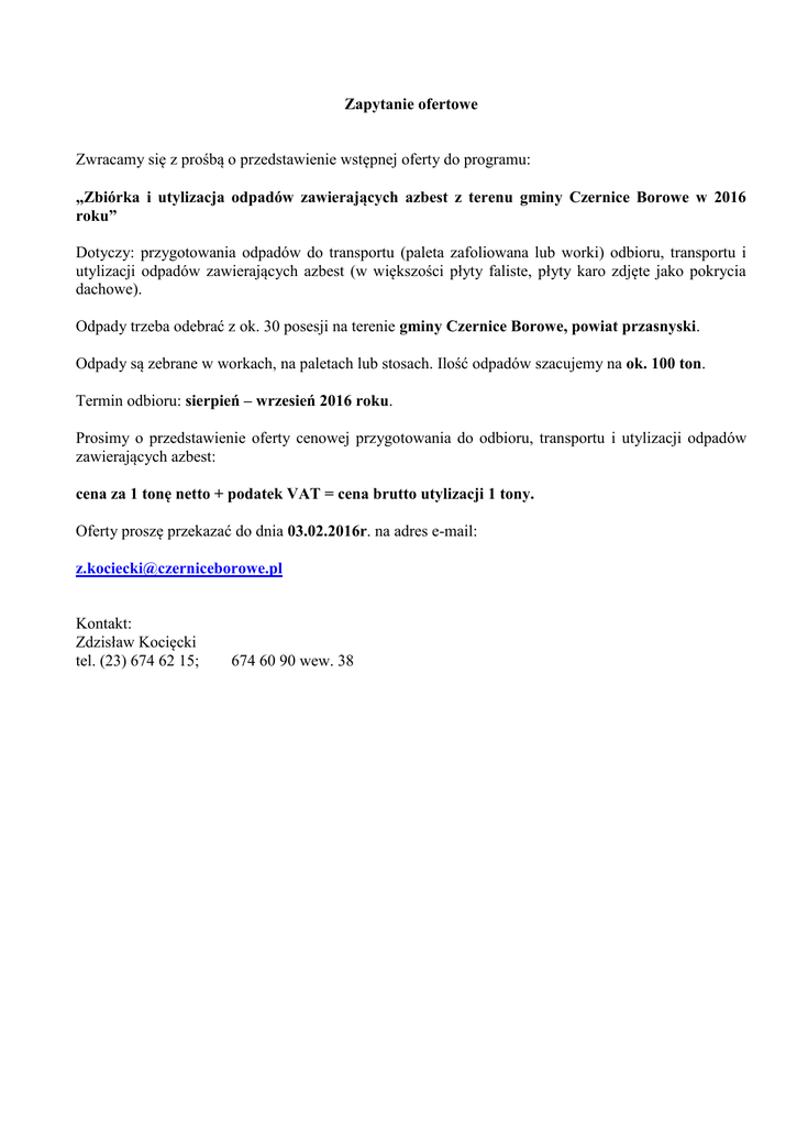 Zapytanie ofertowe Zwracamy się z prośbą o przedstawienie wstępnej oferty do programu: „Zbiórka i utylizacja odpadów zawierających azbest z terenu gminy Czernice Borowe w 2016 roku” Dotyczy: przygotowania odpadów do transportu (paleta zafoliowana lub worki) odbioru, transportu i utylizacji odpadów zawierających azbest (w większości płyty faliste, płyty karo zdjęte jako pokrycia dachowe). Odpady trzeba odebrać z ok. 30 posesji na terenie gminy Czernice Borowe, powiat przasnyski. Odpady są zebrane w workach, na paletach lub stosach. Ilość odpadów szacujemy na ok. 100 ton. Termin odbioru: sierpień – wrzesień 2016 roku. Prosimy o przedstawienie oferty cenowej przygotowania do odbioru, transportu i utylizacji odpadów zawierających azbest: cena za 1 tonę netto + podatek VAT = cena brutto utylizacji 1 tony. Oferty proszę przekazać do dnia 03.02.2016r. na adres e-mail: [email protected] Kontakt: Zdzisław Kocięcki tel. (23) 674 62 15; 674 60 90 wew. 38