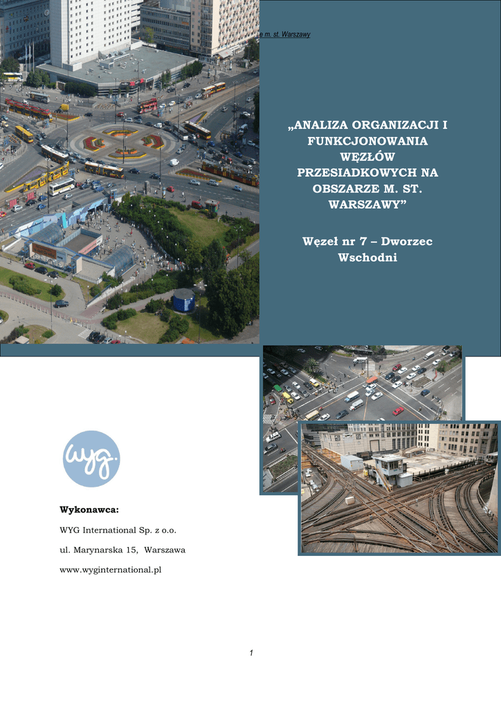 Analiza organizacji i funkcjonowania węzłów przesiadkowych na obszarze m. st. Warszawy „ANALIZA ORGANIZACJI I FUNKCJONOWANIA WĘZŁÓW PRZESIADKOWYCH NA OBSZARZE M. ST. WARSZAWY” Węzeł nr 7 – Dworzec Wschodni DO ROKU Wykonawca: WYG International Sp. z o.o. ul. Marynarska 15, Warszawa www.wyginternational.pl 1 Analiza organizacji i funkcjonowania węzłów przesiadkowych na obszarze m. st. Warszawy WARSZAWA, grudzień 2010 Spis treści 1. Syntetyczny opis węzła przesiadkowego..........................................................................................................6 2. Częstotliwości kursowania.................................................................................................................................9 3. Macierze i odległości czasów przejścia miedzy pomiędzy platformami i przystankami komunikacji publicznej.................................................................................................................................................21 4. Obserwacje i rekomendacje działań usprawniających funkcjonowanie węzła przesiadkowego..............24 Spis tabel i wykresów Tabela 1. Opis węzła................................................................................................................................................6 Tabela 2. Liczba kursów linii transportu zbiorowego dla poszczególnych przystanków................................7 Tabela 3. Macierz czasów standardowych [min/max]........................................................................................21 Tabela 4. Macierz odległości dla osób o obniżonej sprawności ruchowej......................................................22 Tabela 5. Macierz odległości................................................................................................................................23 Wykres 1. Częstotliwości kursowania w godzinach 7:00 – 10:00 na przystanku Dw. Wschodni Kijowska 01.................................................................................................................................................................9 Wykres 2. Częstotliwości kursowania w godzinach 7:00 – 10:00 na przystanku Dw. Wschodni Kijowska 02.................................................................................................................................................................9 Wykres 3. Częstotliwości kursowania w godzinach 7:00 – 10:00 na przystanku Dw. Wschodni Kijowska 04...............................................................................................................................................................10 Wykres 4. Częstotliwości kursowania w godzinach 7:00 – 10:00 na przystanku Dw. Wschodni Kijowska 05...............................................................................................................................................................11 Wykres 5. Częstotliwości kursowania w godzinach 7:00 – 10:00 na przystanku Dw. Wschodni Kijowska 06...............................................................................................................................................................11 2 Analiza organizacji i funkcjonowania węzłów przesiadkowych na obszarze m. st. Warszawy Wykres 6. Częstotliwości kursowania w godzinach 7:00 – 10:00 na przystanku Dw. Wschodni Kijowska 08...............................................................................................................................................................11 Wykres 7. Częstotliwości kursowania w godzinach 7:00 – 10:00 na przystanku Dw. Wschodni Kijowska 09...............................................................................................................................................................12 Wykres 8. Częstotliwości kursowania w godzinach 7:00 – 10:00 na przystanku Dw. Wschodni Kijowska 11...............................................................................................................................................................12 Wykres 9. Częstotliwości kursowania w godzinach 7:00 – 10:00 na przystanku Dw. Wschodni Kijowska 12...............................................................................................................................................................12 Wykres 10. Częstotliwości kursowania w godzinach 7:00 – 10:00 na przystanku Dw. Wschodni Lubelska 01...............................................................................................................................................................13 Wykres 11. Częstotliwości kursowania w godzinach 7:00 – 10:00 na przystanku Dw. Wschodni Lubelska 02...............................................................................................................................................................13 Wykres 12. Częstotliwości kursowania w godzinach 7:00 – 10:00 na przystanku Dw. Wschodni Lubelska 03...............................................................................................................................................................13 Wykres 13. Częstotliwości kursowania w godzinach 12:00 – 14:00 na przystanku Dw. Wschodni Kijowska 01...............................................................................................................................................................14 Wykres 14. Częstotliwości kursowania w godzinach 12:00 – 14:00 na przystanku Dw. Wschodni Kijowska 02...............................................................................................................................................................14 Wykres 15. Częstotliwości kursowania w godzinach 12:00 – 14:00 na przystanku Dw. Wschodni Kijowska 04...............................................................................................................................................................14 Wykres 16. Częstotliwości kursowania w godzinac
