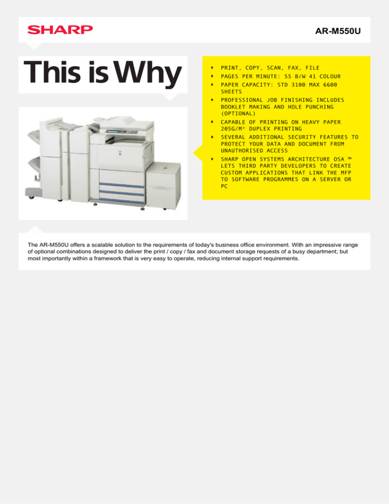 AR-M550U PRINT, COPY, SCAN, FAX, FILE PAGES PER MINUTE: 55 B/W 41 COLOUR PAPER CAPACITY: STD 3100 MAX 6600 SHEETS PROFESSIONAL JOB FINISHING INCLUDES BOOKLET MAKING AND HOLE PUNCHING (OPTIONAL) CAPABLE OF PRINTING ON HEAVY PAPER 205G/M² DUPLEX PRINTING SEVERAL ADDITIONAL SECURITY FEATURES TO PROTECT YOUR DATA AND DOCUMENT FROM UNAUTHORISED ACCESS SHARP OPEN SYSTEMS ARCHITECTURE OSA ™ LETS THIRD PARTY DEVELOPERS TO CREATE CUSTOM APPLICATIONS THAT LINK THE MFP TO SOFTWARE PROGRAMMES ON A SERVER OR PC The AR-M550U offers a scalable solution to the requirements of today's business office environment. With an impressive range of optional combinations designed to deliver the print / copy / fax and document storage requests of a busy department; but most importantly within a framework that is very easy to operate, reducing internal support requirements. KOPIARKA OGÓLNE Szybkość urządzenia, tryb cz.-b. w str./min (A4): 55 Szybkość urządzenia, tryb cz.-b. w str./min (A3): 30 Format papieru: min.- maks.: A3-A5R Gramatura papieru (g/m²): 52-205 Pojemność: standardowa (arkuszy): 3100 Pojemność: maks. (arkuszy): 6600 Czas nagrzewania (w sekundach): 120 Pamięć ogólna min./maks. (MB): 128/256 Pamięć drukarki min./maks. (MB): network 128/256 Twardy dysk: STD Pojemność twardego dysku (GB): 40 Dupleks: STD Wymagania dotyczące źródła zasilania - sieciowe napięcie lokalne (Hz): 50/60 Pobór mocy (kW): 1,84 Wymiary (mm): 728 x 679 x 1192 Waga (kg): 185 PODAJNIK DOKUMENTÓW Pojemność podajnika oryginałów (kartek): 150 FUNKCJA ARCHIWIZACJI DOKUMENTÓW Funkcja archiwizacji dokumentów (std./opcja): STD Pojemność funkcji przechowywania dokumentów - foldery główny i własny (liczba stron): 20000 Pojemność funkcji przechowywania dokumentów - folder tymczasowy (liczba stron): 10000 Programowane zadania: Copy, Print, Fax, Scan, Fax transmission Foldery do przechowywania dokumentów: 500 Przechowywanie faksów poufnych: FAKS Powered by TCPDF (www.tcpdf.org) SKANER Skaner sieciowy (std./opcja): OPT Skanowanie w trybach "pull scan" i "push scan": Rozdzielczość w trybie "push scan" (dpi): 600 x 600 Rozdzielczość w trybie "pull scan" (dpi): 600 x 600 Formaty plików: PDF, TIFF. TIFF-F, TIFF-FX Narzędzia skanera: Network Scan Tool, Sharpdesk, Sharp Twain Skanowanie na pulpit: Skanowanie do FTP, Email: DRUKARKA Rozdzielczość (dpi): 600 x 1200 Drukarka sieciowa (std./opcja): OPT Interfejs standardowy/opcjonalny: STD IEEE 1284, USB 2.0,10/100 baseTX Obsługiwane systemy operacyjne - standardowo: Win95/98/Me/NT4.0/2000/XP, MAC OS 8.6-9.2.2/X10.1.5/10.2.8/10.3.9/ 10.4-10.4.7 Protokoły sieciowe: TCP/IP, IPX/SPX (NetWare), NetBEUI, Ether Talk PDL std./opcja: STD PCL5e, PCL6e, (Opt) Postscript3 Dostępne czcionki: 80 (PCL), 136 (PS3) OPCJE WYKAŃCZANIA Faks (std./opcja): OPT System kompresji: JBIG/MMR/MR/MH Protokół komunikacyjny: Super G3 Czas transmisji (w sekundach): 3 Szybkość modemu (b/s): 33600 Rozdzielczość transmisji: 600 x 600 Format dokumentu (min.): A5R Format dokumentu (maks.): A3 Pamięć (MB): 2/10 Poziomy szarości: 256 Programowanie połączeń; skrócone, szybkie: 999 Rozsyłanie (maks. liczba odbiorców): 300 www.sharp.pl Format oryginału (maks.): A3 Czas pierwszej kopii cz.-b. (sek.): 3,9 Sorter elektroniczny (standard): Kopiowanie ciągłe (maks. kopii): 999 Rozdzielczość skanowania w trybie cz.-b. (dpi): 600 x 600 Rozdzielczość druku (dpi): 1200 Gradacja (liczba odcieni) - tryb czarno-biały: 256 Zakres regulacji skali (%): 25-400 Zaprogramowane skale kopiowania: 10 Zszywanie broszur: OPT Przesunięcie offsetowe: OPT Dziurkacz: OPT SHARP ELECTRONICS (EUROPE) GMBH SPółKA Z O. O. ODDZIAł W POLSCE UL. POLECZKI 33 BUDYNEK A2 02-822 WARSZAWA TEL.: +48 22 545 81 00 FAKS: +48 22 545 81 00 FAKS: +48 22 545 81 05 WWW.SHARP.PL