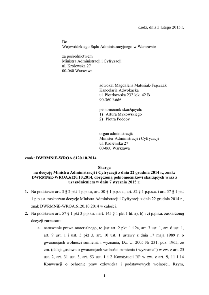 Łódź, dnia 5 lutego 2015 r. Do Wojewódzkiego Sądu Administracyjnego w Warszawie za pośrednictwem Ministra Administracji i Cyfryzacji ul. Królewska 27 00-060 Warszawa adwokat Magdalena Matusiak-Frącczak Kancelaria Adwokacka ul. Piotrkowska 232 lok. 42 B 90-360 Łódź pełnomocnik skarżących: 1) Artura Mykowskiego 2) Piotra Podoby organ administracji: Minister Administracji i Cyfryzacji ul. Królewska 27 00-060 Warszawa znak: DWRMNiE-WROA.6120.10.2014 Skarga na decyzję Ministra Administracji i Cyfryzacji z dnia 22 grudnia 2014 r., znak: DWRMNiE-WROA.6120.10.2014, doręczoną pełnomocnikowi skarżących wraz z uzasadnieniem w dniu 7 stycznia 2015 r. 1. Na podstawie art. 3 § 2 pkt 1 p.p.s.a, art. 50 § 1 p.p.s.a., art. 52 § 1 p.p.s.a. i art. 57 § 1 pkt 1 p.p.s.a. zaskarżam decyzję Ministra Administracji i Cyfryzacji z dnia 22 grudnia 2014 r., znak DWRMNiE-WROA.6120.10.2014 w całości. 2. Na podstawie art. 57 § 1 pkt 3 p.p.s.a. i art. 145 § 1 pkt 1 lit. a), b) i c) p.p.s.a. zaskarżonej decyzji zarzucam: a. naruszenie prawa materialnego, to jest art. 2 pkt. 1 i 2a, art. 3 ust. 1, art. 6 ust. 1, art. 9 ust. 1 i ust. 3 pkt 3, art. 10 ust. 1 ustawy z dnia 17 maja 1989 r. o gwarancjach wolności sumienia i wyznania, Dz. U. 2005 Nr 231, poz. 1965, ze zm. (dalej: „ustawa o gwarancjach wolności sumienia i wyznania”) w zw. z art. 25 ust. 2, art. 31 ust. 3, art. 53 ust. 1 i 2 Konstytucji RP w zw. z art. 9, 11 i 14 Konwencji o ochronie praw człowieka i podstawowych wolności, Rzym, 1 4.11.1950 r. (dalej: „EKPC”) poprzez dokonanie nieuprawnionej, bezpodstawnej oraz bezprawnej oceny prawowitości przekonań wyznaniowych skarżących, odmówienie zarejestrowania związku wyznaniowego w sytuacji, gdy nie zachodzi żadna z przesłanek pozwalających na dokonanie odmowy rejestracji, ograniczenie konstytucyjnego i konwencyjnego prawa skarżących do swobody sumienia i wyznania, które nie znajduje oparcia w obowiązujących przepisach i jest w rażący sposób nieproporcjonalne; b. naruszenie prawa dające podstawę do wznowienia postępowania administracyjnego, to jest art. 145 § 1 pkt 3 k.p.a. w zw. z art. 24 § 1 pkt 5 k.p.a. i w zw. z art. 127 § 3 k.p.a. polegające na tym, że w wydaniu pierwotnej decyzji, jak i decyzji wydanej na skutek wniosku o ponowne rozpoznanie sprawy uczestniczyła ta sama osoba – Sekretarz Stanu Stanisław Huskowski; c. naruszenie przepisów postępowania, to jest: i. art. 6 k.p.a. w zw. z art. 30, 34 ust. 1 ustawy o gwarancjach wolności sumienia i wyznania poprzez przekroczenie przez organ przyznanych mu ustawowo kompetencji organu wyłącznie rejestracyjnego i odmowę rejestracji związku wyznaniowego opartą na przesłankach, które nie mają podstaw prawnych; ii. art. 105 § 1 k.p.a. w zw. z art. 31 ust. 1 ustawy o gwarancjach wolności sumienia i wyznania poprzez niezasadne umorzenie postępowania rejestrowego w sytuacji, gdy wniosek został złożony przez podmiot uprawniony, który spełnił wszystkie przesłanki ustawowe pozwalające na zarejestrowanie związku wyznaniowego; iii. art. 7, 8, 9, 11, 77 § 1, 107 § 3 k.p.a. poprzez prowadzenie przez organ postępowania pod z góry przyjętą tezę o odmowie rejestracji związku wyznaniowego, całkowite pominięcie w postępowaniu interesu wnioskodawców, jakim jest wyznawanie wybranej przez nich wiary niestanowiącej zagrożenia dla porządku i bezpieczeństwa publicznego, pomijanie okoliczności faktycznych i prawnych przemawiających za rejestracją wnioskowanego związku wyznaniowego; iv. art. 153 p.p.s.a. w zw. z art. 84 § 1 k.p.a. poprzez sprzeczne z wytycznymi i wskazówkami zawartymi w wyroku Wojewódzkiego Sądu Administracyjnego w Warszawie z dnia 8 kwietnia 2014 r., sygn. akt I SA/Wa 1517/13 dopuszczenie niedopuszczalnej prawem ekspertyzy w 2 sprawie oceny, czy związek wnioskodawców posiada cechy wspólnoty religijnej oraz oparcie zaskarżonej decyzji na tej właśnie ekspertyzie, które to naruszenia miały istotny wpływ na wynik postępowania i skutkowały umorzeniem postępowania rejestrowego w sytuacji, która nie jest przewidziana w żadnym przepisie prawnym regulującym funkcjonowanie kościołów i związków wyznaniowych. 3. Na podstawie art. 145 § 1 pkt 1 lit. b) i c) p.p.s.a. i art. 200 p.p.s.a. wnoszę o: a. uchylenie zaskarżonej decyzji oraz decyzji ją poprzedzającej; b. zasądzenie od organu na rzecz skarżących kosztów postępowania, w tym kosztów zastępstwa procesowego według norm przepisanych. UZASADNIENIE Zaskarżoną decyzją organ, na podstawie art. 105 § 1 k.p.a., umorzył postępowanie w sprawie rejestracji Kościoła Latającego Potwora Spaghetti. Zaskarżona decyzja jest dotknięta szeregiem naruszeń prawa zarówno materialnego, jak i procesowego, w związku z czym powinna zostać uchylona. Zarzut naruszenia prawa materialnego Zarzut naruszenia prawa materialnego opiera się na zarzutach nie tylko rangi ustawowej, ale przede wszystkim – ze względu na istotę sprawy, której dotyczy – rangi konwencyjnej i konstytucyjnej, to jest: art. 2 pkt. 1 i 2a, art. 3 ust. 1, art. 6 ust. 1, art. 9 ust. 1 i ust. 3 pkt 3, art. 10 ust. 1 ustawy o gwarancjach wolności sumienia i wyznania w zw. z art. 25 ust. 2, art. 31 ust. 3, art. 53 ust. 1 i 2 Konstytucji RP w zw. z art. 9, 11 i 14 EKPC. Organ w sposób całkowicie nieuprawniony i sprzeczny z istotą prawa człowieka, jakim jest wolność sumienia, dokonuje oceny prawowitości przekonań religijnych skarżących, całkowicie przy tym błędnie interpretując przepisy Konstytucji RP oraz EKPC, jak i orzecznictwo Europejskiego Trybunału Praw Człowieka (dalej: „ETPC”) w tym przedmiocie. Jak wskazuje ETPC, wolność sumienia nie jest prawem nieograniczonym i prawo krajowe może przewidywać w tym zakresie pewne wyjątki. Niemniej, zarówno polskie ustawodawstwo, jak i orzecznictwo ETPC w zasadzie ogranicza te wyjątki do tego, tego, co 3 jest niezbędne w społeczeństwie demokratycznym dla ochrony