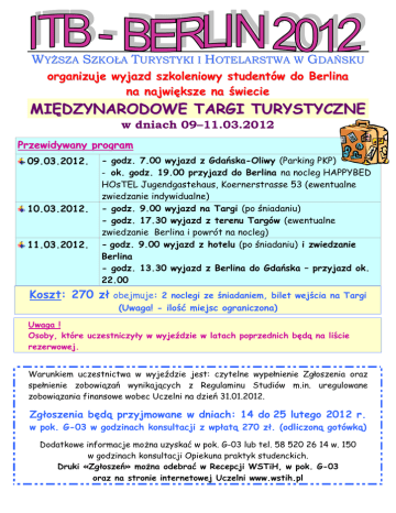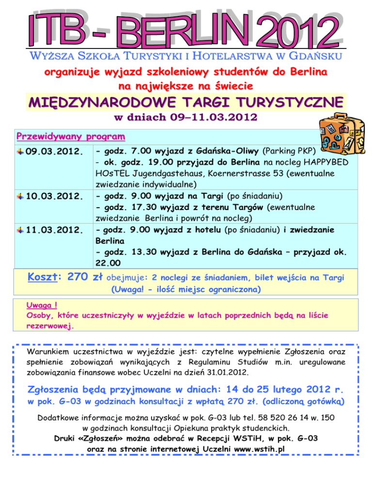 WYśSZA SZKOŁA TURYSTYKI I HOTELARSTWA W GDAŃSKU organizuje wyjazd szkoleniowy studentów do Berlina na największe na świecie MIĘDZYNARODOWE TARGI TURYSTYCZNE w dniach 09–11.03.2012 Przewidywany program 09.03.2012. 10.03.2012. 11.03.2012. - godz. 7.00 wyjazd z Gdańska-Oliwy (Parking PKP) - ok. godz. 19.00 przyjazd do Berlina na nocleg HAPPYBED HOsTEL Jugendgastehaus, Koernerstrasse 53 (ewentualne zwiedzanie indywidualne) - godz. 9.00 wyjazd na Targi (po śniadaniu) - godz. 17.30 wyjazd z terenu Targów (ewentualne zwiedzanie Berlina i powrót na nocleg) - godz. 9.00 wyjazd z hotelu (po śniadaniu) i zwiedzanie Berlina - godz. 13.30 wyjazd z Berlina do Gdańska – przyjazd ok. 22.00 Koszt: 270 zł obejmuje: 2 noclegi ze śniadaniem, bilet wejścia na Targi (Uwaga! - ilość miejsc ograniczona) Uwaga ! Osoby, które uczestniczyły w wyjeździe w latach poprzednich będą na liście rezerwowej. Warunkiem uczestnictwa w wyjeździe jest: czytelne wypełnienie Zgłoszenia oraz spełnienie zobowiązań wynikających z Regulaminu Studiów m.in. uregulowane zobowiązania finansowe wobec Uczelni na dzień 31.01.2012. Zgłoszenia będą przyjmowane w dniach: 14 do 25 lutego 2012 r. w pok. G-03 w godzinach konsultacji z wpłatą 270 zł. (odliczoną gotówką) Dodatkowe informacje moŜna uzyskać w pok. G-03 lub tel. 58 520 26 14 w. 150 w godzinach konsultacji Opiekuna praktyk studenckich. Druki «Zgłoszeń» moŜna odebrać w Recepcji WSTiH, w pok. G-03 oraz na stronie internetowej Uczelni www.wstih.pl