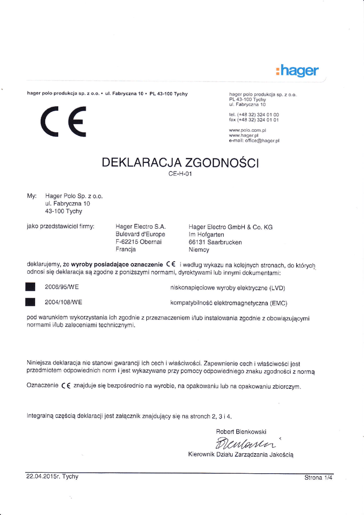 :hager hagg. polo produkcja sp. z o.o. . ul. Fabryczna 1o . PL Żł3-100 Tychy hag€r polo produkc]a sp. Ż o'o. PL 43-100 Tychy C€ ul. Fabryczna 10 lel. (+48 32) 324 01 00 fax (+48 32) 324 01 01 www hager.pl e-mail: [email protected] DEKLARACJA ZGODNOSCI CE-H.01 My: Hager Polo Sp. z o.o. ul. Fabryczna 10 43-100 Tychy jako pruedstawiciel f irmy: S.A. d'Europe Obernai Hager Electro Bulevard F-62215 Francja Hager Electro GmbH & Co. KG lm Hofgarten 66131 Saarbrucken Niemcy € deklarujemy, że Wyroby posiadające oznaczenie ( iwedług Wykazu na kolejnych stronach, do którycĘ odnosi się dek|aracja są zgodne z poniższymi normami, dyrektywami lub innymi dokumentami: I 2oo6/9sruE niskonapięciowe Wyroby eIektryczne (LVD) I zoo4tlołME kompatybilnośÓ elektromagnetyczna (El\ilc) pod Warunkiem Wykorzystania ich zgodnie z przeznaczeniem i/lub instalowania zgodnie z obowiązującymi normami i/lub zaleceniami technicznymi. Ninjejsza deklaracja nie stanowi gwarancji ich cech iWłaściwości. Zapewnienie cech iWłaściwościjest przedmiotem odpowiednich norm ijest Wykazywane przy pomocy odpowiedniego znaku zgodności Z normą oznaczenie C € zna]duje się bezpośrednio na Wyrobie, na opakowaniu lub na opakowaniu zbiorczym' |ntegralną częŚcią deklaracji jest załącznik znajdqący się na stronch 2, 3 i 4. Robeń Bienkowski f,źn/ąrtzr-' Kierownik DziałU Zarządzania JakoŚcią 22.04.2015r. f ychy Strona 1/4 *hager z o.o.. ut- FaLrryczna'!0. pL43-1OO Tychy C hager polo produkcja sp. z o.o. PL 43-1OO Tychy tel. (+44 32) 324 01 OO tax (+44 32) 324 ol 01 € Bodzina Wyrobów: Mełe rodzielnice GD, GP, GZ w!W.h3g€rpl e-mai .office@ha9er DEKLARACJA ZGODNOSCI CE-H-01 Opis: m pt inirozdzielnice rodzielnice VECTOR metalowe do aut serii FW2 F-t ne lP43 / lP44 ne lP54 ne lP65 F-P tP44 I tP54 FT ZP / lP54 zastosoWań zast licznikowe 22.04.2015r. Tychy Strona 2/4 :hager hager polo produkcja sp. z o.o. C€ . ul. Fabryczna l0 . PL 43-100 Tychy hager polo produkcja sp. z o.o. PL 43-100 Tychy ul. Fabryczna 10 tel. (+48 32) 324 01 00 fax (+46 32) 324 01 01 www.hager.pl DEKLARACJA ZGODNOSCI e_mail: office@hager'pł CE-H-01 HHA, HNB, HNC, HEC, HNA, HND, HED, HNE, HEE, HNF, HEF, HBA, HBB, HBD Wyłączniki mocy ibloki różnicowoprądowe Wraz z akcesoriami HXxxxxx, HYxxxxx przełączniki zasilania MBN.IVI HTN H Wączniki instalacyj ne (nadprądowe) l\łX CCC, CCA, CDA, CEC, cJ, cN, cP, cDc, cFA, cDc, cFA, cFc, CFC, CGA, CGC, CDA, CDH, CNA CP CFB. CDH Wytączniki róznicowoprądowe (RCB) bloki róŹnicowoprądowe och ronniki TN roŻączniki, przyciski i lampki sygnalizacyjne SVN EPs, EP4, EPN5X, EP05x, EPNo5X (x=0,1,2,3), EPS przekaŹniki bistabilne EIVI 22 .04 .201 5r . Strona 3/4 rhager hagsr polo produkcja sp, z o.o. r ul.Fabryczna10. PL43-100Tychy C€ haqę. polo produkcja sp. z o'o. PL 43-100 Tychy u. Fabryczna 10 leL. (+48 32) 324 01 00 fax {+48 32) 324 01 01 www. DEKLARACJA ZGODNOSCI h ag e r. pl e-m.ii: [email protected] cE-H-01 Rodzina WyrobóW: Bezpieczniki i akcesoria 19, LF LD, LE Opis: LNH 15, L6 LBC, LSC, LBCA Bezpieczniki nożowe NH wraz z osprzętem Bezpieczniki szklane Oprawki instalacyjne i klosze szklane TX urządzenia systemowe (programator TX100, centralka radiowa, zasilacz), urządzenia Wyj. i Wej. Bezpieczniki cylindryczne Gniazda bezpiecznikowe D0 D TJ Pgnęl_e_.g9!yr.9'.Yę l sp|.o'..9l*[lgwęnię- yi3_L]3ljią.cJl_e_ WK, WKT, WE osprzęt instalacvlny svstemu TEBIS TX Kllx '" '.' ''.. '..'....''....''.'..'. Zgodnie z Rozporządzeniem Ministra Gospodarki z dnia 21 sierpnia 2007 roku W sprawie zasadniczych wymagań dla sprzętu elektrycznego (Dz'U'2007' nr 155, poz' 1089)' na podstawie art.9 ustawy z dnia 30 sierpnia 2002 r' o systemie oceny zgodnoŚci (Dz' U' z2004 r. Nr 204, poz.2087 oraz z 2005 r. Nr 64, poz' 565) przepisóW rozporządzenia nie stosuje się do Wtyczek igniazd do użytku domowego' W związku z powyzszym niniejsza dek|aracja nie obejmuje gniazd z rodziny sN. 22 .04 .201 5( . Tychy Strona 4/4