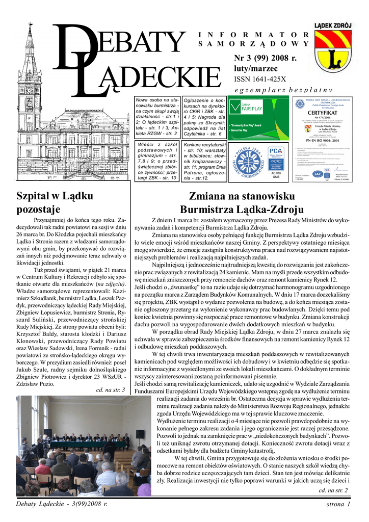 DL EBATY ĄDECKIE Szpital w Lądku pozostaje Przynajmniej do końca tego roku. Zadecydowali tak radni powiatowi na sesji w dniu 26 marca br. Do Kłodzka pojechali mieszkańcy Lądka i Stronia razem z władzami samorządowymi obu gmin, by przekonywać do rozwiązań innych niŜ podejmowanie teraz uchwały o likwidacji jednostki. TuŜ przed świętami, w piątek 21 marca w Centrum Kultury i Rekreacji odbyło się spotkanie otwarte dla mieszkańców (na zdjęciu). Władze samorządowe reprezentowali: Kazimierz Szkudlarek, burmistrz Lądka, Leszek Pazdyk, przewodniczący lądeckiej Rady Miejskiej, Zbigniew Łopusiewicz, burmistrz Stronia, Ryszard Suliński, przewodniczący strońskiej Rady Miejskiej. Ze strony powiatu obecni byli: Krzysztof Baldy, starosta kłodzki i Dariusz Klonowski, przewodniczący Rady Powiatu oraz Wiesław Sadowski, Irena Formnik - radni powiatowi ze strońsko-lądeckiego okręgu wyborczego. W prezydium zasiedli równieŜ: poseł Jakub Szulc, radny sejmiku dolnośląskiego Zbigniew Piotrowicz i dyrektor 23 WSzUR Zdzisław Puzio. cd. na str. 3 I N F O R M A T O R S A M O R Z Ą D O W Y Nowa osoba na stanowisku burmistrza na czym skupi swoją działalność - str.1 i 2; O lądeckim szpitalu - str. 1 i 3; Ankieta RZGW - str. 2 Ogloszenie o konkursach na dyrektoró CKiR i ZBK - str. 4 i 5; Nagroda dla palmy ze Skrzynki; odpowiedź na list Czytelnika - str. 6 Wieści z szkół podstaw owyc h i gi mnazjum - st r. 7,8 i 9; o przedświątecznej zbiórce Ŝywności; przetargi ZBK - str. 10 Konkurs recytatorski - str. 10; warsztaty w bibliotece; słownik krajoznawczy str. 11; program Dnia Pat rona, ogłoszenia - str.12. Nr 3 (99) 2008 r. luty/marzec ISSN 1641-425X egzemplarz bezpłatny Zmiana na stanowisku Burmistrza Lądka-Zdroju Z dniem 1 marca br. zostałem wyznaczony przez Prezesa Rady Ministrów do wykonywania zadań i kompetencji Burmistrza Lądka Zdroju. Zmiana na stanowisku osoby pełniącej funkcję Burmistrza Lądka Zdroju wzbudziło wiele emocji wśród mieszkańców naszej Gminy. Z perspektywy ostatniego miesiąca mogę stwierdzić, Ŝe emocje zastąpiła konstruktywna praca nad rozwiązywaniem najistotniejszych problemów i realizacją najpilniejszych zadań. Najpilniejszą i jednocześnie najtrudniejszą kwestią do rozwiązania jest zakończenie prac związanych z rewitalizacją 24 kamienic. Mam na myśli przede wszystkim odbudowę mieszkań zniszczonych przy remoncie dachów oraz remont kamienicy Rynek 12. Jeśli chodzi o „dwunastkę” to na razie udaje się dotrzymać harmonogramu uzgodnionego na początku marca z Zarządem Budynków Komunalnych. W dniu 17 marca doczekaliśmy się projektu, ZBK wystąpił o wydanie pozwolenia na budowę, a do końca miesiąca zostanie ogłoszony przetarg na wyłonienie wykonawcy prac budowlanych. Dzięki temu pod koniec kwietnia powinny się rozpocząć prace remontowe w budynku. Zmiana konstrukcji dachu pozwoli na wygospodarowanie dwóch dodatkowych mieszkań w budynku. W porządku obrad Rady Miejskiej Lądka Zdroju, w dniu 27 marca znalazła się uchwała w sprawie zabezpieczenia środków finansowych na remont kamienicy Rynek 12 i odbudowę mieszkań poddaszowych. W tej chwili trwa inwentaryzacja mieszkań poddaszowych w rewitalizowanych kamienicach pod względem moŜliwości ich dobudowy i w kwietniu odbędzie się spotkanie informacyjne z wysiedlonymi ze swoich lokali mieszkańcami. O dokładnym terminie wszyscy zainteresowani zostaną poinformowani pisemnie. Jeśli chodzi samą rewitalizację kamieniczek, udało się uzgodnić w Wydziale Zarządzania Funduszami Europejskimi Urzędu Wojewódzkiego wstępną zgodę na wydłuŜenie terminu realizacji zadania do września br. Ostateczna decyzja w sprawie wydłuŜenia terminu realizacji zadania naleŜy do Ministerstwa Rozwoju Regionalnego, jednakŜe zgoda Urzędu Wojewódzkiego ma w tej sprawie kluczowe znaczenie. WydłuŜenie terminu realizacji o 4 miesiące nie pozwoli prawdopodobnie na wykonanie pełnego zakresu zadania i jego ograniczenie jest raczej przesądzone. Pozwoli to jednak na zamknięcie prac w „niedokończonych budynkach”. Pozwoli teŜ uniknąć zwrotu otrzymanej dotacji. Konieczność zwrotu dotacji wraz z odsetkami byłaby dla budŜetu Gminy katastrofą. W tej chwili, Gmina przygotowuje się do złoŜenia wniosku o środki pomocowe na remont obiektów oświatowych. O stanie naszych szkół wiedzą chyba dobrze rodzice uczęszczających tam dzieci. Stan ten jest mówiąc delikatnie zły. Realizacja inwestycji nie tylko poprawi warunki w jakich uczą się dzieci i cd. na str. 2 Debaty Lądeckie - 3(99)2008 r. strona 1 cd. ze str. 1 Certyfikat „GMINA FAIR PLAY” 2006 dla UMiG w Lądku Zdroju *** Certyfikat „Przejrzysta Polska” 2006 dla UMiG w Lądku Zdroju *** Lądek Zdrój laureat II nagrody w ogólnopolskim konkursie „Na najlepiej oświetloną gminę i miasto 2005” *** Lądek Zdrój laureat plebiscytu„Najpopularniejsza miejscowość turystyczna 2003” *** Miasto i Gmina Lądek Zdrój LAUREAT "DOLNOŚLĄSKIEGO KLUCZA SUKCESU" 1996 DLA NAJBARDZIEJ GOSPODARNEJ GMINY WIEJSKO-MIEJSKIEJ Urząd Miasta i Gminy Lądek Zdrój 57-540 Lądek Zdrój, Rynek 31, centrala tel. 074 81 17 850; fax 074 81 47 418; e-mail: [email protected] www.ladek.pl oraz www.ladek.biuletyn.info.pl Urząd czynny: od poniedziałku do piątku: 7.30-15.30 Referat Oświaty: 8.00 - 15.00 USC w zaleŜności od potrzeb, pracuje w soboty i niedziele Burmistrz, osoba zastępująca Burmistrza Lądka Zdroju Joanna Walaszczyk przyjmuje interesantów w kaŜdy wtorek w godz.: 10.00-17.00, tel. 0748 117 850 Przewodniczący Rady Miejskiej Leszek Pazdyk przyjmuje interesantów w kaŜdy wtorek w godz. 9.0017.00, II p. pok. 28, tel. 0748 117 868 Wykaz numerów do UMiG w Lądku Zdroju: 1. Asystent Burmistrza (centrala) ...........0748-117-850 2. Sekretarz Miasta ..............................0748-117-854 3. Kierownik USC .................................0748-117-853 4. NaczelnikWydz. Rozwoju......