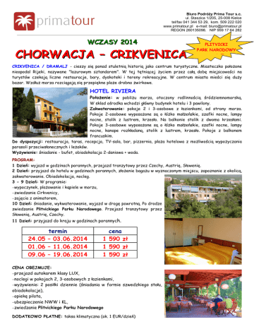 Biuro Podróży Prima Tour s.c. ul. Staszica 1/205, 25-008 Kielce tel/fax 041 344 53 29, kom. 509 222 020 www.primatour.pl e-mail: [email protected] REGON 260135098, NIP 959 17 64 282 WCZASY 2014 CHORWACJA – CRIKVENICA PLITVICKI PARK NARODOWY w cenie !!! CRIKVENICA / DRAMALJ - cieszy się ponad stuletnią historią jako centrum turystyczne. Miasteczko położone nieopodal Rijeki, nazywane "lazurowym sztandarem". W tej tętniącej życiem przez całą dobę miejscowości na turystów czekają liczne restauracje, bary, dyskoteki i tereny rekreacyjne. W centrum miasta mieści się duży bazar. Wzdłuż morza rozciągają się przepiękne plaże drobno żwirkowe. HOTEL RIVIERA Położenie: w pobliżu morza, otoczony roślinnością śródziemnomorską. W sklad ośrodka wchodzi główny budynek hotelu i 3 pawilony. Zakwaterowanie: pokoje 2 i 3-osobowe z łazienkami, od strony morza. Pokoje 2-osobowe wyposażone są o łóżko małżeńskie, szafki nocne, lampy nocne, stolik z lustrem, krzesło. Na balkonie stolik z dwoma krzesłami. Pokoje 3-osobowe wyposażone są o łóżko małżeńskie, szafki nocne, lampy nocne, kanape rozkładaną, stolik z lustrem, krzesło. Pokoje z balkonem francuskim. Do dyspozycji: restauracja, taras, recepcja, TV-sala, bar, pizzernia, plaża hotelowa z możliwością wypożyczania parasoli przeciwsłonecznych i leżaków. Wyżywienie: śniadanie - bufet, obiadokolacja 2-daniowa + woda. PROGRAM: 1 Dzień: wyjazd w godzinach porannych, przejazd tranzytowy przez Czechy, Austrię, Słowenię. 2 Dzień: przyjazd do hotelu w godzinach porannych, złożenie bagażu w wyznaczonym miejscu, zapoznanie z okolicą, zakwaterowanie. Obiadokolacja, nocleg. 3 - 9 Dzień: W programie: −wypoczynek, plażowanie i kąpiele w morzu, −zwiedzanie Cirkvenicy, −zajęcia z animatorem, 10 Dzień: śniadanie, wykwaterowanie, wyjazd w drogę powrotną. Po drodze zwiedzanie Plitvickiego Parku Narodowego. Przejazd tranzytowy przez Słowenię, Austrię, Czechy. 11 Dzień: przyjazd do kraju w godzinach porannych. termin 24.05 – 03.06.2014 01.06 – 11.06.2014 09.06 – 19.06.2014 cena 1 590 zł 1 590 zł 1 590 zł CENA OBEJMUJE: −przejazd autokarem klasy LUX, −noclegi w pokojach 2, 3-osobowych z łazienkami, −wyżywienie: 2 posiłki dziennie (śniadania w formie szwedzkiego stołu, obiadokolacje), −opiekę pilota, −ubezpieczenie NWW i KL, −zwiedzanie Plitvickiego Parku Narodowego DODATKOWO PŁATNE: taksa klimatyczna (ok. 1 EUR/dzień)