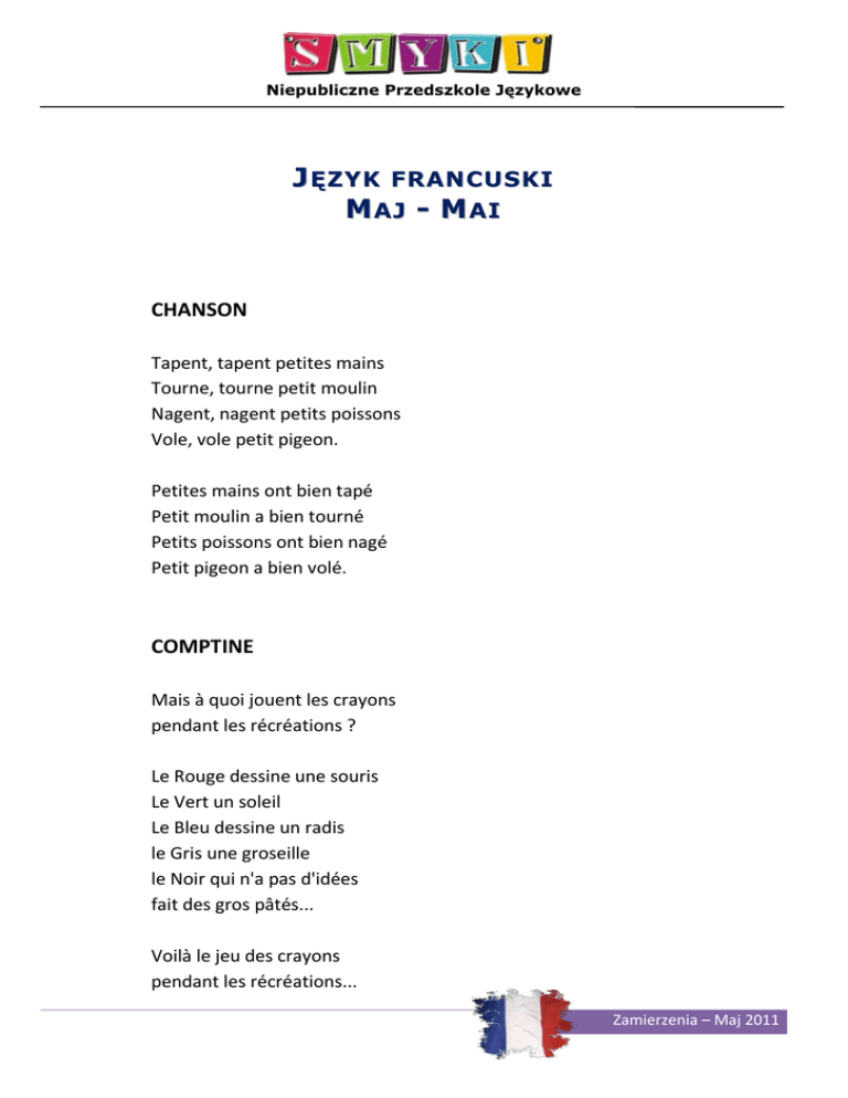 Niepubliczne Przedszkole Językowe JĘZYK FRANCUSKI MAJ - MAI CHANSON Tapent, tapent petites mains Tourne, tourne petit moulin Nagent, nagent petits poissons Vole, vole petit pigeon. Petites mains ont bien tapé Petit moulin a bien tourné Petits poissons ont bien nagé Petit pigeon a bien volé. COMPTINE Mais à quoi jouent les crayons pendant les récréations ? Le Rouge dessine une souris Le Vert un soleil Le Bleu dessine un radis le Gris une groseille le Noir qui n'a pas d'idées fait des gros pâtés... Voilà le jeu des crayons pendant les récréations... Zamierzenia – Maj 2011 Niepubliczne Przedszkole Językowe LE VOCABULAIRE Un pique-nique- piknik Ma maison- mój dom Ma chambre- mój pokój La cuisine- kuchnia La salle de bain- łazienka Mon lit- moje łóżko Mes jouets- moje zabawki La télé- telewizor L’ordinateur- komputer La voiture- samochód L’avion- samolot Le vélo- rower Le train- pociąg Jouer au ballon- grad w piłkę Sauter à la corde- skakad przez skakankę Jouer au bac de sable- bawid się w piaskownicy Regarder un livre- oglądad ksiażkę Nager- pływad Chanter- śpiewad Dessiner- rysowad Zamierzenia – Maj 2011