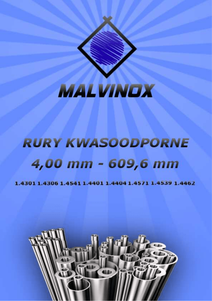 wymiar zewn. 4,00 5,00 6,00 6,35 7,00 8,00 9,00 9,53 10,00 10,20 10,30 11,00 11,00 12,00 12,70 13,00 13,50 13,72 14,00 15,00 15,88 16,00 17,15 17,20 ścianka 1.4301 1.4306 0,50 1,00 0,50 1,00 o 0,50 o 1,00 o 1,50 2,00 o 0,71 o 0,89 o 1,24 o 1,65 o 1,00 o 1,50 0,50 o 1,00 o 1,50 o 2,00 2,50 1,00 o 0,89 o 1,24 1,65 o 1,00 o 1,50 o 2,00 o 2,50 o 2,00 o 2,41 1,00 1,50 2,00 o 1,00 o 1,50 o 2,00 2,50 o 3,00 o 4,00 o 0,89 o 1,24 o 1,65 2,11 o 1,00 o 1,50 2,50 o 1,60 o 2,30 2,60 2,90 o 1,65 o 2,24 o 3,02 o 1,00 o 1,50 o 2,00 2,50 3,00 o 4,00 o 1,00 o 1,50 o 2,00 2,50 3,00 4,00 1,24 o 1,00 o 1,50 o 2,00 o 2,50 3,00 4,00 o 1,65 o 2,31 o 3,20 1,80 1.4541 o o o o o o o o 1.4401 1.4404 o o 1.4571 o o o o o o o o 1.4462 1.4539 wymiar zewn. 17,20 18,00 o o o o 19,00 19,05 o o o o o o o o o o o o o o o o o o o o o o o 20,00 o 21,30 o o o o o o o o o o o o o o o o o o o o o o o o o o o 21,34 22,00 o o o o o o o o o o o o o o o o o o o o o o o o o o o o 23,00 24,00 o o o 25,00 o o o o o o o o o o o o o o o o o o o o o o o o o o o o o o o o o o 25,40 26,00 26,67 26,90 ścianka 1.4301 1.4306 2,00 o 2,30 2,60 2,90 3,20 o 1,00 o 1,50 o 2,00 2,50 o 3,00 3,50 4,00 1,50 o 1,24 o 1,65 o 2,11 o 1,00 o 1,50 o 2,00 o 2,50 o 3,00 4,00 o 5,00 6,00 o 7,00 o 1,60 o 2,00 o 2,60 2,90 o 3,20 3,60 o 2,11 o 2,77 o 3,73 o 4,78 o 7,47 o 1,00 o 1,50 o 2,00 o 2,50 3,00 4,00 5,00 6,00 o 1,50 1,00 1,50 o 2,00 3,00 4,00 7,00 o 1,00 o 1,50 o 2,00 2,30 o 2,50 o 3,00 4,00 o 5,00 o 6,00 o 1,65 o 2,11 3,00 o 2,11 o 2,87 o 3,91 o 5,54 o 7,82 o 1,60 o 2,00 o 2,30 o 2,30 2,90 o 3,20 4,00 1.4541 o o o o o o o o o o o o o 1.4401 1.4404 o o o 1.4571 1.4462 o o 1.4539 o o o o o o o o o o o o o o o o o o o o o o o o o o o o o o o o o o o o o o o o o o o o o o o o o o o o o o o o o o o o o o o o o o o o o o o o o o o o o o o o o o o o o o o o o o o o o o o o o o o o o o o o o o o o o o o o o o o o o o o o o o o o o o o o o o o o o o o o o o o o o o o o o o o o o wymiar zewn. 27,00 28,00 30,00 32,00 33,40 33,70 34,00 35,00 36,00 38,00 40,00 41,00 42,00 42,16 42,40 ścianka 1.4301 1.4306 o 3,00 o 4,00 o 1,00 o 1,50 o 2,00 2,50 3,00 4,00 5,00 o 1,00 o 1,50 o 2,00 o 2,50 2,60 o 3,00 o 4,00 5,00 1,00 1,50 2,00 2,50 3,00 3,50 o 4,00 OX 2,77 OX 3,38 o 4,55 o 6,35 o 9,09 o 2,00 o 2,60 2,90 o 3,20 3,60 4,05 1,00 1,50 5,00 5,50 1,50 o 2,00 o 2,50 3,00 5,00 1,00 2,00 o 3,00 o 1,50 o 2,00 o 2,50 2,60 o 3,00 o 4,00 o 5,00 6,00 1,50 o 2,00 2,50 o 3,00 o 4,00 5,00 4,00 o 2,00 o 3,00 5,00 o 2,77 o 3,56 o 4,85 o 6,35 o 9,70 o 2,00 o 2,60 o 3,20 3,60 4,05 1.4541 o o o o o o o 1.4401 1.4404 o o o o o o o o o o o o o o o o o o o o o o o o o o o o o o o o o o o 45,00 48,26 o o o o o o o o 48,30 o o o o o o o o o o o o o o o o o o o o o 50,00 51,00 52,00 54,00 o o o o o o o o o o o 55,00 57,00 60,30 o o o o o o o o o o o o o o o o o o o 1.4539 wymiar zewn. 44,50 o o o o o o o OX o o o o o o o o o o o 1.4462 o o o o o o o o o o o 1.4571 o o o o o o o o o o o o o o o OX o o o o o o o o o o o o o o o 60,33 63,50 o o o o o o o o o 65,00 70,00 73,03 ścianka 1.4301 1.4306 2,00 o 2,50 2,60 3,00 3,20 4,00 5,00 OX 2,77 OX 3,68 o 5,08 o 7,14 o 10,16 o 1,60 o 2,00 2,30 o 2,60 2,90 o 3,20 3,60 o 4,05 5,00 6,30 7,10 8,00 o 1,50 o 2,00 o 2,50 o 3,00 4,00 5,00 6,00 o 2,60 2,90 4,00 4,00 o 2,00 3,00 5,00 o 2,00 2,50 2,90 3,50 4,00 5,00 6,50 o 2,00 o 2,60 2,90 3,20 o 3,60 4,00 4,50 5,00 7,10 8,00 10,00 o 1,65 OX 2,77 OX 3,91 o 5,54 o 8,74 o 11,07 2,50 3,20 2,50 o 2,00 o 2,90 o 3,00 4,00 5,00 OX 3,05 OX 5,16 o 7,01 o 9,53 o 14,02 1.4541 1.4401 1.4404 1.4571 o o o o o o o o o o o o o o o o o o o o o o 1.4462 1.4539 o o o o o o o o OX OX o o o o o o o o o o o o o o o o o o o o o o o o o o o o o o o o o o o o o o o o o o o o o o o o o o o o o o o o o o o o o o o o o o o o o o o o o o o o o o o o o o o OX OX o o o o o o o o o o o o o o o o o o o o o o o o o o o o o o o o o OX OX o o o o o o o o o o o o o o o wymiar zewn. 75,00 76,10 80,00 82,50 88,90 90,00 95,00 101,60 108,00 114,30 121,00 127,00 133,00 139,70 141,30 159,00 ścianka 1.4301 1.4306 5,00 O 2,00 2,30 2,60 O 2,90 3,20 O 3,60 4,00 4,50 5,00 6,30 8,00 10,00 12,50 O 4,00 5,00 3,60 2,00 2,30 2,60 2,90 OX 3,05 3,20 3,60 O 4,05 4,50 5,00 OX 5,49 6,30 O 7,62 8,00 O 11,13 14,20 O 15,24 5,00 5,00 o 3,05 4,05 5,00 OX 5,74 o 8,08 3,00 o 4,00 5,00 6,30 2,60 OX 3,05 3,60 4,05 o 4,50 5,40 OX 6,02 6,30 7,10 o 8,56 o 11,13 o 13,49 o 17,12 4,00 4,00 5,00 o 3,00 4,00 6,30 4,00 5,00 6,30 7,10 OX 3,40 OX 6,55 OX 9,53 o 15,88 o 19,05 o 4,50 6,30 1.4541 o o o o o o o o o o o o 1.4401 1.4404 o 1.4571 1.4462 o o o o o o o o o o 1.4539 wymiar zewn. 168,30 o o 219,10 o o o o o o o o o o o o o o o o o o o o o o OX OX OX o o o o o o o o o o o o o o o o o OX OX OX o o o OX o o o o o o o o o o o o o o o o o 323,90 o o o o o o o o o o o o o o o o o o o o 355,60 o OX o o o 406,40 o o o o o o o o 457,20 o o o o o o o o o o o o o o o o o o o o o o o o o o o o o o o o o OX 273,00 o o o o o o 508,00 o 609,60 OX OX o o o o o o o o ścianka 1.4301 1.4306 OX 3,40 4,50 5,00 OX 7,11 OX 10,97 O 14,27 O 18,26 O 21,95 28,57 OX 3,76 OX 6,35 OX 8,18 10,31 OX 12,70 15,09 o 18,26 o 20,62 o 23,01 OX 4,19 OX 6,35 OX 9,27 OX 12,70 o 15,09 16,00 o 18,26 o 21,44 o 25,40 o 28,58 OX 4,57 X 6,35 OX 9,52 o 10,31 OX 12,70 16,00 o 17,48 21,44 o 25,40 o 28,58 o 33,32 OX 4,78 X 6,35 OX 9,52 OX 12,70 OX 19,05 o 23,83 27,79 31,75 o 35,71 X 4,78 X 6,35 OX 9,52 OX 12,70 o 16,66 o 21,44 26,19 o 30,96 o 40,49 X 4,78 X 9,53 o 14,27 19,05 o 34,92 X 5,54 X 9,53 X 12,70 o 15,09 20,62 X 6,35 X 9,53 X 12,70 24,61 38,89 1.4541 1.4401 1.4404 o o o OX OX OX o o o o o OX o o o 1.4571 1.4462 1.4539 o o o o o o o o o o o o o o o OX OX OX OX X o OX o o o o o o o o o X o o o o o o o OX X OX OX OX o o o o OX OX o o o o o o o X OX o o o o OX o o X o o o o X OX OX OX o o o o o o o o OX o o o X o o o o o OX X X o o o OX o o o OX OX o o o o o X X OX OX o OX X o o o o o X o o o X X o X X X X o OX X X X X X X X o - RURA BEZ SZWU x - RURA ZE SZWEM PPHU MALVINOX tel. 79 0445 274 e-mail :[email protected] SPECJALNE