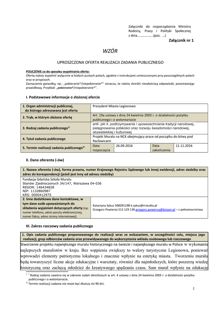 Załączniki do rozporządzenia Ministra Rodziny, Pracy i Polityki Społecznej z dnia……………….(poz. …) Załącznik nr 1 WZÓR UPROSZCZONA OFERTA REALIZACJI ZADANIA PUBLICZNEGO POUCZENIE co do sposobu wypełniania oferty: Ofertę należy wypełnić wyłącznie w białych pustych polach, zgodnie z instrukcjami umieszczonymi przy poszczególnych polach oraz w przypisach. Zaznaczenie gwiazdką, np.: „pobieranie*/niepobieranie*” oznacza, że należy skreślić niewłaściwą odpowiedź, pozostawiając prawidłową. Przykład: „pobieranie*/niepobieranie*”. I. Podstawowe informacje o złożonej ofercie 1. Organ administracji publicznej, do którego adresowana jest oferta Prezydent Miasta Legionowo 2. Tryb, w którym złożono ofertę Art. 19a ustawy z dnia 24 kwietnia 2003 r. o działalności pożytku publicznego i o wolontariacie 3. Rodzaj zadania publicznego1) art4. pkt 4. podtrzymywania i upowszechniania tradycji narodowej, pielęgnowania polskości oraz rozwoju świadomości narodowej, obywatelskiej i kulturowej 4. Tytuł zadania publicznego 5. Termin realizacji zadania publicznego 2) Projekt Muralu na NCK obejmujący prace od początku do bitwy pod Racławicami Data 26.09.2016 Data 11.11.2016 rozpoczęcia zakończenia II. Dane oferenta (-ów) 1. Nazwa oferenta (-ów), forma prawna, numer Krajowego Rejestru Sądowego lub innej ewidencji, adres siedziby oraz adres do korespondencji (jeżeli jest inny od adresu siedziby) Fundacja Gdańska Szkoła Muralu Stanów Zjednoczonych 34/147, Warszawa 04-036 REGON: 146434828 NIP: 1132860987 KRS: 0000412975 2. Inne dodatkowe dane kontaktowe, w tym dane osób upoważnionych do składania wyjaśnień dotyczących oferty (np. numer telefonu, adres poczty elektronicznej, numer faksu, adres strony internetowej) Katarzyna Sykus 508391198 [email protected] Grzegorz Powierża 513 129 138 [email protected] – z pełnomocnictwa III. Zakres rzeczowy zadania publicznego 1. Opis zadania publicznego proponowanego do realizacji wraz ze wskazaniem, w szczególności celu, miejsca jego realizacji, grup odbiorców zadania oraz przewidywanego do wykorzystania wkładu osobowego lub rzeczowego Stworzenie projektu największego muralu historycznego na świecie i największego muralu w Polsce w wykonaniu najlepszych muralistów w kraju. Bez wątpienia zwiększy to walory turystyczne Legionowa, ponieważ wprowadzi elementy patriotyzmu lokalnego i znacznie wpłynie na estetykę miasta. Tworzeniu muralu będą towarzyszyć liczne akcje edukacyjne i warsztaty, również dla najmłodszych, które poszerzą wiedzę historyczną oraz zachęcą młodzież do kreatywnego spędzania czasu. Sam mural wpłynie na edukację 1 ) Rodzaj zadania zawiera się w zakresie zadań określonych w art. 4 ustawy z dnia 24 kwietnia 2003 r. o działalności pożytku publicznego i o wolontariacie. 2) Termin realizacji zadania nie może być dłuższy niż 90 dni. 1 historyczną mieszkańców, ponieważ przedstawiać będzie 100 największych bitew, które odegrały istotną rolę w historii naszego kraju. Wszystkiemu towarzyszyć będą 3 imprezy okolicznościowe oraz kino plenerowe z filmami historycznymi. Jest to ważny element, którym miasto będzie mogło się poszczycić i wyróżnić. 2. Zakładane rezultaty realizacji zadania publicznego - stworzenie największego muralu historycznego na świecie - stworzenie największego muralu w Polsce - edukacja historyczna mieszkańców - wpływ na walory estetyczne miasta - edukacja dzieci i młodzieży przez prowadzone warsztaty - nauka młodzieży kreatywnego spędzania czasu IV. Szacunkowa kalkulacja kosztów realizacji zadania publicznego (w przypadku większej liczby kosztów istnieje możliwość dodania kolejnych wierszy) Rodzaj kosztu Koszt całkowity (zł) do poniesienia z wnioskowanej dotacji3) (zł) do poniesienia ze środków finansowych własnych, środków pochodzących z innych źródeł, wkładu osobowego lub rzeczowego4) (zł) Lp. 1 Przygotowanie projektu graficznego okres do bitwy pod Racławicami 9000 9000 0 2 Materiały reklamowe i wydruki próbne 1000 1000 0 3 Konsultacje historyczne 5000 0 5000 15000 10 000 5000 4 Koszty ogółem: Oświadczam(-y), że: 1) proponowane zadanie publiczne będzie realizowane wyłącznie w zakresie działalności pożytku publicznego oferenta; 2) w ramach składanej oferty przewidujemy pobieranie*/niepobieranie* świadczeń pieniężnych od adresatów zadania; 3) wszystkie podane w ofercie oraz załącznikach informacje są zgodne z aktualnym stanem prawnym i faktycznym; 4) oferent*/oferenci* składający niniejszą ofertę nie zalega (-ją)*/zalega (-ją)* z opłacaniem należności z tytułu zobowiązań 3) Wartość kosztów ogółem do poniesienia z dotacji nie może przekroczyć 10 000 zł. W przypadku wsparcia realizacji zadania publicznego. 4 ) 2 podatkowych; 5) oferent*/oferenci* składający niniejszą ofertę nie zalega (-ją)*/zalega (-ją)* z opłacaniem należności z tytułu składek na ubezpieczenia społeczne. Grzegorz Powierża (podpis osoby upoważnionej lub podpisy osób upoważnionych do składania oświadczeń woli w imieniu oferenta) Data 06.09.2016 Załącznik: W przypadku gdy oferent nie jest zarejestrowany w Krajowym Rejestrze Sądowym – potwierdzona za zgodność z oryginałem kopia aktualnego wyciągu z innego rejestru lub ewidencji. 3