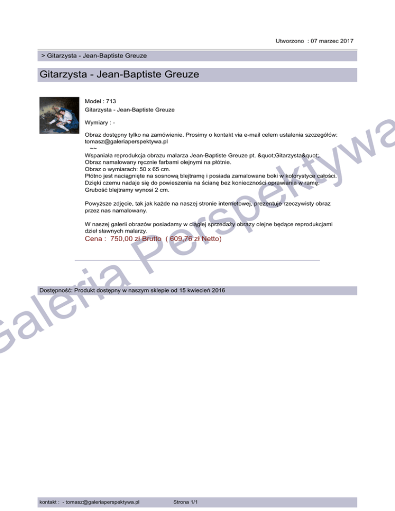 Utworzono : 07 marzec 2017 > Gitarzysta - Jean-Baptiste Greuze Gitarzysta - Jean-Baptiste Greuze Model : 713 Gitarzysta - Jean-Baptiste Greuze a w ty Wymiary : - Obraz dostępny tylko na zamówienie. Prosimy o kontakt via e-mail celem ustalenia szczegółów: [email protected] ~~ Wspaniała reprodukcja obrazu malarza Jean-Baptiste Greuze pt. "Gitarzysta". Obraz namalowany ręcznie farbami olejnymi na płótnie. Obraz o wymiarach: 50 x 65 cm. Płótno jest naciągnięte na sosnową blejtramę i posiada zamalowane boki w kolorystyce całości. Dzięki czemu nadaje się do powieszenia na ścianę bez konieczności oprawiania w ramę. Grubość blejtramy wynosi 2 cm. p rs k e Powyższe zdjęcie, tak jak każde na naszej stronie internetowej, prezentuje rzeczywisty obraz przez nas namalowany. e P W naszej galerii obrazów posiadamy w ciągłej sprzedaży obrazy olejne będące reprodukcjami dzieł sławnych malarzy. Cena : 750,00 zł Brutto ( 609,76 zł Netto) a i r e l a Dostępność: Produkt dostępny w naszym sklepie od 15 kwiecień 2016 G kontakt : - [email protected] Strona 1/1