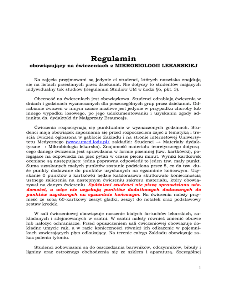 Mikrobiologia lekarska - Regulamin obowiązujący na ćwiczeniach