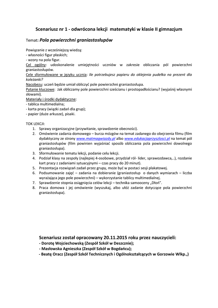 Scenariusz nr 1 - odwrócona lekcji matematyki w klasie II gimnazjum Temat: Pola powierzchni graniastosłupów Powiązanie z wcześniejszą wiedzą: - własności figur płaskich; - wzory na pola figur. Cel ogólny: udoskonalenie umiejętności uczniów w zakresie obliczania pól powierzchni graniastosłupów. Cele sformułowane w języku ucznia: Ile potrzebujesz papieru do oklejenia pudełka na prezent dla koleżanki? Nacobezu: uczeń będzie umiał obliczyć pole powierzchni graniastosłupa. Pytanie kluczowe: Jak obliczamy pole powierzchni sześcianu i prostopadłościanu? (wyjaśnij własnymi słowami). Materiały i środki dydaktyczne: - tablica multimedialna; - karta pracy (wiązki zadań dla grup); - papier (duże arkusze), pisaki. TOK LEKCJI: 1. Sprawy organizacyjne (przywitanie, sprawdzenie obecności). 2. Omówienie zadania domowego – burza mózgów na temat zadanego do obejrzenia filmu (film dydaktyczny ze strony www.matmagwiazdy.pl albo www.edukacjaprzyszlosci.pl na temat pól graniastosłupów (film powinien wyjaśniać sposób obliczania pola powierzchni dowolnego graniastosłupa). 3. Sformułowanie tematu lekcji, podanie celu lekcji. 4. Podział klasy na zespoły (najlepiej 4-osobowe, przydział ról- lider, sprawozdawca,..), rozdanie kart pracy z zadaniami sytuacyjnymi – czas pracy do 20 minut). 5. Prezentacja rozwiązań zadań przez grupy, może być w postaci sesji plakatowej. 6. Podsumowanie zajęć – zadania na dobieranie (graniastosłup o danych wymiarach – liczba wyrażająca jego pole powierzchni) – wykorzystanie tablicy multimedialnej. 7. Sprawdzenie stopnia osiągnięcia celów lekcji – technika samooceny „Dłoń”. 8. Praca domowa i jej omówienie (wyszukaj, albo ułóż zadanie dotyczące pola powierzchni graniastosłupa). Scenariusz został opracowany 20.11.2015 roku przez nauczycieli: - Dorotę Wojciechowską (Zespół Szkół w Deszcznie); - Masłowska Agnieszka (Zespół Szkół w Bogdańcu); - Beatę Oracz (Zespół Szkół Technicznych i Ogólnokształcących w Gorzowie Wlkp.,)