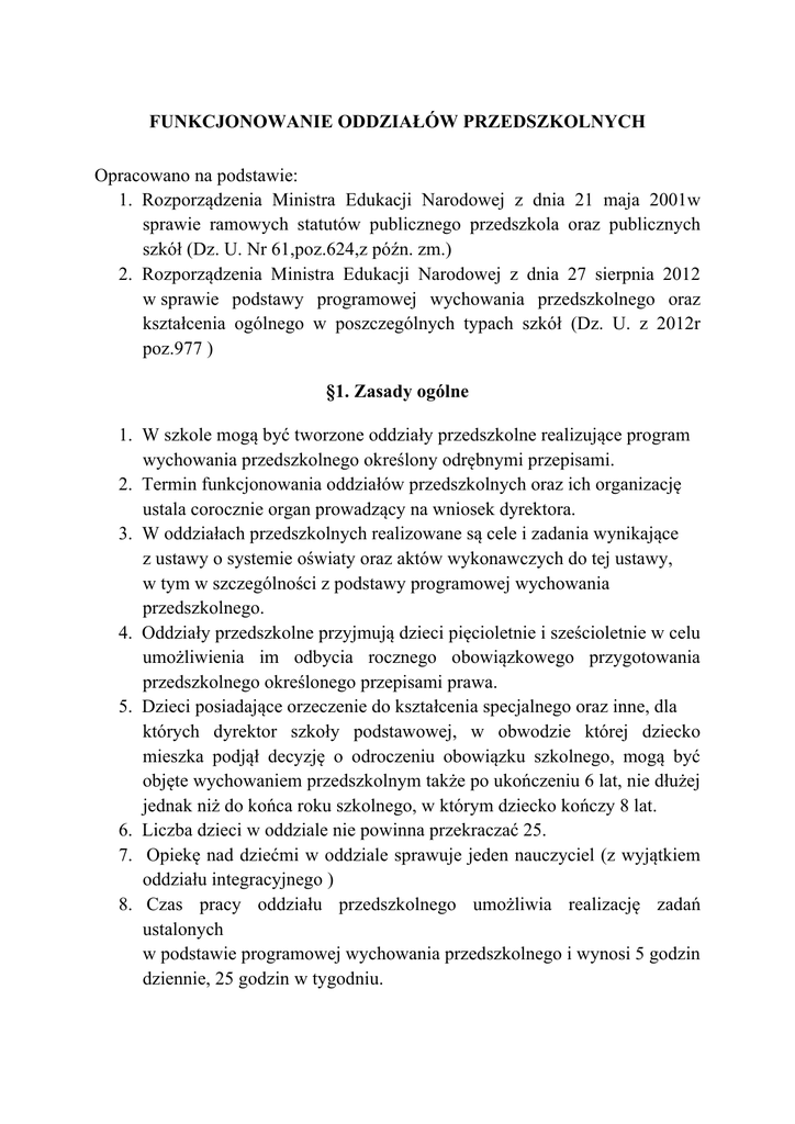 FUNKCJONOWANIE ODDZIAŁÓW PRZEDSZKOLNYCH Opracowano na podstawie: 1. Rozporządzenia Ministra Edukacji Narodowej z dnia 21 maja 2001w sprawie ramowych statutów publicznego przedszkola oraz publicznych szkół (Dz. U. Nr 61,poz.624,z późn. zm.) 2. Rozporządzenia Ministra Edukacji Narodowej z dnia 27 sierpnia 2012 w sprawie podstawy programowej wychowania przedszkolnego oraz kształcenia ogólnego w poszczególnych typach szkół (Dz. U. z 2012r poz.977 ) §1. Zasady ogólne 1. W szkole mogą być tworzone oddziały przedszkolne realizujące program wychowania przedszkolnego określony odrębnymi przepisami. 2. Termin funkcjonowania oddziałów przedszkolnych oraz ich organizację ustala corocznie organ prowadzący na wniosek dyrektora. 3. W oddziałach przedszkolnych realizowane są cele i zadania wynikające z ustawy o systemie oświaty oraz aktów wykonawczych do tej ustawy, w tym w szczególności z podstawy programowej wychowania przedszkolnego. 4. Oddziały przedszkolne przyjmują dzieci pięcioletnie i sześcioletnie w celu umożliwienia im odbycia rocznego obowiązkowego przygotowania przedszkolnego określonego przepisami prawa. 5. Dzieci posiadające orzeczenie do kształcenia specjalnego oraz inne, dla których dyrektor szkoły podstawowej, w obwodzie której dziecko mieszka podjął decyzję o odroczeniu obowiązku szkolnego, mogą być objęte wychowaniem przedszkolnym także po ukończeniu 6 lat, nie dłużej jednak niż do końca roku szkolnego, w którym dziecko kończy 8 lat. 6. Liczba dzieci w oddziale nie powinna przekraczać 25. 7. Opiekę nad dziećmi w oddziale sprawuje jeden nauczyciel (z wyjątkiem oddziału integracyjnego ) 8. Czas pracy oddziału przedszkolnego umożliwia realizację zadań ustalonych w podstawie programowej wychowania przedszkolnego i wynosi 5 godzin dziennie, 25 godzin w tygodniu. 9. Oddział przedszkolny pracuje w godzinach od 8:00 do 13:30 cztery razy w tygodniu, oraz w godzinach od 8:00 do 13:00 raz w tygodniu. 10. Godzina zajęć w oddziale przedszkolnym trwa 60 minut. 11. Czas trwania zajęć dydaktycznych z dziećmi w wieku 5-6 lat wynosi ok. 30 minut .Czas oraz formę zajęć nauczyciel dostosowuje do możliwości i potrzeb dzieci. 12. Sposób dokumentowania pracy dydaktyczno–wychowawczej oddziału przedszkolnego określają odrębne przepisy. 13. W oddziale przedszkolnym mogą być organizowane dodatkowe zajęcia ze środków organu prowadzącego. Liczbę godzin oraz rodzaj zajęć corocznie określa arkusz organizacji pracy szkoły. § 2. Prawa wychowanka Wychowanek ma w szczególności prawo do: 1. właściwie zorganizowanego procesu wychowawczo–dydaktycznego i opiekuńczego, zgodnie z zasadami higieny pracy umysłowej; 2. pełnego bezpieczeństwa podczas pobytu w oddziale przedszkolnym oraz podczas zajęć organizowanych poza szkołą; 3. korzystania z pomocy materialnej, zgodnie z odrębnymi przepisami; 4. życzliwego i podmiotowego traktowania; 5. swobody wyrażania myśli i przekonań; 6. rozwijania zainteresowań, zdolności i talentów; 7. pomocy w przypadku trudności w procesie wychowawczo – dydaktycznym; 8. korzystania z poradnictwa psychologiczno – pedagogicznego §3. Opieka nad dzieckiem 1. Szkoła sprawuje opiekę nad dzieckiem od momentu przekazania dziecka przez rodzica(opiekuna), do czasu odbioru dziecka ze szkoły przez rodzica lub inną upoważnioną przez niego osobę. 2. Szkoła zapewnia dzieciom bezpieczeństwo i opiekę zgodnie z obowiązującymi przepisami: a) opiekę nad dziećmi przebywającymi w oddziale przedszkolnym sprawują nauczyciele, których opiece powierzono oddziały; b) w razie nieobecności nauczyciela opiekę organizuje Dyrektor Szkoły; 3. 4. 5. 6. c) w wypełnianiu zadań związanych z zapewnieniem bezpieczeństwa dzieciom, nauczycieli wspomagają wyznaczeni pracownicy niepedagogiczni; d) opiekę nad dziećmi podczas zajęć poza terenem Szkoły, w tym w trakcie wycieczek organizowanych przez szkołę, sprawują nauczyciele, których opiece powierzono oddziały uczestniczące w zajęciach lub nauczyciele wyznaczeni przez dyrektora; w razie potrzeby i za zgodą dyrektora opiekę podczas wycieczek sprawują dodatkowo inne osoby dorosłe, w szczególności rodzice; e) wycieczki organizowane są zgodnie z obowiązującymi przepisami prawa i regulaminem obowiązującym w szkole; f) dziecko uczęszczające na zajęcia dodatkowe organizowane w szkole jest pod opieką osoby odpowiedzialnej za prowadzenie tych zajęć; W razie nieszczęśliwego wypadku podczas pobytu dziecka w oddziale przedszkolnym lub szkole nauczyciel sprawujący nad nim opiekę zobowiązany jest: a) udzielić pierwszej pomocy, b) w razie konieczności wezwać pogotowie ratunkowe, o zaistniałym zdarzeniu poinformować niezwłocznie Dyrektora Szkoły oraz rodziców dziecka. Dyrektor jest zobowiązany przygotować dokumentację zgodnie z obowiązującymi przepisami w tym zakresie. W czasie pobytu w oddziale przedszkolnym dzieci mają zapewniony odpoczynek w formie przystosowanej do wieku i potrzeb dziecka. Nauczyciel systematycznie kontroluje miejsca przebywania dzieci (sale, szatnia, łazienka, stołówka, plac zabaw) oraz sprzęt i pomoce dydaktyczne pod kątem zasad bezpieczeństwa i higieny pracy. §4 Szczegółowe zasady przyprowadzania i odbierania dzieci: Dzieci przyprowadzane są do oddziału przedszkolnego o godzinie 8:00,a odbierane o godzinie 13:30 lub 13.00; Dziecko objęte wychowaniem przedszkolnym w szkole przed i po zajęciach wychowania przedszkolnego może korzystać z opieki w świetlicy szkolnej, o ile decyzje organu prowadzącego nie stanowią inaczej. Nauczyciel prowadzący zajęcia w grupie przedszkolnej po zakończonych zajęciach osobiście przekazuje dziecko pod opiekę nauczycieli świetlicy. 1. Opiekę nad dziećmi przebywającymi w świetlicy szkolnej sprawują wyznaczeni nauczyciele świetlicy. Podczas pobytu w świetlicy szkolnej dziecko podlega zasadom określonym w Regulaminie Świetlicy. 2. 