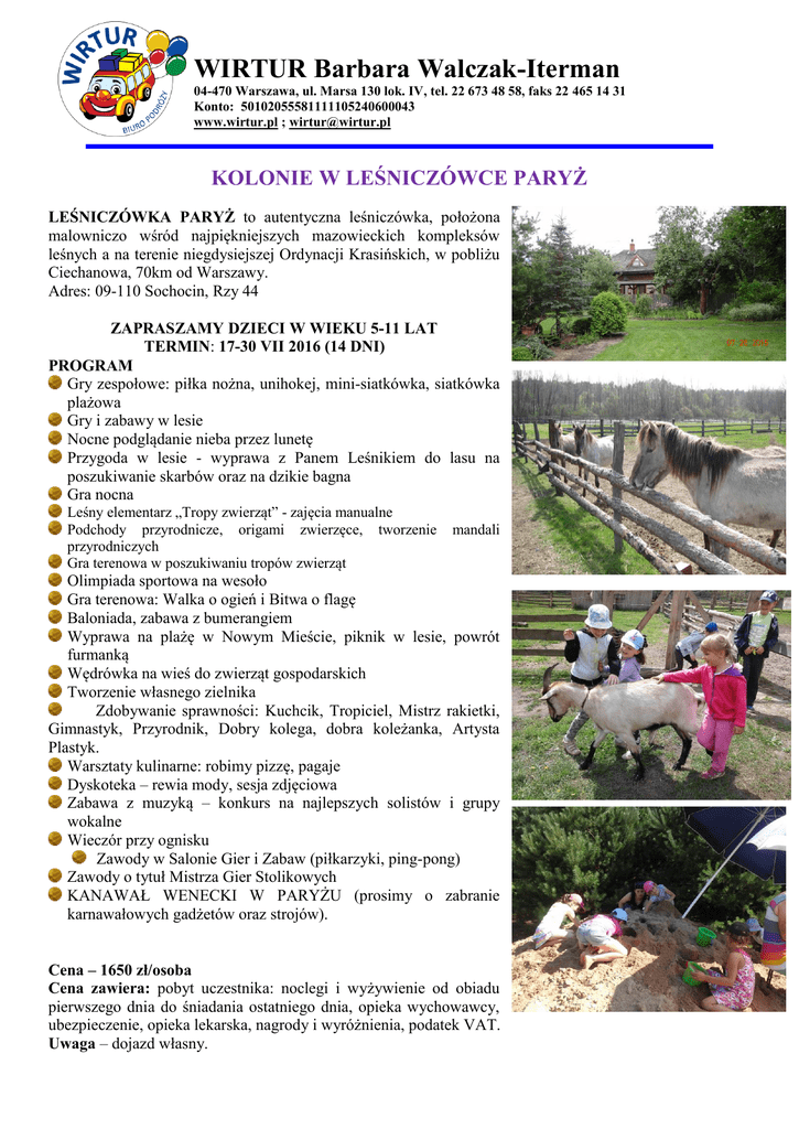 WIRTUR Barbara Walczak-Iterman 04-470 Warszawa, ul. Marsa 130 lok. IV, tel. 22 673 48 58, faks 22 465 14 31 Konto: 50102055581111105240600043 www.wirtur.pl ; [email protected] KOLONIE W LEŚNICZÓWCE PARYŻ LEŚNICZÓWKA PARYŻ to autentyczna leśniczówka, położona malowniczo wśród najpiękniejszych mazowieckich kompleksów leśnych a na terenie niegdysiejszej Ordynacji Krasińskich, w pobliżu Ciechanowa, 70km od Warszawy. Adres: 09-110 Sochocin, Rzy 44 ZAPRASZAMY DZIECI W WIEKU 5-11 LAT TERMIN: 17-30 VII 2016 (14 DNI) PROGRAM Gry zespołowe: piłka nożna, unihokej, mini-siatkówka, siatkówka plażowa Gry i zabawy w lesie Nocne podglądanie nieba przez lunetę Przygoda w lesie - wyprawa z Panem Leśnikiem do lasu na poszukiwanie skarbów oraz na dzikie bagna Gra nocna Leśny elementarz „Tropy zwierząt” - zajęcia manualne Podchody przyrodnicze, origami zwierzęce, tworzenie przyrodniczych Gra terenowa w poszukiwaniu tropów zwierząt mandali Olimpiada sportowa na wesoło Gra terenowa: Walka o ogień i Bitwa o flagę Baloniada, zabawa z bumerangiem Wyprawa na plażę w Nowym Mieście, piknik w lesie, powrót furmanką Wędrówka na wieś do zwierząt gospodarskich Tworzenie własnego zielnika Zdobywanie sprawności: Kuchcik, Tropiciel, Mistrz rakietki, Gimnastyk, Przyrodnik, Dobry kolega, dobra koleżanka, Artysta Plastyk. Warsztaty kulinarne: robimy pizzę, pagaje Dyskoteka – rewia mody, sesja zdjęciowa Zabawa z muzyką – konkurs na najlepszych solistów i grupy wokalne Wieczór przy ognisku Zawody w Salonie Gier i Zabaw (piłkarzyki, ping-pong) Zawody o tytuł Mistrza Gier Stolikowych KANAWAŁ WENECKI W PARYŻU (prosimy o zabranie karnawałowych gadżetów oraz strojów). Cena – 1650 zł/osoba Cena zawiera: pobyt uczestnika: noclegi i wyżywienie od obiadu pierwszego dnia do śniadania ostatniego dnia, opieka wychowawcy, ubezpieczenie, opieka lekarska, nagrody i wyróżnienia, podatek VAT. Uwaga – dojazd własny.