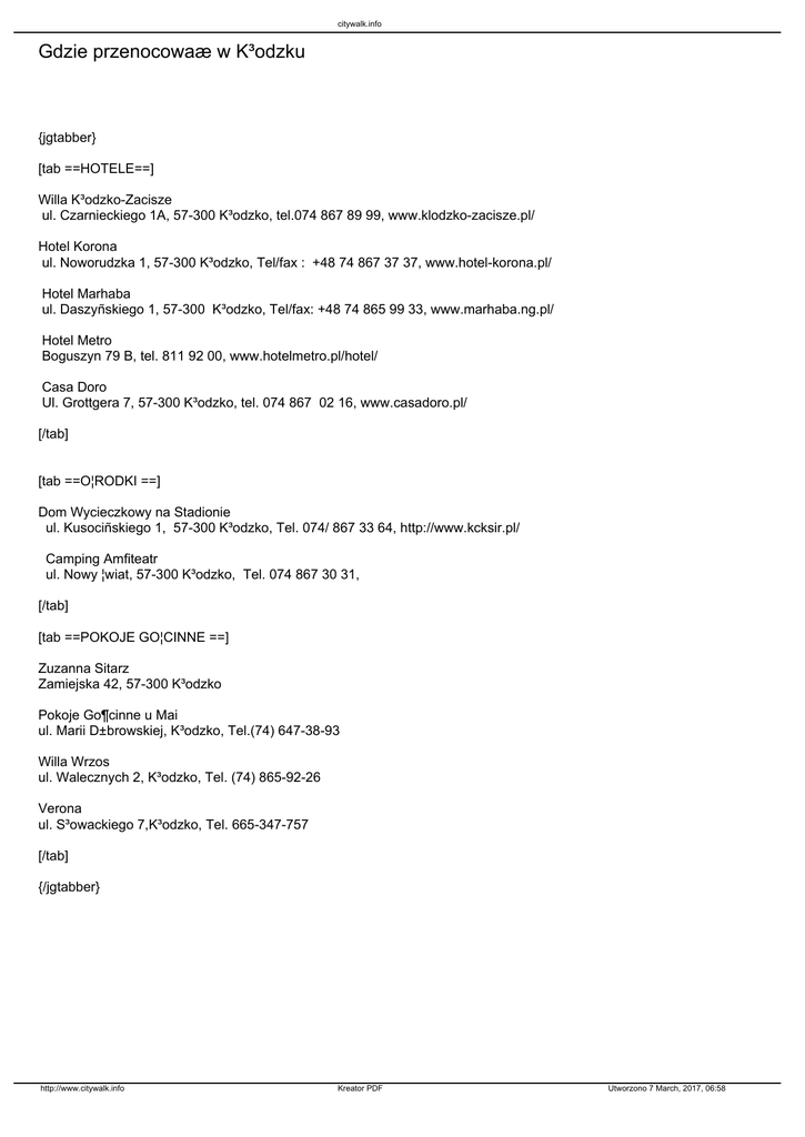 Gdzie przenocowaæ w K³odzku