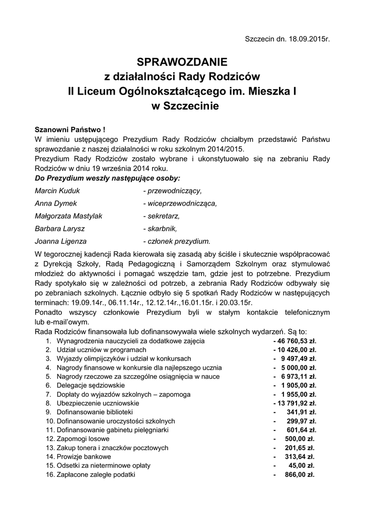 Szczecin dn. 18.09.2015r. SPRAWOZDANIE z działalności Rady Rodziców II Liceum Ogólnokształcącego im. Mieszka I w Szczecinie Szanowni Państwo ! W imieniu ustępującego Prezydium Rady Rodziców chciałbym przedstawić Państwu sprawozdanie z naszej działalności w roku szkolnym 2014/2015. Prezydium Rady Rodziców zostało wybrane i ukonstytuowało się na zebraniu Rady Rodziców w dniu 19 września 2014 roku. Do Prezydium weszły następujące osoby: Marcin Kuduk - przewodniczący, Anna Dymek - wiceprzewodnicząca, Małgorzata Mastylak - sekretarz, Barbara Larysz - skarbnik, Joanna Ligenza - członek prezydium. W tegorocznej kadencji Rada kierowała się zasadą aby ściśle i skutecznie współpracować z Dyrekcją Szkoły, Radą Pedagogiczną i Samorządem Szkolnym oraz stymulować młodzież do aktywności i pomagać wszędzie tam, gdzie jest to potrzebne. Prezydium Rady spotykało się w zależności od potrzeb, a zebrania Rady Rodziców odbywały się po zebraniach szkolnych. Łącznie odbyło się 5 spotkań Rady Rodziców w następujących terminach: 19.09.14r., 06.11.14r., 12.12.14r.,16.01.15r. i 20.03.15r. Ponadto wszyscy członkowie Prezydium byli w stałym kontakcie telefonicznym lub e-mail’owym. Rada Rodziców finansowała lub dofinansowywała wiele szkolnych wydarzeń. Są to: 1. Wynagrodzenia nauczycieli za dodatkowe zajęcia 2. Udział uczniów w programach 3. Wyjazdy olimpijczyków i udział w konkursach 4. Nagrody finansowe w konkursie dla najlepszego ucznia 5. Nagrody rzeczowe za szczególne osiągnięcia w nauce 6. Delegacje sędziowskie 7. Dopłaty do wyjazdów szkolnych – zapomoga 8. Ubezpieczenie uczniowskie 9. Dofinansowanie biblioteki 10. Dofinansowanie uroczystości szkolnych 11. Dofinansowanie gabinetu pielęgniarki 12. Zapomogi losowe 13. Zakup tonera i znaczków pocztowych 14. Prowizje bankowe 15. Odsetki za nieterminowe opłaty 16. Zapłacone zaległe podatki - 46 760,53 zł. - 10 426,00 zł. - 9 497,49 zł. - 5 000,00 zł. - 6 973,11 zł. - 1 905,00 zł. - 1 955,00 zł. - 13 791,92 zł. 341,91 zł. 299,97 zł. 601,64 zł. - 500,00 zł. - 201,65 zł. - 313,64 zł. 45,00 zł. - 866,00 zł. Razem wydatki - 99.478,86 zł Wpływy Rady Rodziców w roku szkolnym 2014/2015 wyniosły: 1. Wpłaty klas I 2. Wpłaty klas II 3. Wpłaty klas III 4. Wpłaty na ubezpieczenie 5. Wpłaty / darowizny dedykowane 6. Darowizny 7. Odsetki bankowe - 32 744,17 zł - 29 768,00 zł - 23 017,00 zł - 17 945,00 zł - 11 426,00 zł. 450,00 zł. 4,74 zł. Razem wpłaty - 115.354,91 zł Prezydium Rady Rodziców przejmując konto i finanse po działalności Rady Rodziców z roku szkolnego 2013/2014 czyli na początku działalności roku szkolnego 2014/2015 dysponowała środkami na koncie w kwocie 17 553,80 zł. Stan konta na początku działalności Rady Rodziców 2014/2015 17 553,80 zł Wpływy + 115 354,91 zł Wydatki - 99 478,86 zł Pozostało: 33 429,85 zł Stan konta na dzień 15.09.2015r. Pogotowie kasowe w sekretariacie szkoły Razem: - 32 163,55 zł. - 1 266,30 zł. 33 429, 85 zł Szczegółowe zestawienie finansowe dołączone do sprawozdania. Ustępujące Prezydium Rady Rodziców w roku szkolnym 2014/2015 starało się gospodarować funduszami Rady w sposób gospodarny i racjonalny czuwając jednocześnie aby zebrane pieniądze były wydawane na najważniejsze potrzeby uczniów i szkoły. Myślę, że nam się to udało. Przedstawiciele Prezydium Rady Rodziców aktywnie uczestniczyli we wszystkich wydarzeniach i uroczystościach szkolnych. Uwagi końcowe: - należy zacieśnić współpracę z rodzicami i nauczycielami. Współpraca taka może mieć pozytywny wpływ na realizację podstawowych zadań Rady Rodziców, do których należy m.in. aktywizowanie ogółu rodziców do czynnego udziału w realizacji nauczania, wychowania i opieki oraz udzielania w tym zakresie pomocy szkole, - członkowie Prezydium Rady Rodziców po wnikliwym i szczegółowym zapoznaniu się z przepisami prawa dla prawidłowego funkcjonowania Rady Rodziców postanowili podjąć działania w celu utworzenia stowarzyszenia działającego przy II LO w Szczecinie. Stosowne działania zostały już podjęte i w dniu dzisiejszym będziemy wspólnie planowali takie stowarzyszenia założyć. Korzystając z okazji pragnę serdecznie podziękować wszystkim członkom ustępującego Prezydium Rady Rodziców oraz całej Radzie Rodziców za obecność na spotkaniach, za zgłaszane propozycje, za dyskusje, za poświęcony czas i pomoc w pracy dla dobra naszych dzieci i szkoły. Pragnę również serdecznie podziękować Dyrekcji szkoły za dobrą współpracę, za to, że wskazywała nam największe potrzeby młodzieży i szkoły. Słowa podziękowania kieruję również pod adresem tych pracowników szkoły, którzy zawsze byli z nami i nigdy nie odmawiali nam swojej pomocy. Szanowni Państwo ! Prezydium Rady Rodziców wnosi o zatwierdzenie powyższego sprawozdania przez Zebranie Plenarne Rady Rodziców i udzielenie absolutorium ustępującemu Prezydium Rady Rodziców. Z wyrazami szacunku Marcin Kuduk Przewodniczący Rady Rodziców