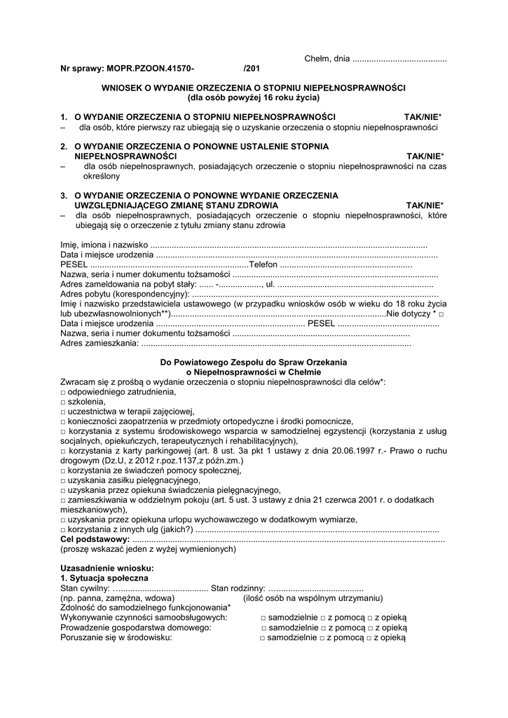 Chełm, dnia ........................................ Nr sprawy: MOPR.PZOON.41570- /201 WNIOSEK O WYDANIE ORZECZENIA O STOPNIU NIEPEŁNOSPRAWNOŚCI (dla osób powyżej 16 roku życia) 1. O WYDANIE ORZECZENIA O STOPNIU NIEPEŁNOSPRAWNOŚCI TAK/NIE* – dla osób, które pierwszy raz ubiegają się o uzyskanie orzeczenia o stopniu niepełnosprawności 2. O WYDANIE ORZECZENIA O PONOWNE USTALENIE STOPNIA NIEPEŁNOSPRAWNOŚCI TAK/NIE* – dla osób niepełnosprawnych, posiadających orzeczenie o stopniu niepełnosprawności na czas określony 3. O WYDANIE ORZECZENIA O PONOWNE WYDANIE ORZECZENIA UWZGLĘDNIAJĄCEGO ZMIANĘ STANU ZDROWIA TAK/NIE* – dla osób niepełnosprawnych, posiadających orzeczenie o stopniu niepełnosprawności, które ubiegają się o orzeczenie z tytułu zmiany stanu zdrowia Imię, imiona i nazwisko ..................................................................................................................... Data i miejsce urodzenia ....................................................................................................................... PESEL ...................................................................Telefon ........................................................ Nazwa, seria i numer dokumentu tożsamości ....................................................................................... Adres zameldowania na pobyt stały: ...... -.................., ul. .................................................................. Adres pobytu (korespondencyjny): ........................................................................................................ Imię i nazwisko przedstawiciela ustawowego (w przypadku wniosków osób w wieku do 18 roku życia lub ubezwłasnowolnionych**)...........................................................................................Nie dotyczy * □ Data i miejsce urodzenia ............................................................... PESEL ........................................... Nazwa, seria i numer dokumentu tożsamości ........................................................................... Adres zamieszkania: .................................................................................................................. Do Powiatowego Zespołu do Spraw Orzekania o Niepełnosprawności w Chełmie Zwracam się z prośbą o wydanie orzeczenia o stopniu niepełnosprawności dla celów*: □ odpowiedniego zatrudnienia, □ szkolenia, □ uczestnictwa w terapii zajęciowej, □ konieczności zaopatrzenia w przedmioty ortopedyczne i środki pomocnicze, □ korzystania z systemu środowiskowego wsparcia w samodzielnej egzystencji (korzystania z usług socjalnych, opiekuńczych, terapeutycznych i rehabilitacyjnych), □ korzystania z karty parkingowej (art. 8 ust. 3a pkt 1 ustawy z dnia 20.06.1997 r.- Prawo o ruchu drogowym (Dz.U, z 2012 r.poz.1137,z późn.zm.) □ korzystania ze świadczeń pomocy społecznej, □ uzyskania zasiłku pielęgnacyjnego, □ uzyskania przez opiekuna świadczenia pielęgnacyjnego, □ zamieszkiwania w oddzielnym pokoju (art. 5 ust. 3 ustawy z dnia 21 czerwca 2001 r. o dodatkach mieszkaniowych), □ uzyskania przez opiekuna urlopu wychowawczego w dodatkowym wymiarze, □ korzystania z innych ulg (jakich?) ....................................................................................................... Cel podstawowy: .................................................................................................................................... (proszę wskazać jeden z wyżej wymienionych) Uzasadnienie wniosku: 1. Sytuacja społeczna Stan cywilny: …..................................... Stan rodzinny: …..................................... (np. panna, zamężna, wdowa) (ilość osób na wspólnym utrzymaniu) Zdolność do samodzielnego funkcjonowania* Wykonywanie czynności samoobsługowych: □ samodzielnie □ z pomocą □ z opieką Prowadzenie gospodarstwa domowego: □ samodzielnie □ z pomocą □ z opieką Poruszanie się w środowisku: □ samodzielnie □ z pomocą □ z opieką 2. Korzystanie ze sprzętu rehabilitacyjnego* □ niezbędne □ wskazane □ zbędne 3. Sytuacja zawodowa Wykształcenie: ................................................................ Zawód wyuczony: ........................................................... Czy aktualnie wykonuje pracę zarobkową* □ tak □ nie Zawód wykonywany** ..................................................... Oświadczam, że*: 1. □ Pobieram/ □ Nie pobieram świadczenia z ubezpieczenia społecznego. Jakie: ......................................................................................................................................................... Od kiedy: .................................................................................................................................................... 2. Aktualnie □ toczy się/ □ nie toczy się w mojej sprawie postępowanie przed innym organem orzeczniczym. Podać jakim: .............................................................................................................................................. 3. □ Składałem/ □ Nie składałem uprzednio wniosku o ustalenie stopnia niepełnosprawności. Jeżeli tak, to kiedy: .............................................................................................................................. Z jakim skutkiem: ................................................................................................................................. Data wydania ostatniego orzeczenia: ................................................. Numer sprawy: ............................ 4. □ Mogę/ □ Nie mogę samodzielnie przybyć na posiedzenie składu orzekającego (jeżeli nie, to należy załączyć zaświadczenie lekarskie potwierdzające niemożność wzięcia udziału w posiedzeniu z powodu długotrwałej i nie rokującej poprawy choroby, uniemożliwiające