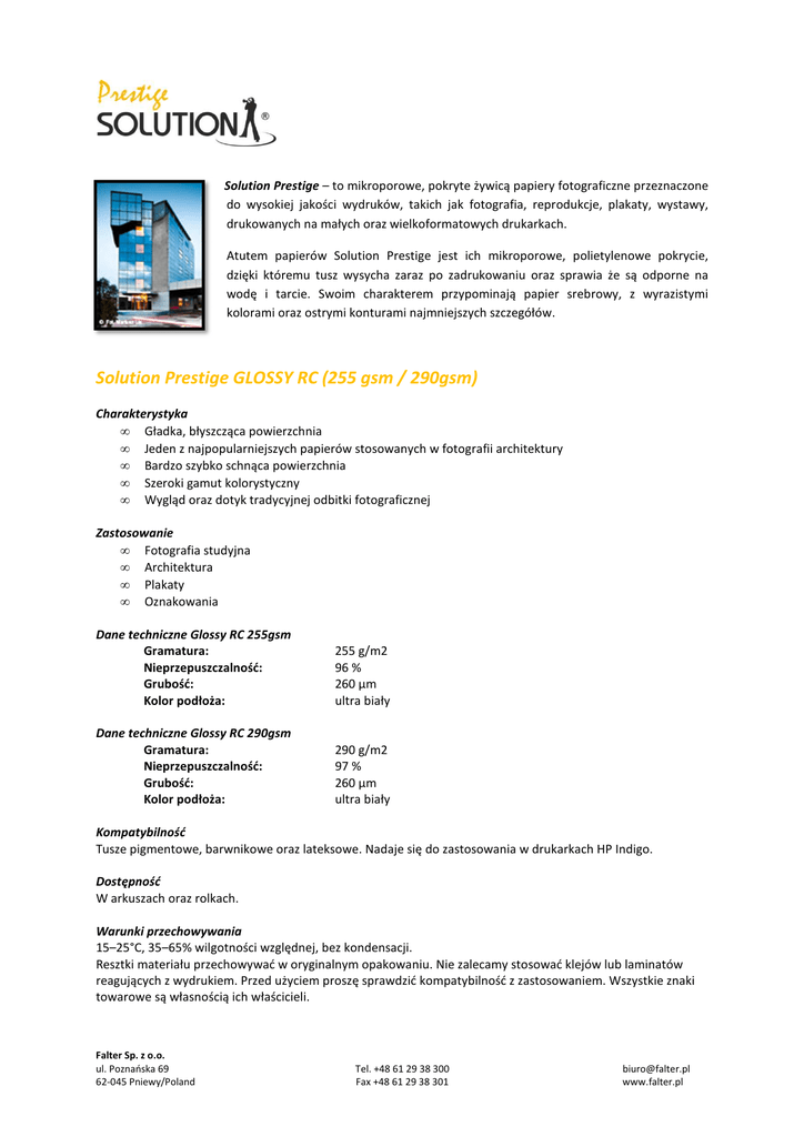 Solution Prestige – to mikroporowe, pokryte żywicą papiery fotograficzne przeznaczone do wysokiej jakości wydruków, takich jak fotografia, reprodukcje, plakaty, wystawy, drukowanych na małych oraz wielkoformatowych drukarkach. Atutem papierów Solution Prestige jest ich mikroporowe, polietylenowe pokrycie, dzięki któremu tusz wysycha zaraz po zadrukowaniu oraz sprawia że są odporne na wodę i tarcie. Swoim charakterem przypominają papier srebrowy, z wyrazistymi kolorami oraz ostrymi konturami najmniejszych szczegółów. Solution Prestige GLOSSY RC (255 gsm / 290gsm) Charakterystyka • Gładka, błyszcząca powierzchnia • Jeden z najpopularniejszych papierów stosowanych w fotografii architektury • Bardzo szybko schnąca powierzchnia • Szeroki gamut kolorystyczny • Wygląd oraz dotyk tradycyjnej odbitki fotograficznej Zastosowanie • Fotografia studyjna • Architektura • Plakaty • Oznakowania Dane techniczne Glossy RC 255gsm Gramatura: Nieprzepuszczalność: Grubość: Kolor podłoża: 255 g/m2 96 % 260 μm ultra biały Dane techniczne Glossy RC 290gsm Gramatura: Nieprzepuszczalność: Grubość: Kolor podłoża: 290 g/m2 97 % 260 μm ultra biały Kompatybilność Tusze pigmentowe, barwnikowe oraz lateksowe. Nadaje się do zastosowania w drukarkach HP Indigo. Dostępność W arkuszach oraz rolkach. Warunki przechowywania 15–25°C, 35–65% wilgotności względnej, bez kondensacji. Resztki materiału przechowywać w oryginalnym opakowaniu. Nie zalecamy stosować klejów lub laminatów reagujących z wydrukiem. Przed użyciem proszę sprawdzić kompatybilność z zastosowaniem. Wszystkie znaki towarowe są własnością ich właścicieli. Falter Sp. z o.o. ul. Poznańska 69 62-045 Pniewy/Poland Tel. +48 61 29 38 300 Fax +48 61 29 38 301 [email protected] www.falter.pl