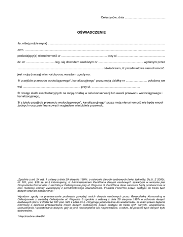 Celestynów, dnia ................................................ OŚWIADCZENIE Ja, niżej podpisany(a) .......................................................................................................................................... zam. ..................................................................................................................................................................... posiadający(a) nieruchomość w ...................................................... przy ul. ....................................................... dz. nr .................................. leg. się dowodem osobistym nr ..................................................... wydanym przez .................................................................................................... oświadczam, iż przedmiotowa nieruchomość jest moją (naszą) własnością oraz wyrażam zgodę na: 1/ przejście przewodu wodociągowego*, kanalizacyjnego* przez moją działkę nr ......................... położoną we wsi .................................................................... przy ul. ......................................................... 2/ dostęp służb eksploatacyjnych na moją działkę w celu konserwacji lub awarii przewodu wodociągowego i kanalizacyjnego, 3/ z tytułu przejścia przewodu wodociągowego*, kanalizacyjnego* przez moją nieruchomość nie będę wnosił żadnych roszczeń finansowych względem właściciela przewodu. „Zgodnie z art. 24 ust. 1 ustawy z dnia 29 sierpnia 1997r. o ochronie danych osobowych (tekst jednolity: Dz.U. Z 2002r. Nr 101, poz. 926 ze zm.) informujemy, iż Administratorem Pani/Pana danych osobowych zawartych w wniosku jest Gospodarka Komunalna z siedzibą w Celestynowie przy ul. Regucka 5. Pani/Pana dane osobowe będą przetworzone w celu realizacji umowy wynikającej z przedmiotowego oświadczenia. Posiada Pani/Pan prawo dostępu do treści tych danych oraz ich poprawienia.” Wyrażam zgodę na przetwarzanie podanych powyżej moich danych osobowych przez Gospodarkę Komunalną w Celestynowie z siedzibą Celestynów ul. Regucka 5 zgodnie z ustawą z dnia 29 sierpnia 1997r o ochronie danych osobowych (Dz.U z 2002r Nr 101 poz. 926 z późn.zm.). Przyjmuję jednocześnie do wiadomości, ze mam prawo żądania informacji o zakresie przetwarzania moich danych osobowych, prawo dostępu do treści tych danych, uzupełniania, uaktualniania i sprostowania danych, gdy są one niekompletne lub nieprawdziwe, a także, że podanie tych danych było dobrowolne. *niepotrzebne skreślić